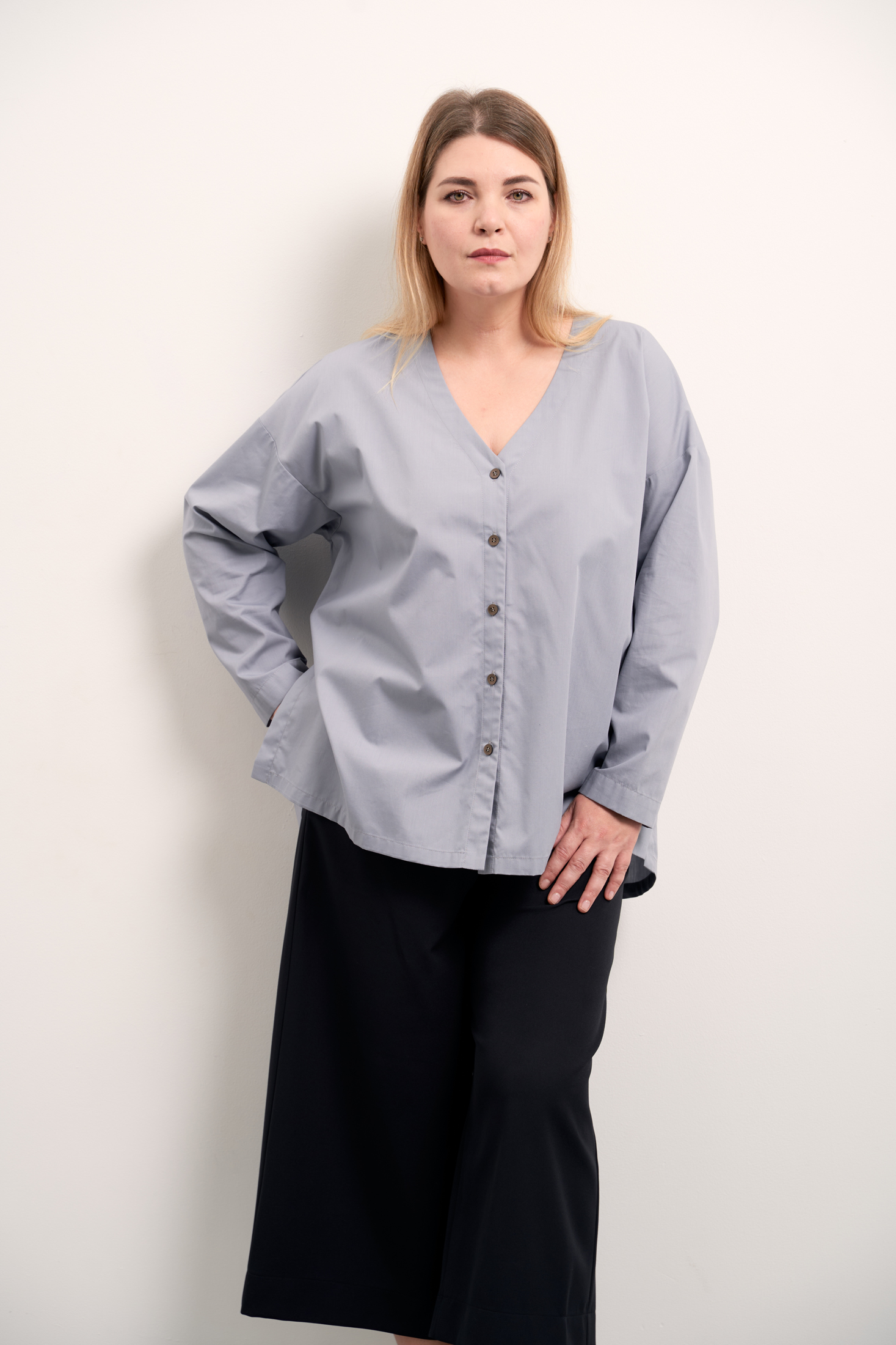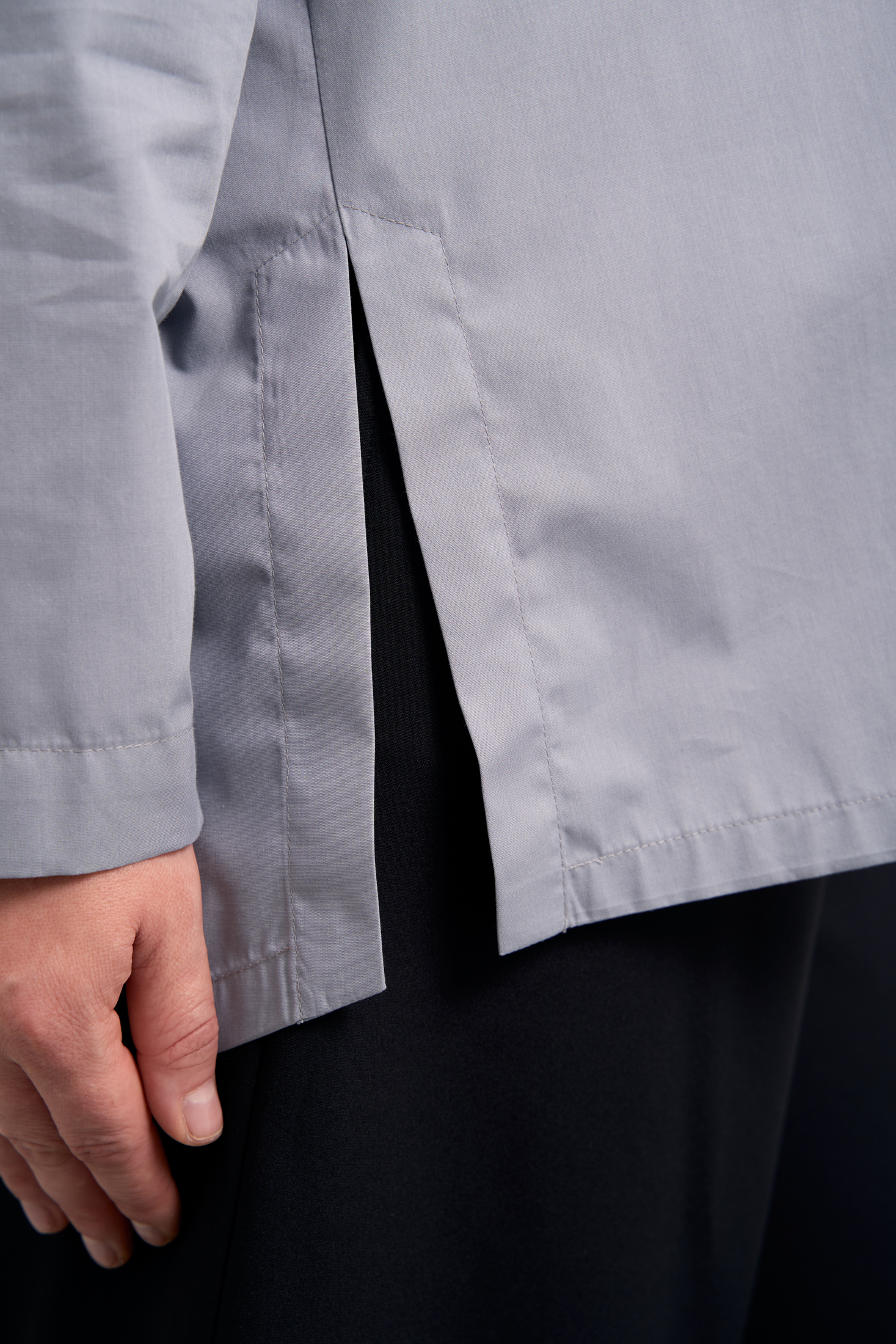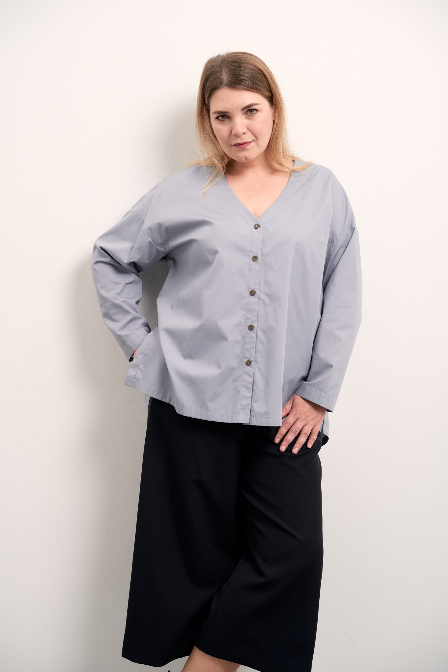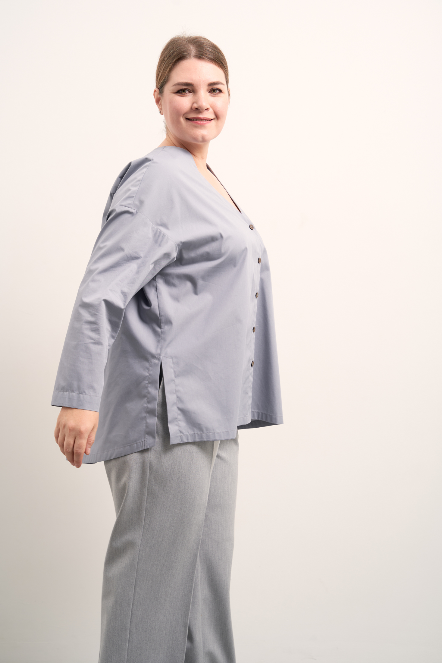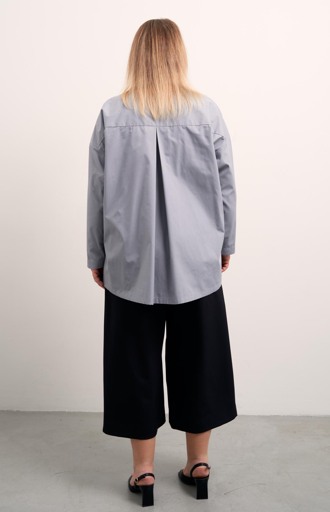 Рубашка А-образного силуэта без воротника. Вырез горловины V-образный. Рукава спущенные, длинные. На спинке отрезная кокетка и встречная складка. Низ оформлен плавной линией с удлинением по спинке. В боковых швах высокие разрезы. Застегивается рубашка на петли и пуговицы. Выполнена из ткани с высоким содержанием хлопка в сером и черном цветах.