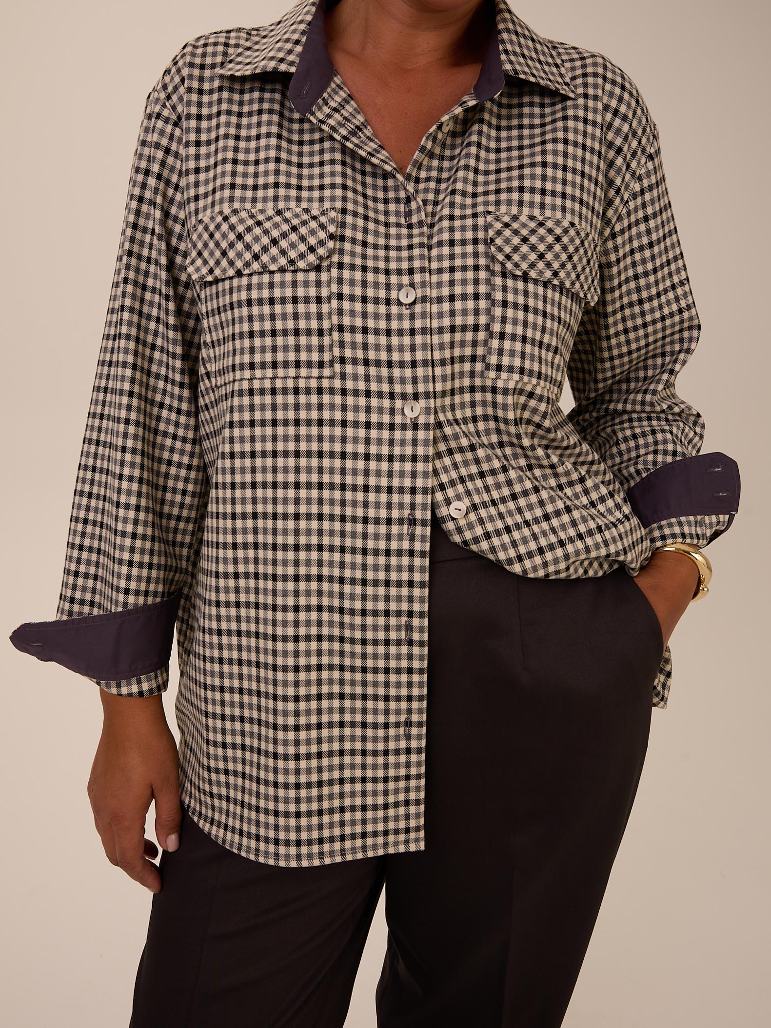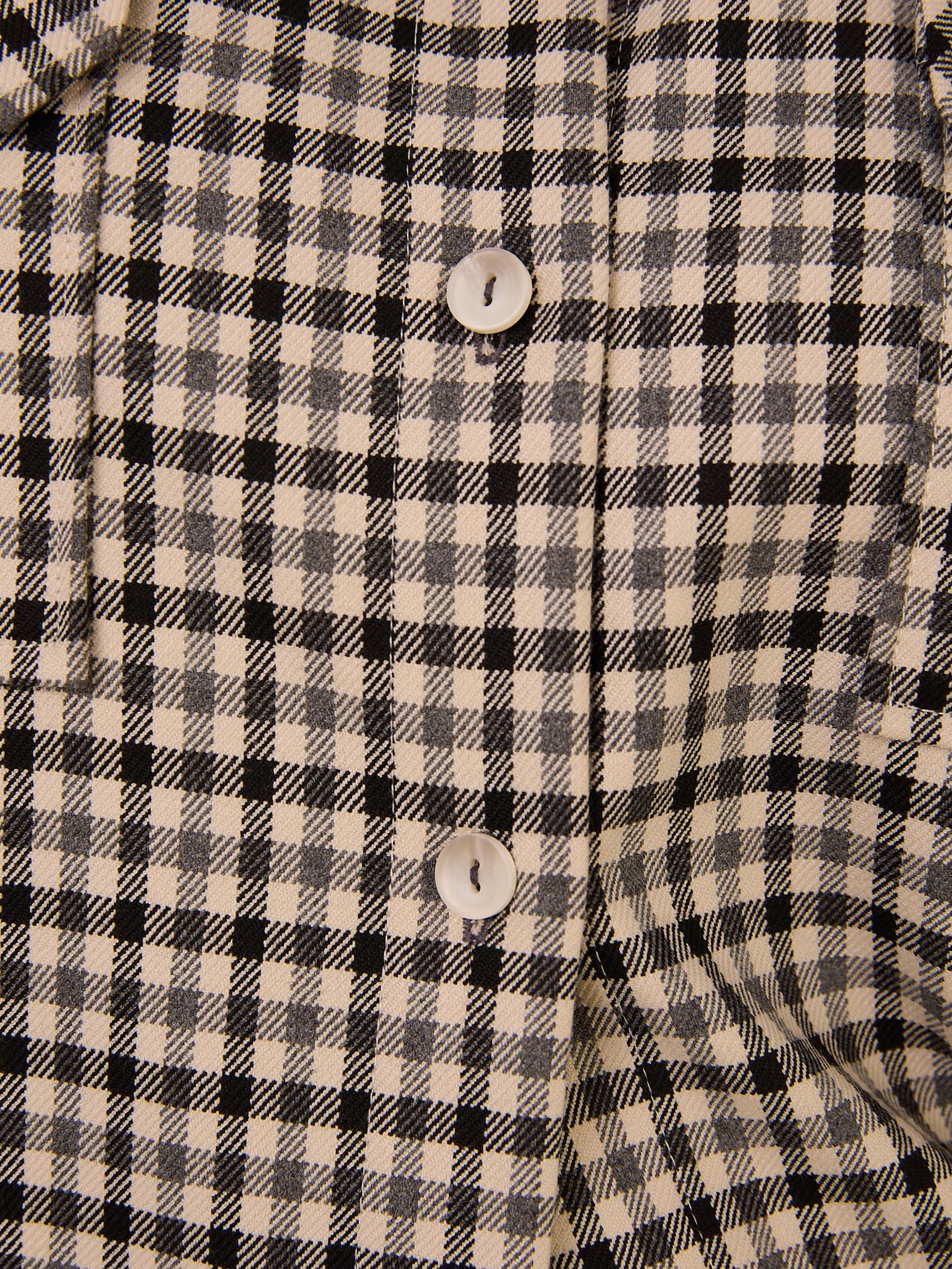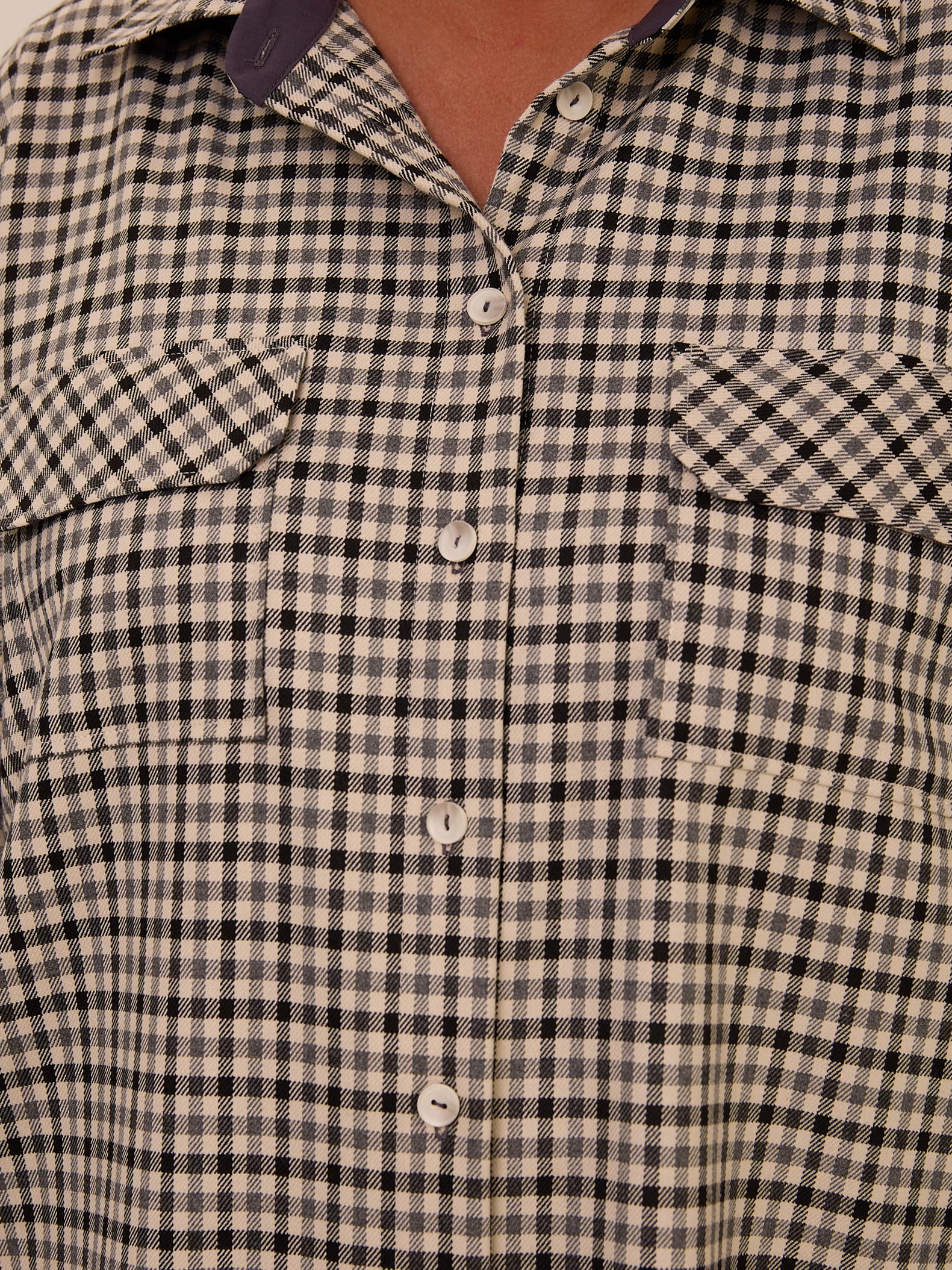Рубашка прямого кроя со спущенным плечевым поясом. Воротник отложной на стойке. Рукава с манжетами. Нагрудные карманы накладные с клапанами. Низ изделия оформлен плавной линией с закругленными разрезами. Рубашка застегивается на петли и пуговицы. Выполнена из мягкой поливискозной клетчатой ткани в двух цветах с отделкой в тон: бежево-коричневый и серо-черный.