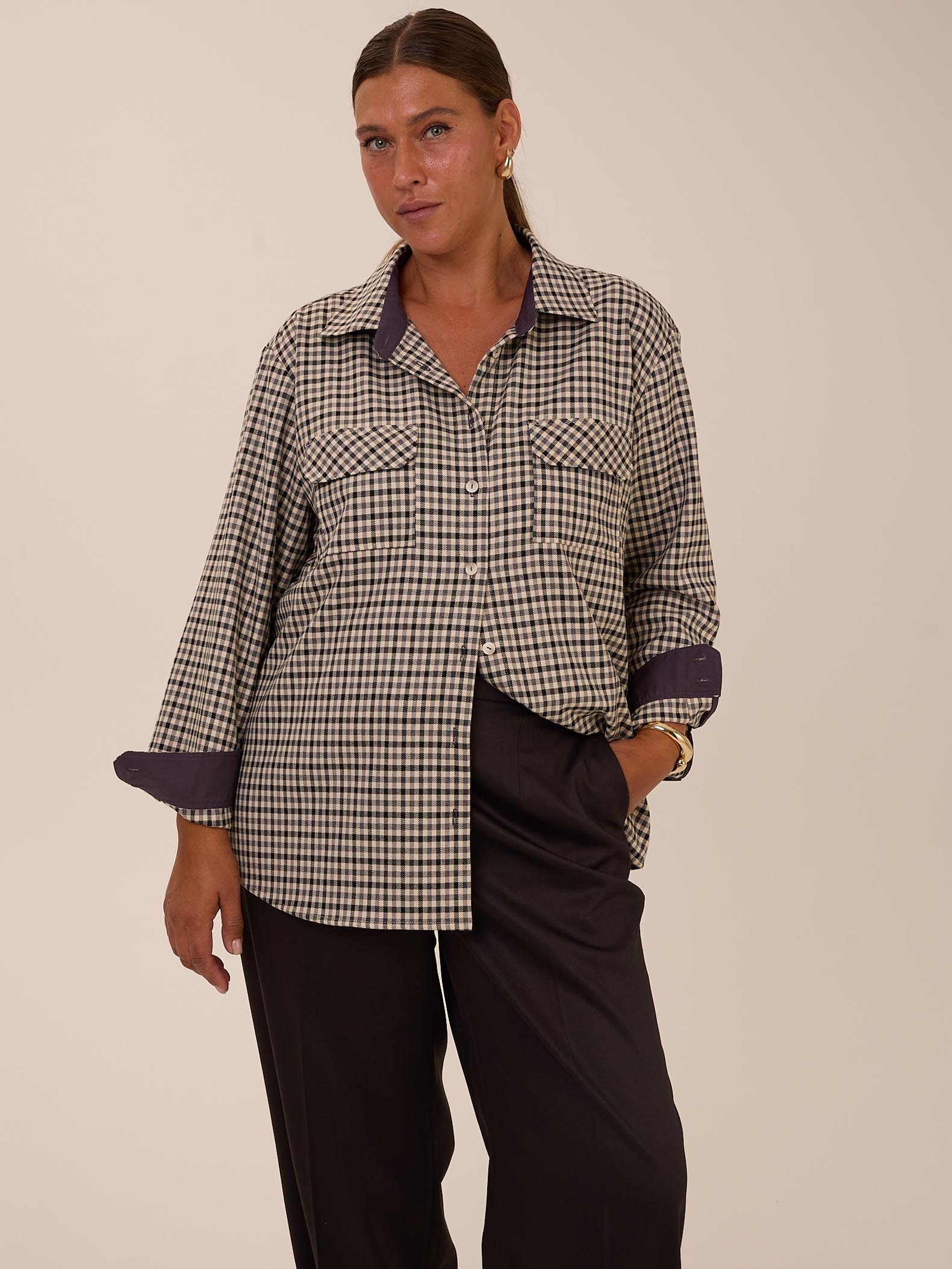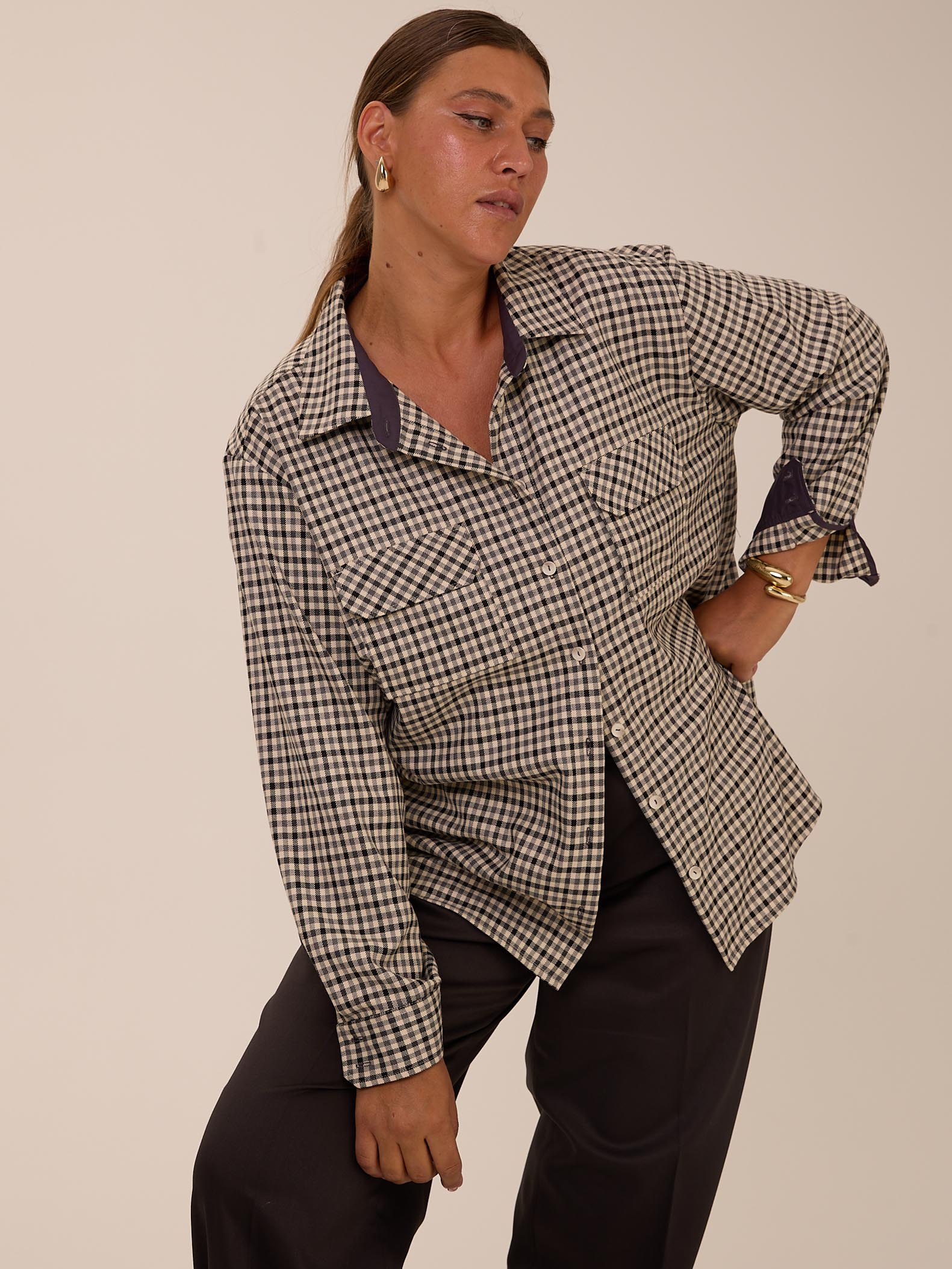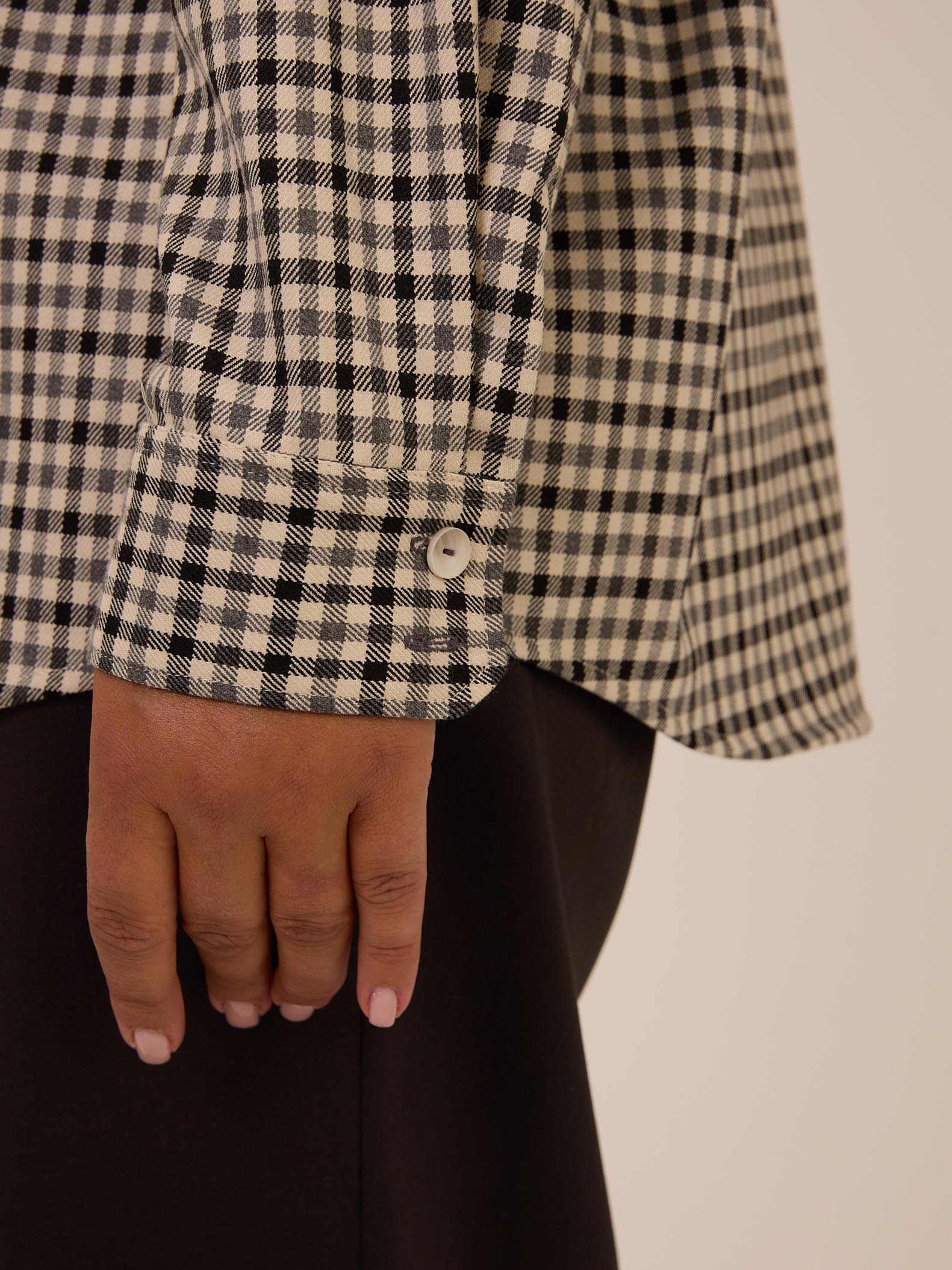 Рубашка прямого кроя со спущенным плечевым поясом. Воротник отложной на стойке. Рукава с манжетами. Нагрудные карманы накладные с клапанами. Низ изделия оформлен плавной линией с закругленными разрезами. Рубашка застегивается на петли и пуговицы. Выполнена из мягкой поливискозной клетчатой ткани в двух цветах с отделкой в тон: бежево-коричневый и серо-черный.