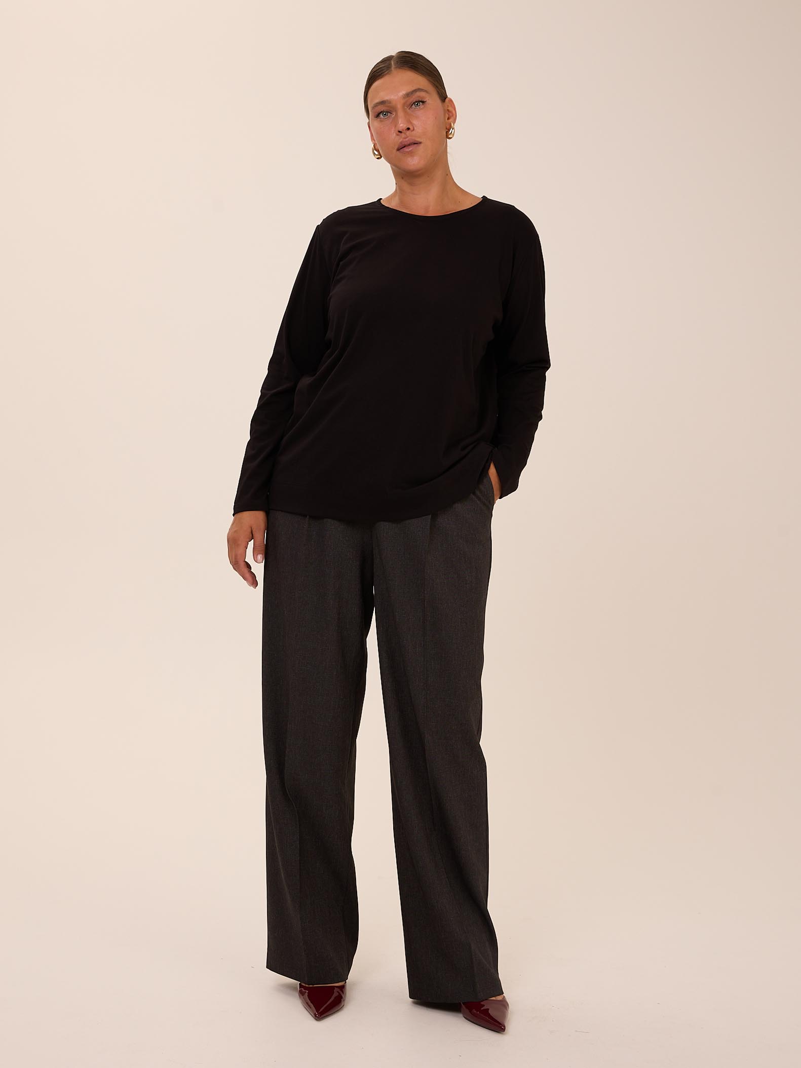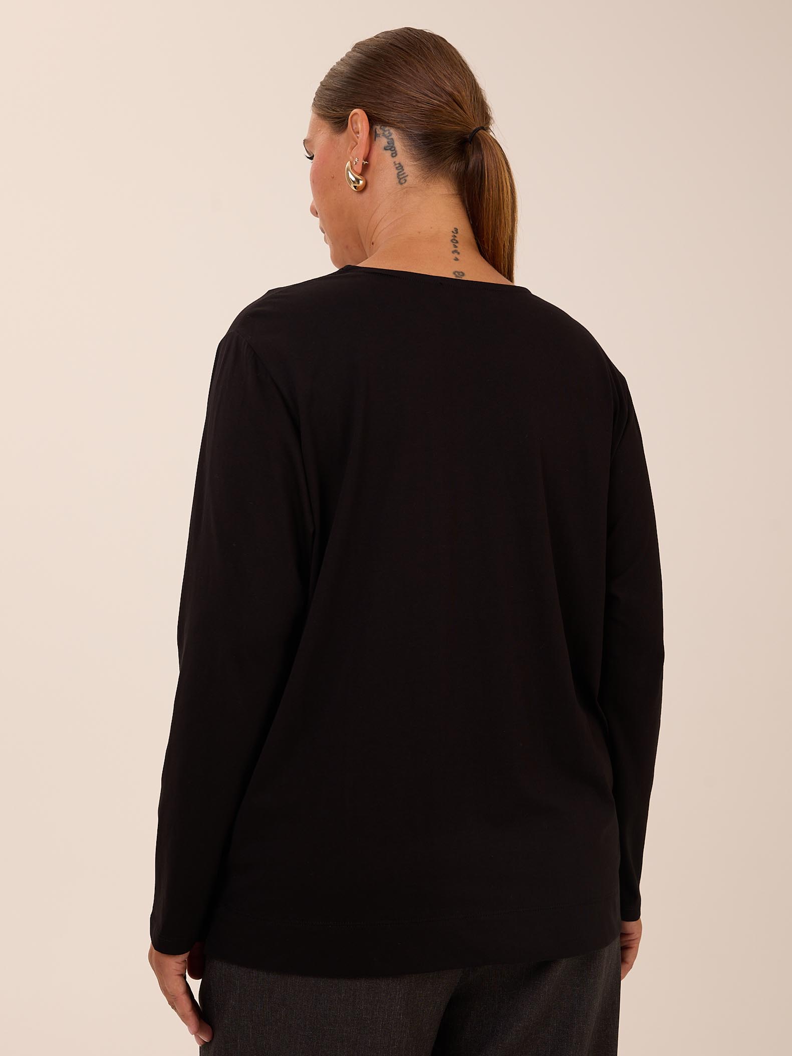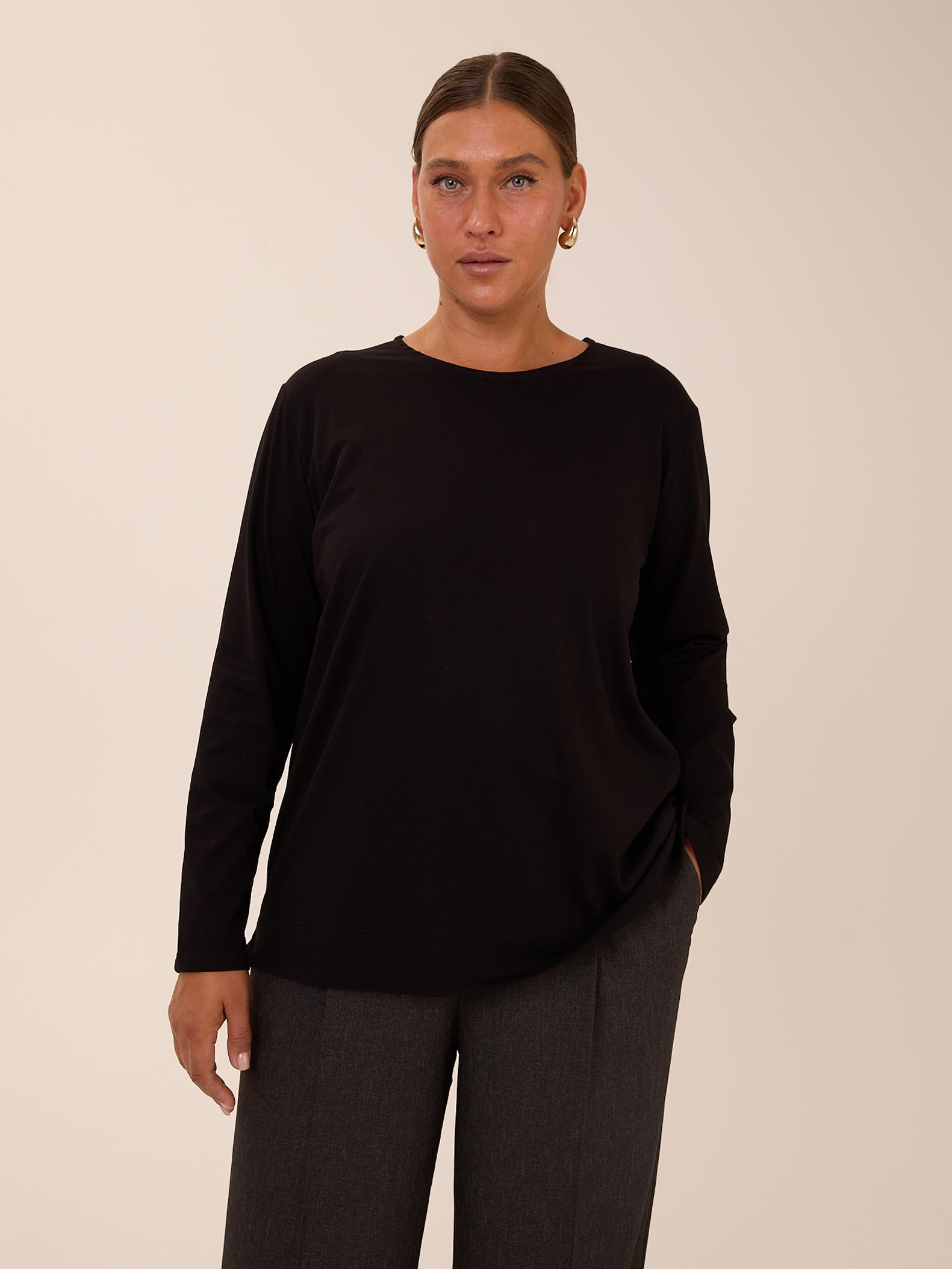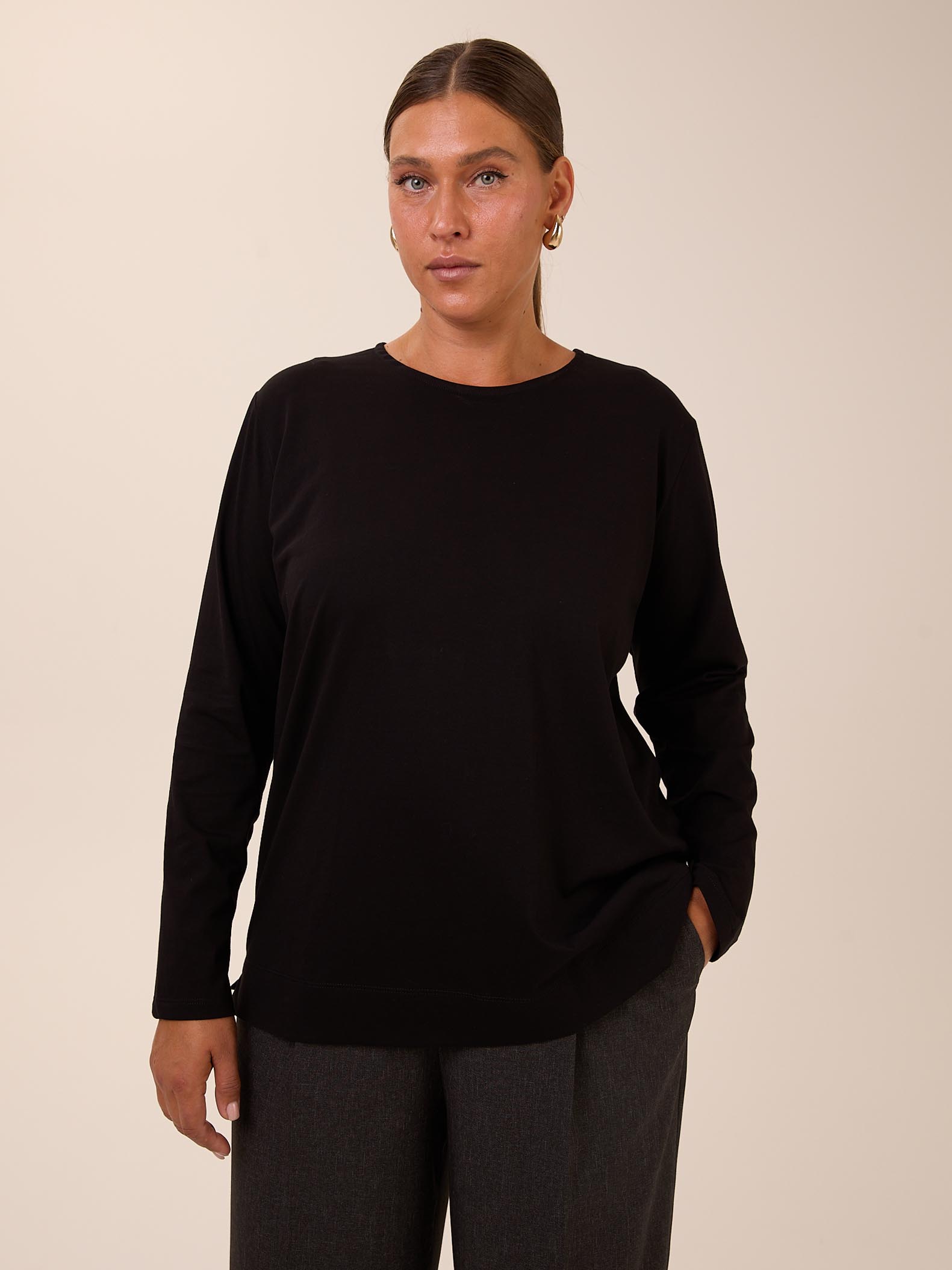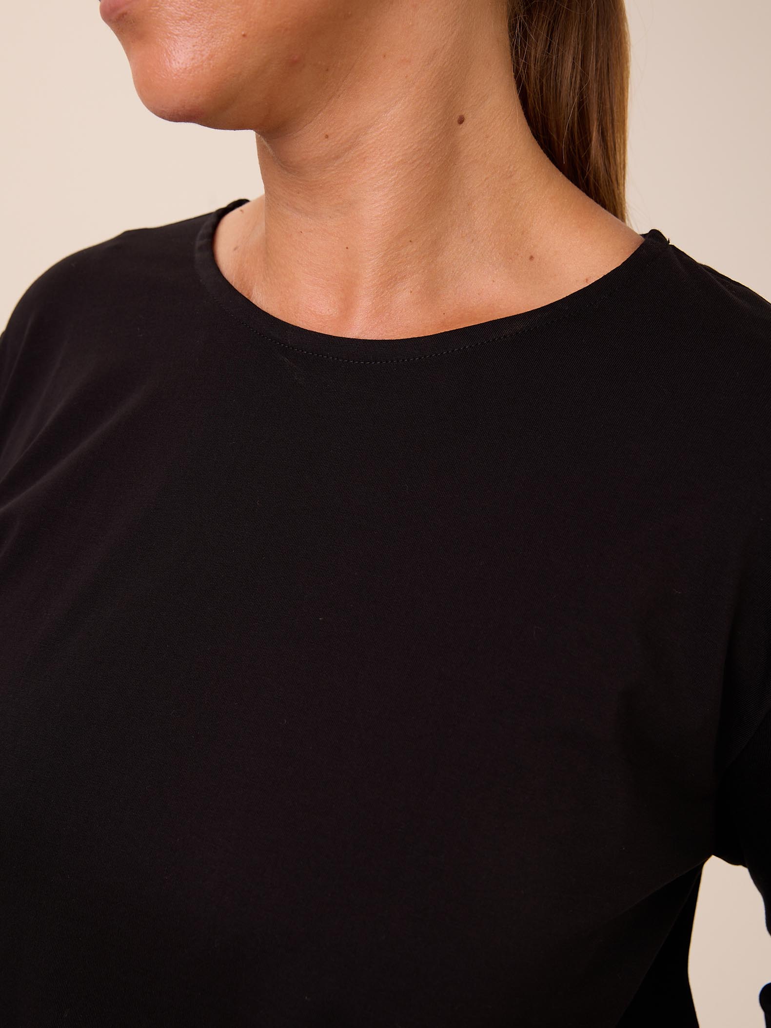 Базовый свитшот прямого кроя с длинными рукавами. Вырез горловины круглый. В боковых швах небольшие разрезы. Выполнен из хлопкового трикотажа в черном и темно-бежевом цвете.
