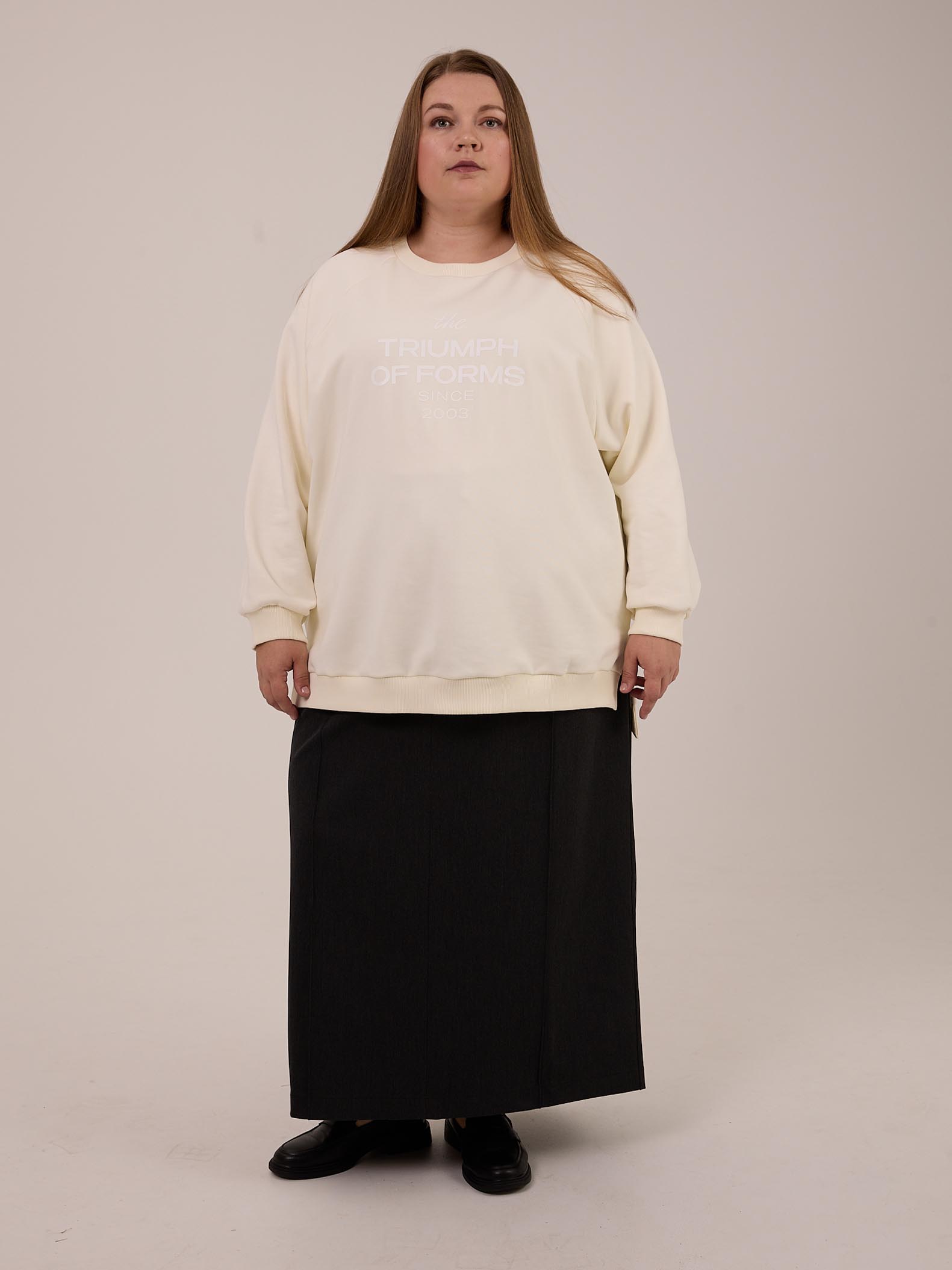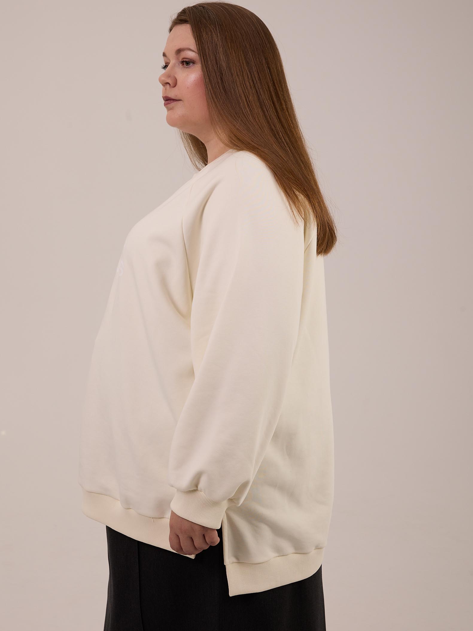 Объемный свитшот оверсайз. Рукава реглан с трикотажными манжетами. Вырез горловины круглый с трикотажной горловиной. В боковых швах выполнены небольшие разрезы. Низ изделия выполнен на трикотажном поясе. Спинка изделия немного длиннее переда. На полочке - принт. Свитшот выполнен из хлопкового футера в трех цветах: молочном, черном и коричневом.