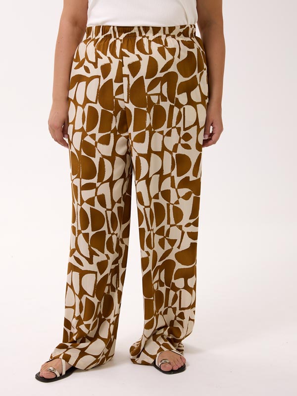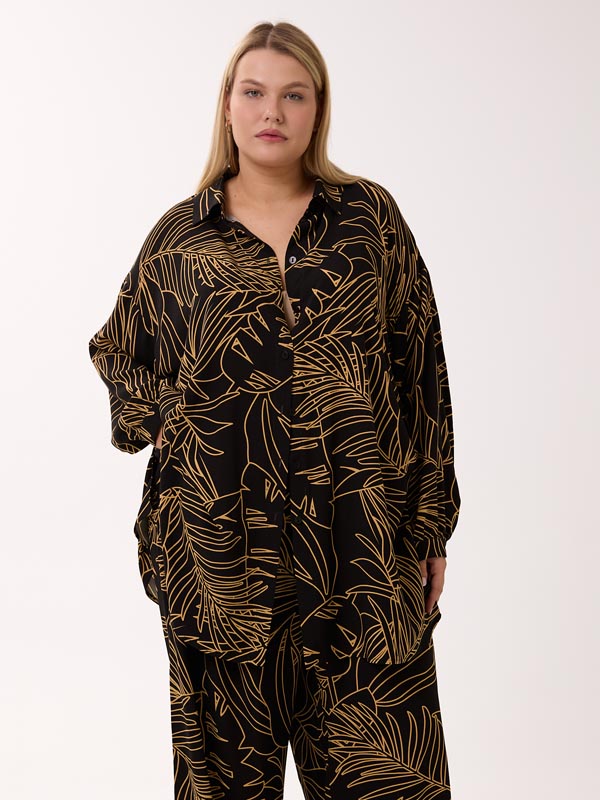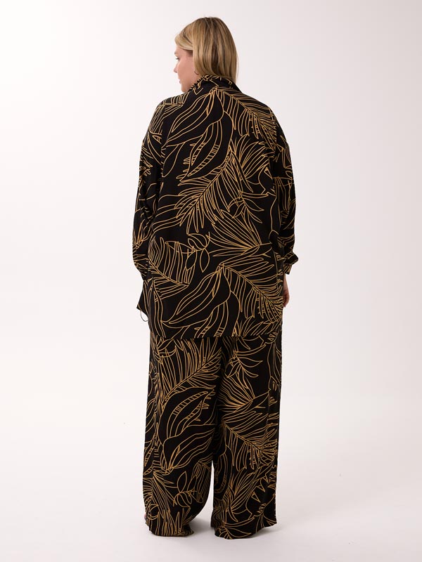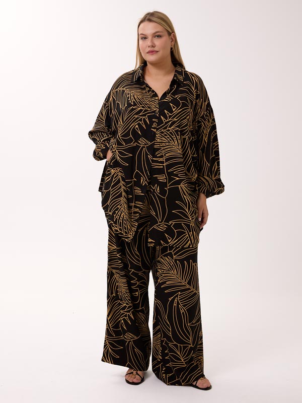 Легкий струящийся костюм, который состоит из брюк и рубашки. Брюки свободные в области бедер, широкие по всей длине. Пояс с эластичной тесьмой внутри, для дополнительной фиксации предусмотрен шнурок. Карманы на брюках выполнены в боковых швах. Рубашка объемная, со спущенным плечевым поясом. Воротник рубашечный, стояче-отложной. Рукава с манжетами. В боковых швах высокие разрезы и кулиска со шнурком, для моделирования нового образа с драпировками. Застежка-пуговицы. Костюм выполнен из вискозной ткани в трех принтах: черный/бежевый, молочный/коричневый, молочный/бежевый.