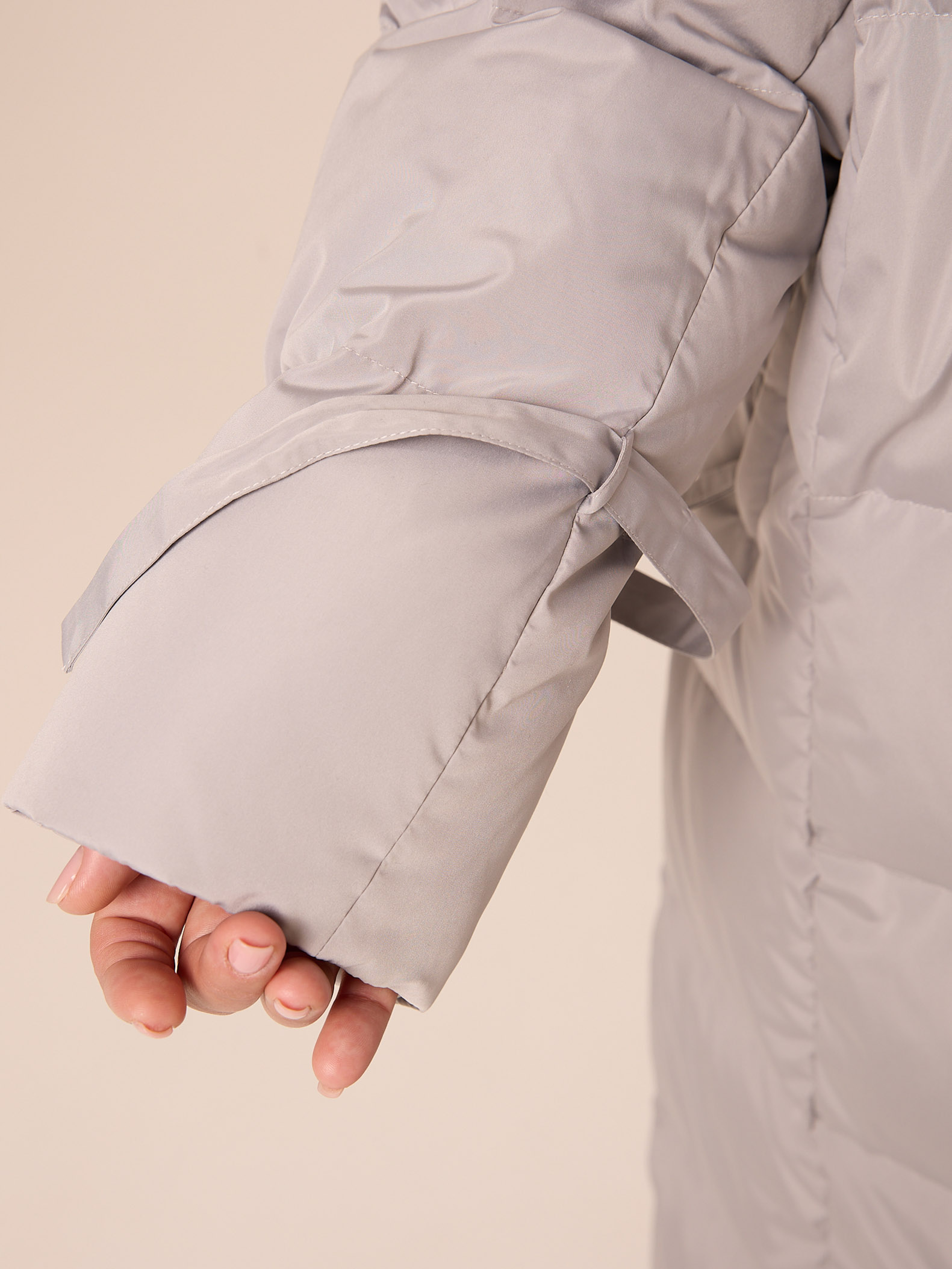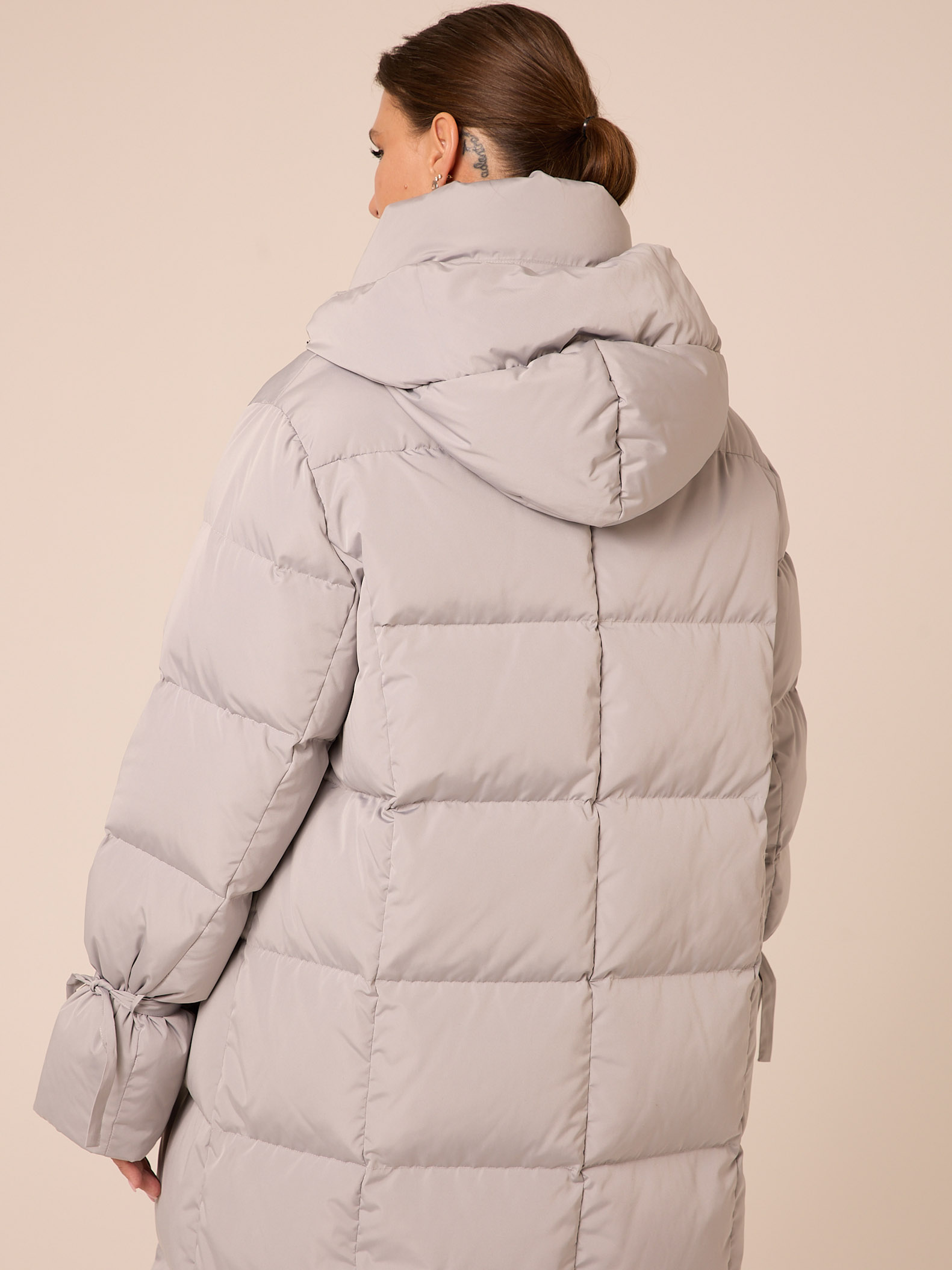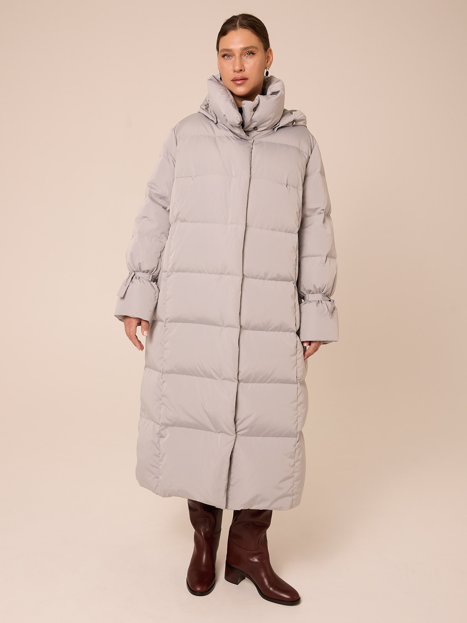 Натуральный пух 90/перо10 (170гр/м2) FP 650+. Длинное пальто прямого силуэта. Воротник- высокая стойка. Капюшон съемный. Плечевой пояс немного спущен. По низу рукавов выполнены декоративные паты-ленты для регулировки объема. Боковые карманы прорезные с узкой листочкой, застегиваются на молнию. Нагрудная вытачка обеспечит хорошую посадку. По низу изделия выполнена кулиска с регулируемой резинкой. Пуховик застегивается на внутреннюю молнию и кнопки. Изделие выполнено из курточной ткани с водоотталкивающей пропиткой в двух цветах: св. сером и т. сером.