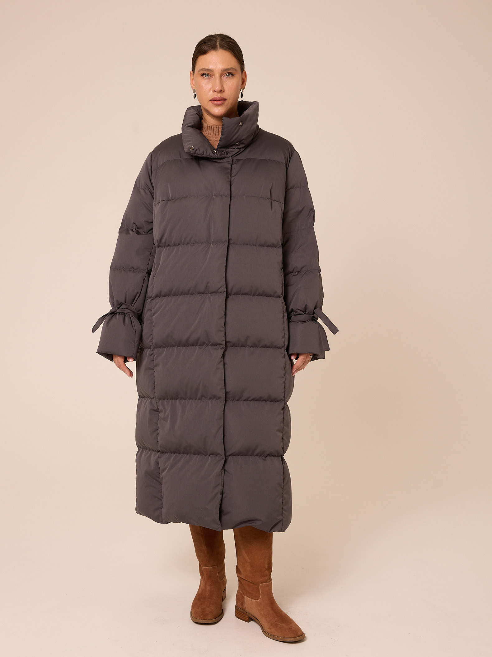 Натуральный пух 90/перо10 (170гр/м2) FP 650+. Длинное пальто прямого силуэта. Воротник- высокая стойка. Капюшон съемный. Плечевой пояс немного спущен. По низу рукавов выполнены декоративные паты-ленты для регулировки объема. Боковые карманы прорезные с узкой листочкой, застегиваются на молнию. Нагрудная вытачка обеспечит хорошую посадку. По низу изделия выполнена кулиска с регулируемой резинкой. Пуховик застегивается на внутреннюю молнию и кнопки. Изделие выполнено из курточной ткани с водоотталкивающей пропиткой в двух цветах: св. сером и т. сером.