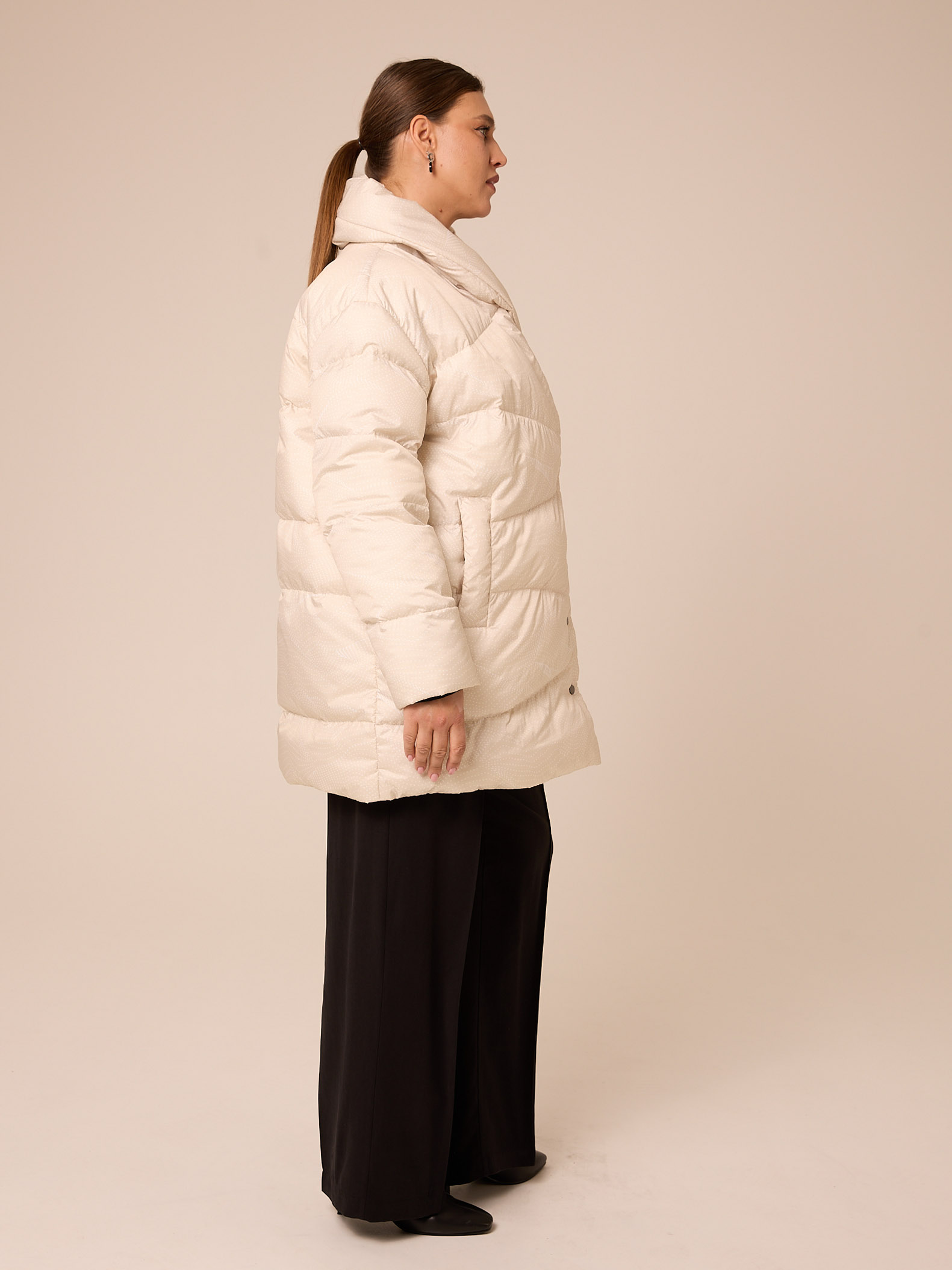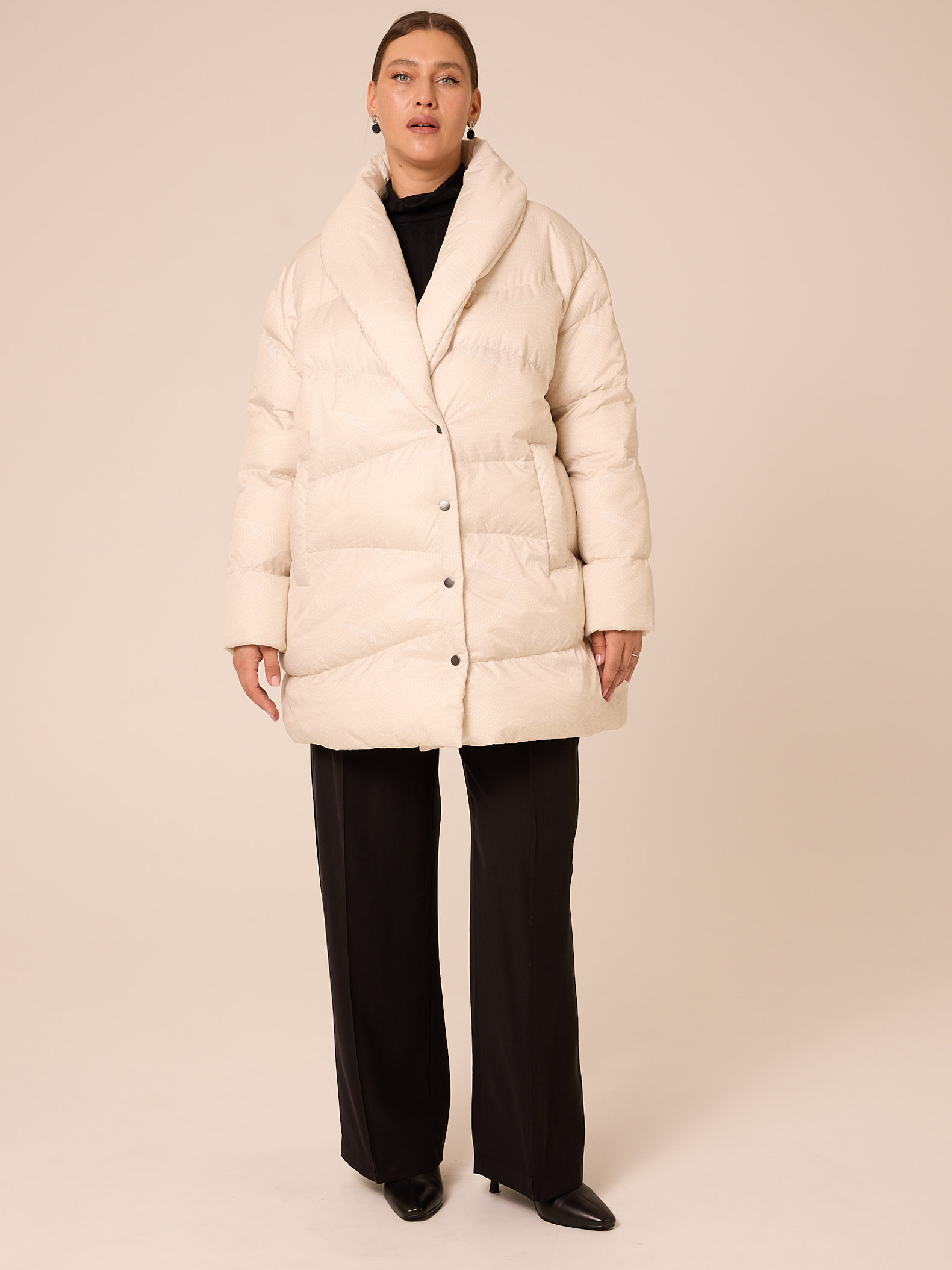 Утеплитель лебяжий синтепух 120гр/м2 + термофин 60гр/м2. Куртка А-образного силуэта, с шалевидным воротником. Длина изделия до середины бедра. Плечевой пояс спущенный. Боковые карманы прорезные с листочками. На куртке выполнена ассиметричная стежка. Застегивается изделие на кнопки. Выполнена из курточной ткани с водоотталкивающей пропиткой в трех цветах: молочном, синем, принт бордовый