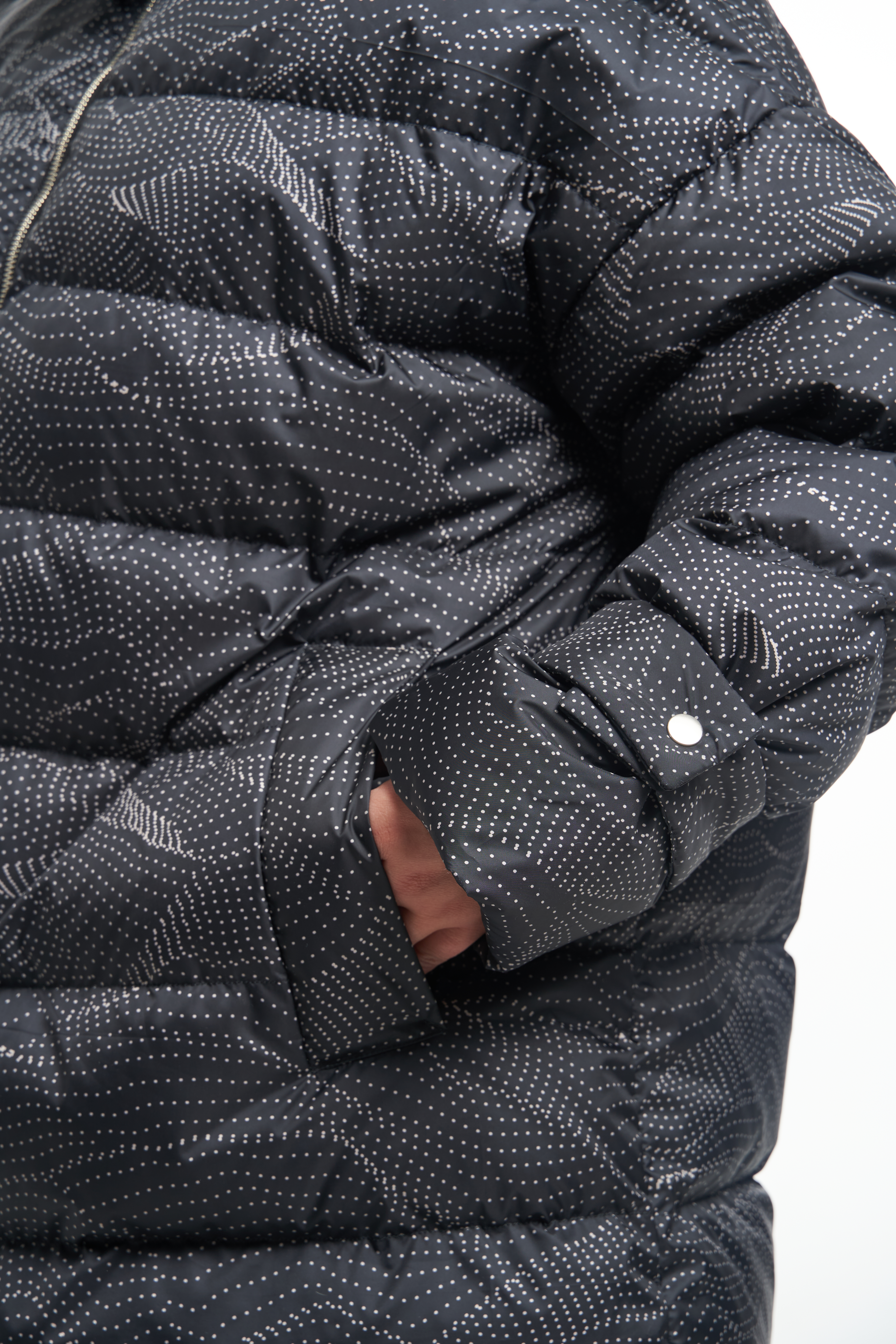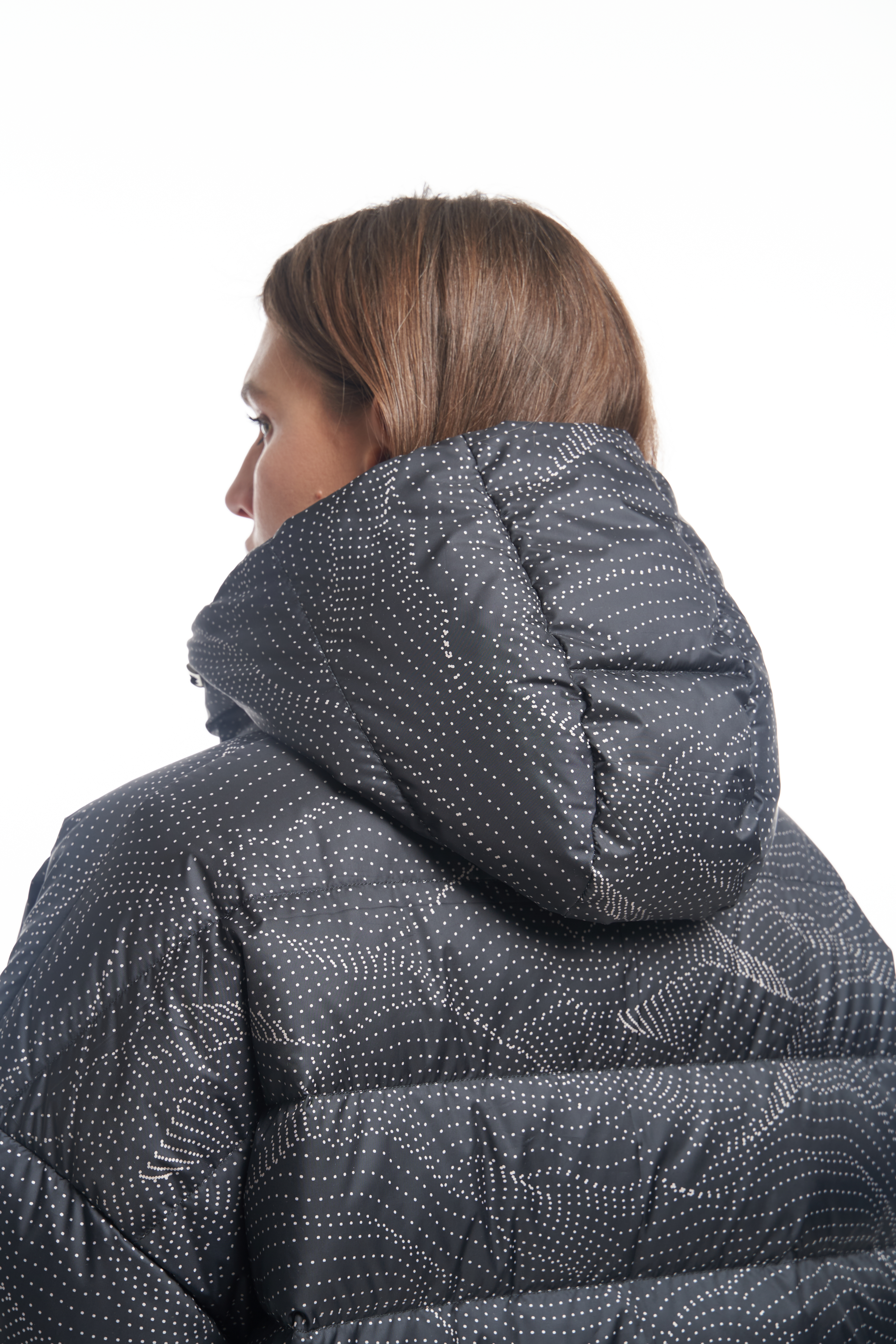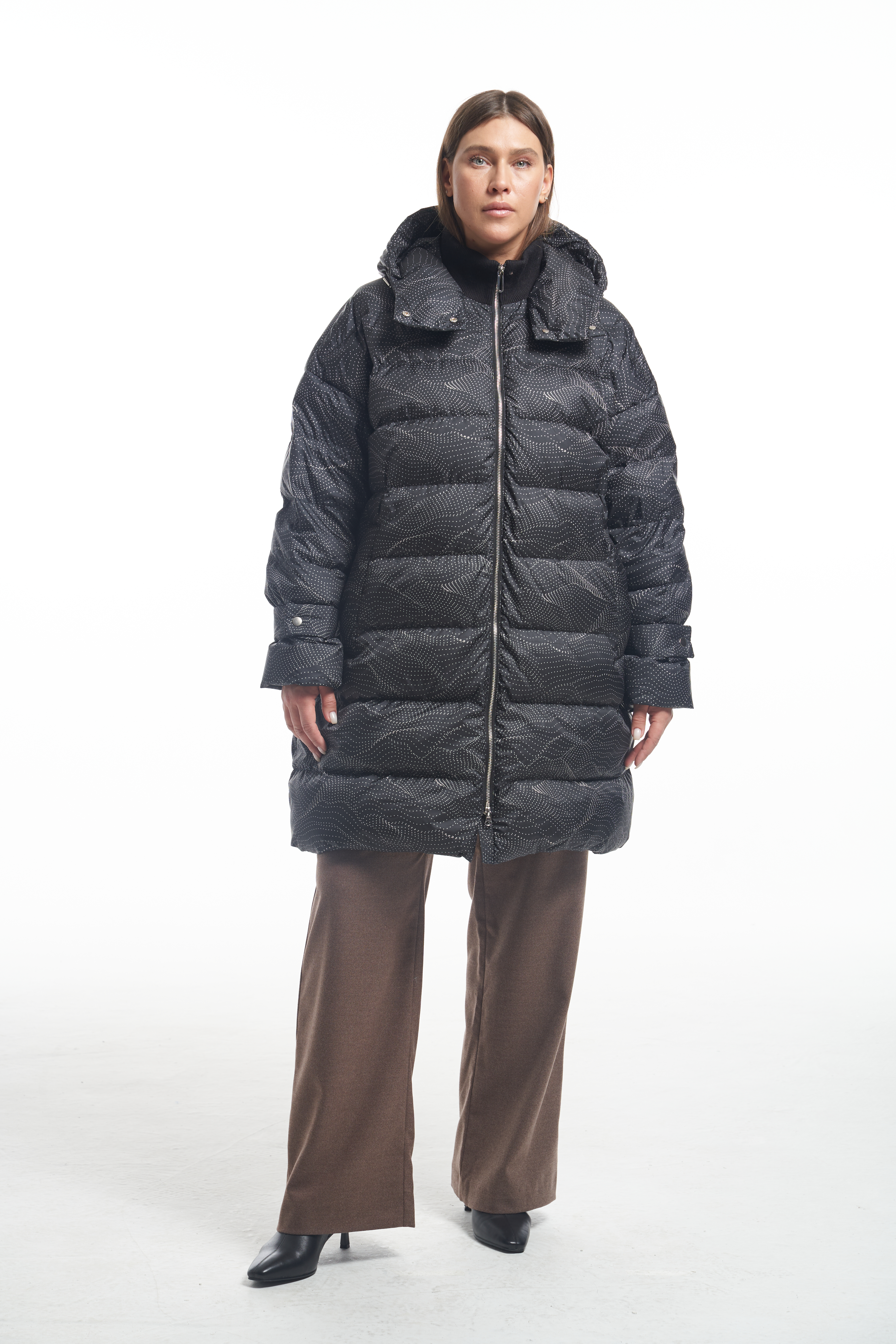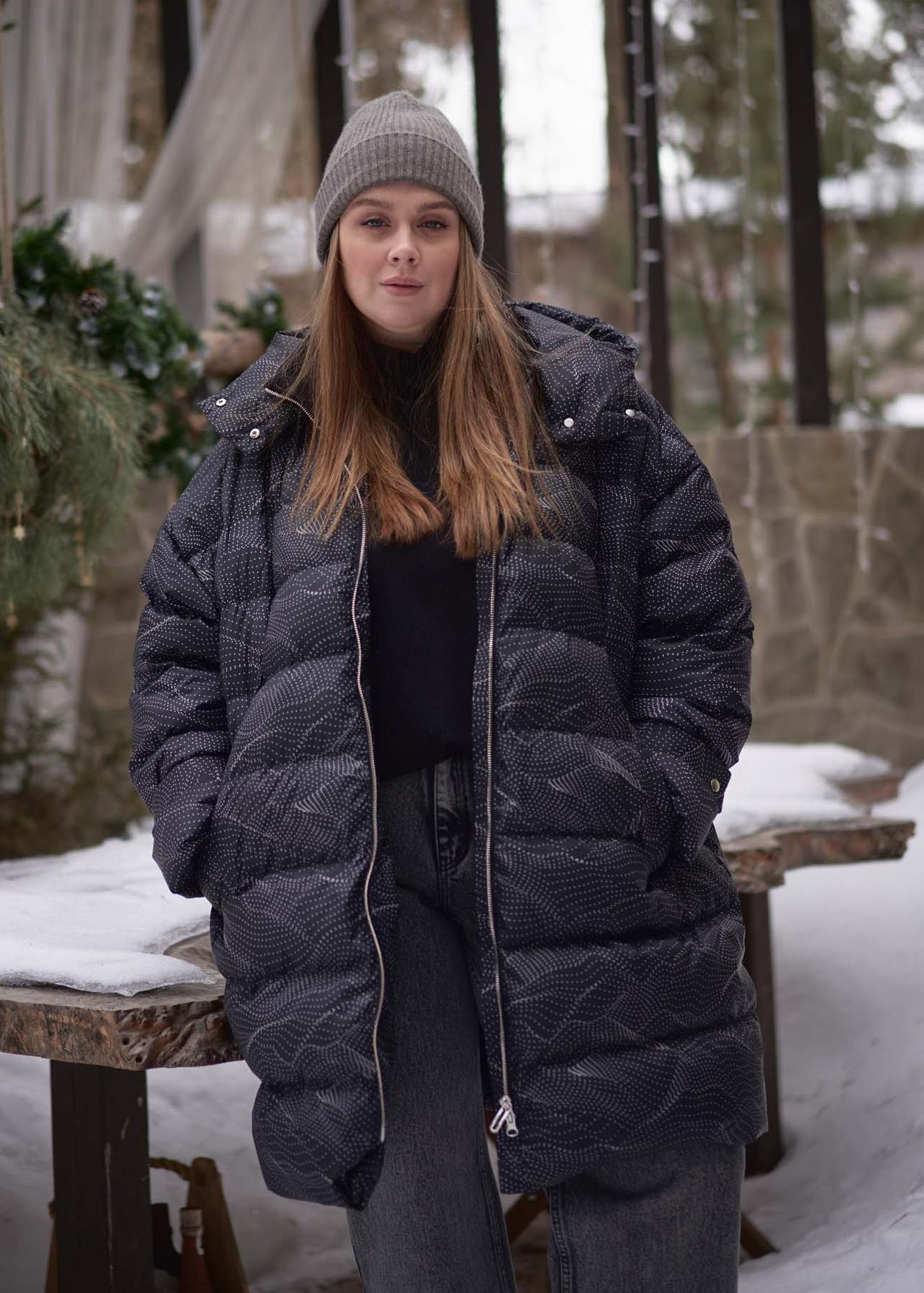 Удлиненная куртка А-образного силуэта со спущенным плечевым поясом. Особенностью данной модели является втачной капюшон вместе с трикотажным воротником. Боковые карманы прорезные с листочками. Рукава с регулируемыми, съемными патами. Куртка застегивается на металлическую молнию, капюшон и паты на декоративные кнопки. Длина изделия чуть выше колен. По низу изделия выполнена кулиска с регулируемой резинкой. Есть внутренний накладной карман на подкладке. При изготовлении применяется двухслойный пухпакет.