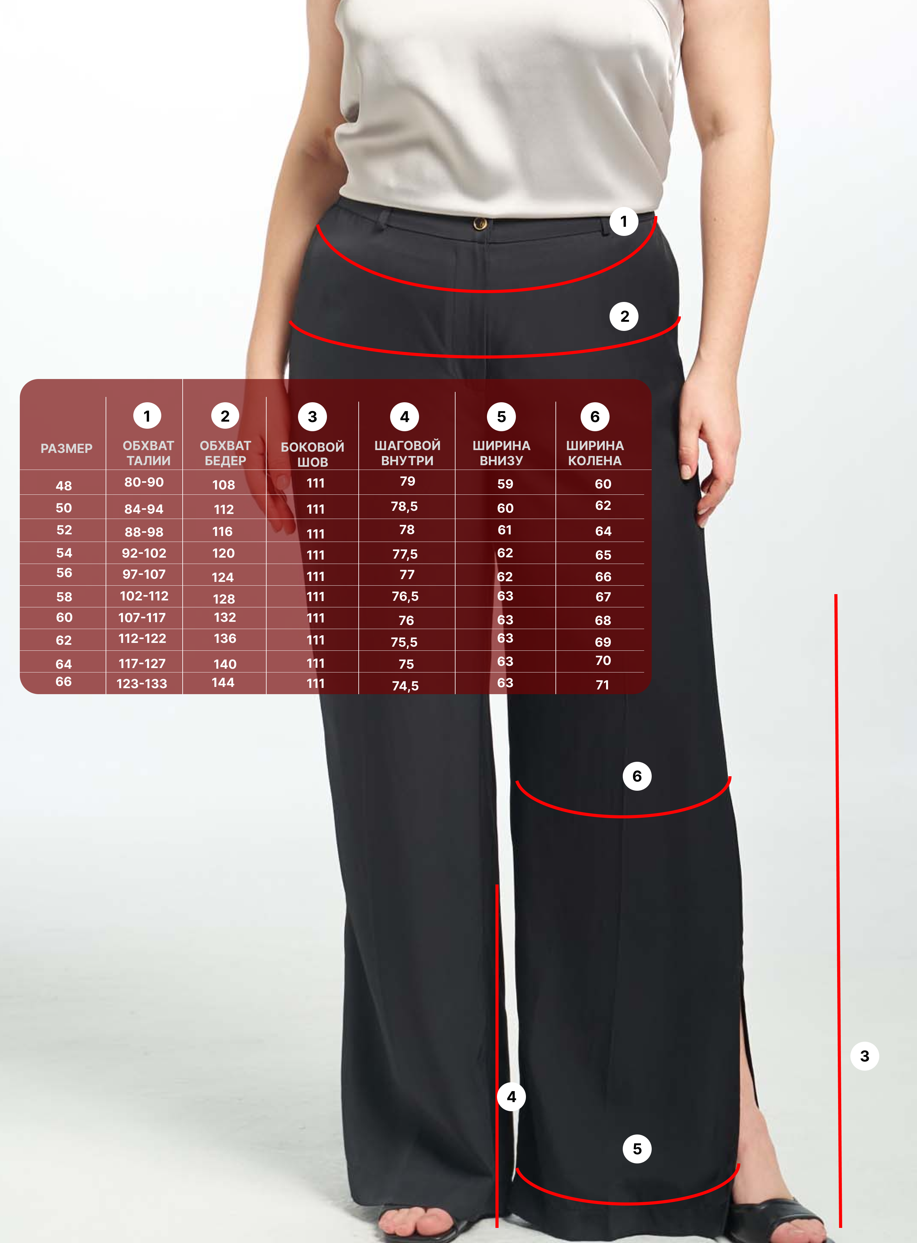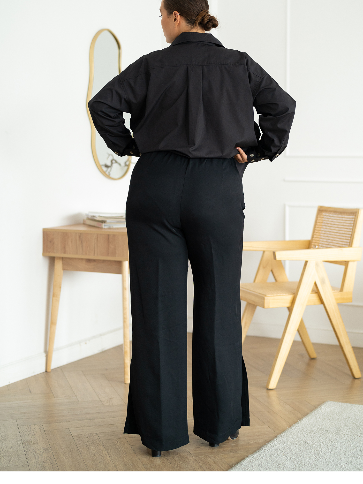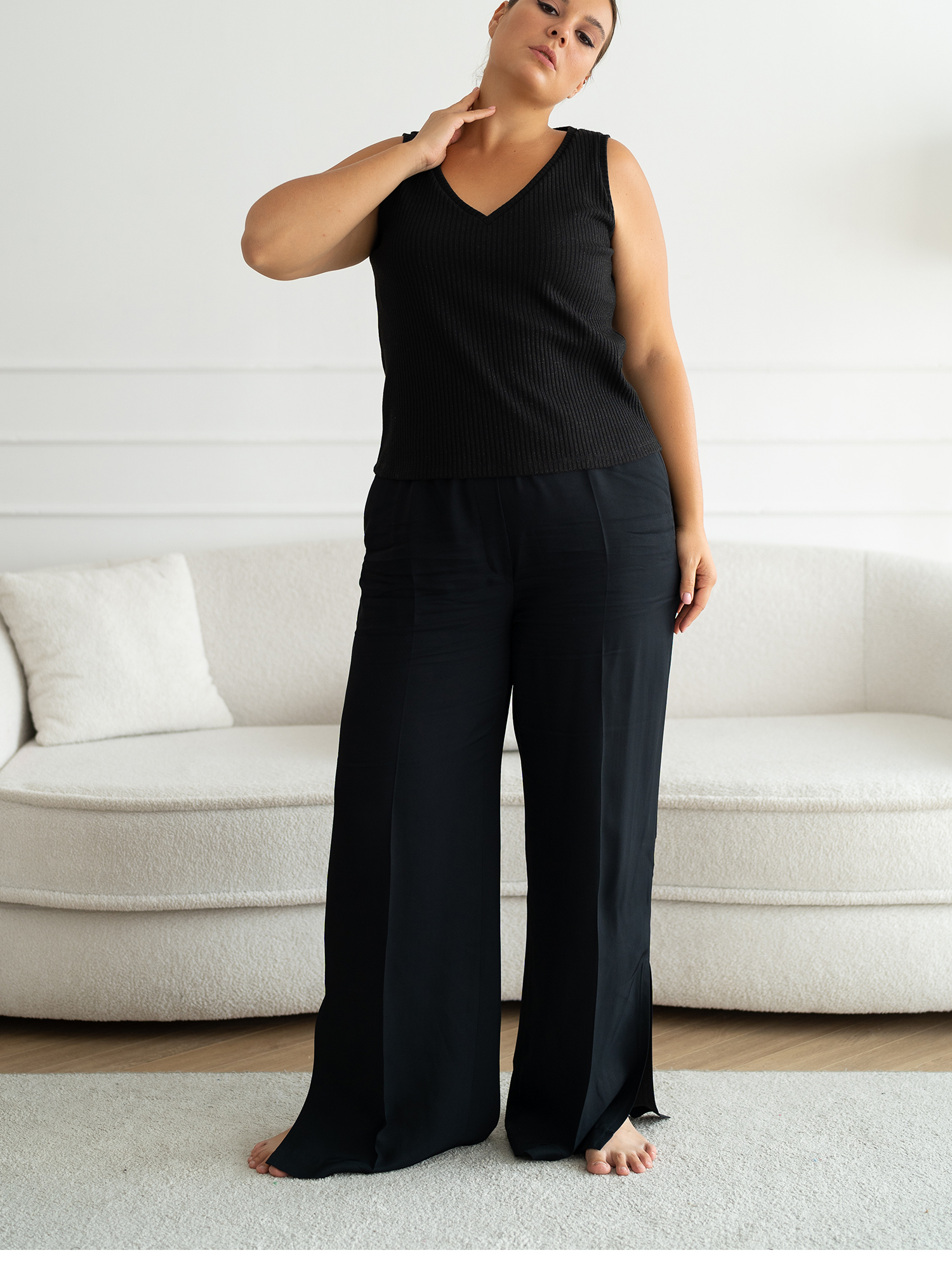 Брюки шелк 24/40. Брюки прямого кроя, широкие от бедра и по всей длине. Гульфик ложный, пояс с эластичной тесьмой внутри. Есть боковые карманы. В боковых швах высокие разрезы. Брюки выполнены из вискозной шелковистой ткани в черном цвете.