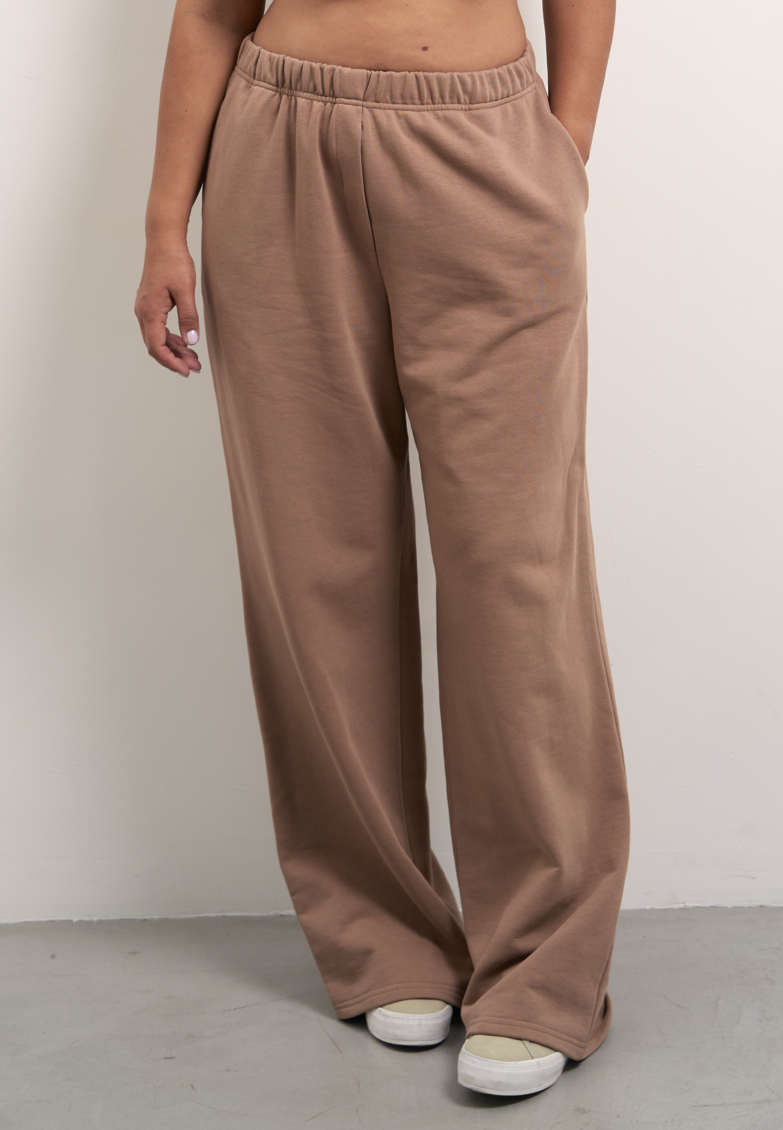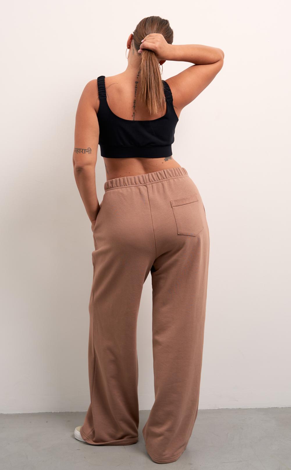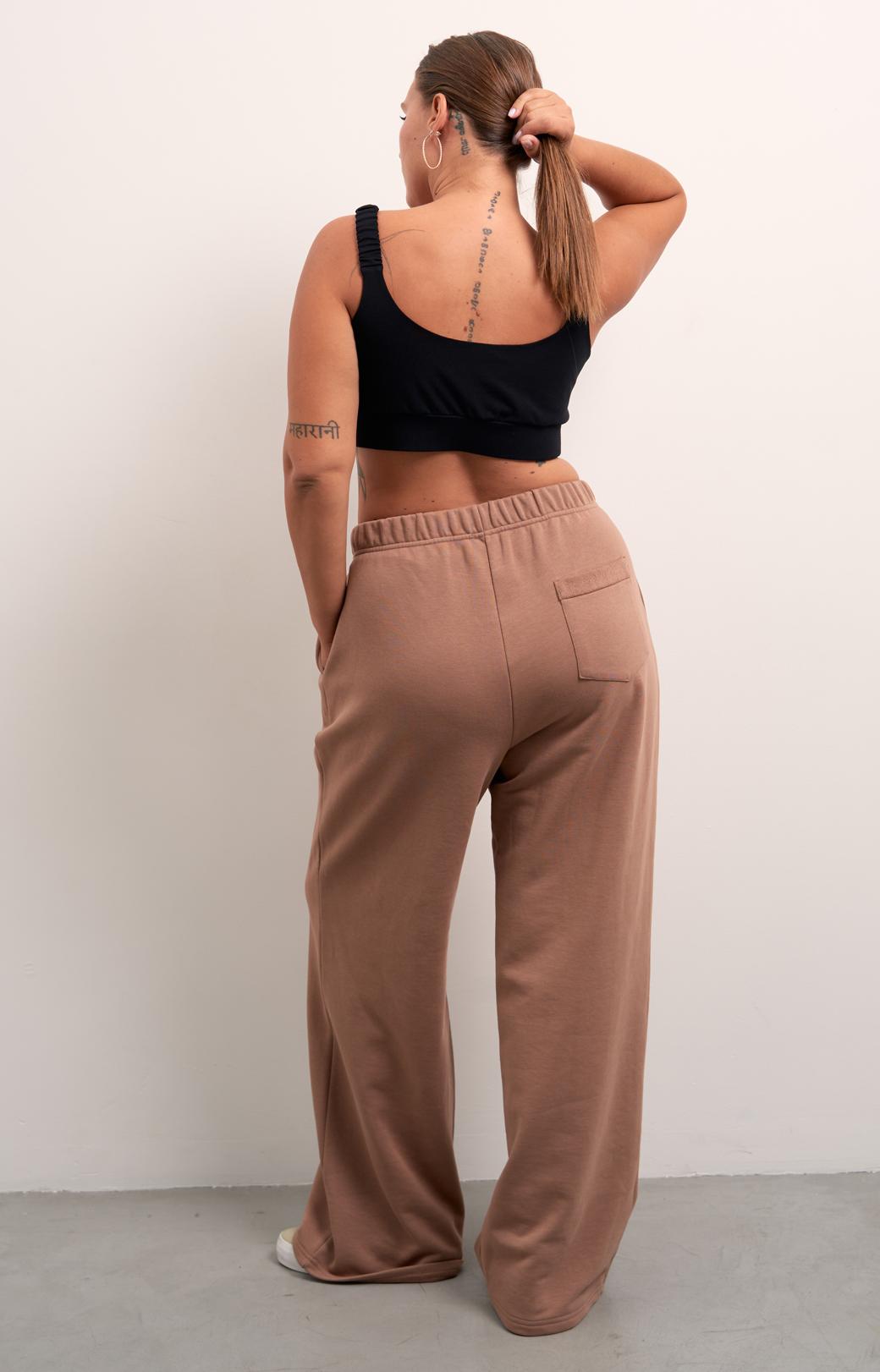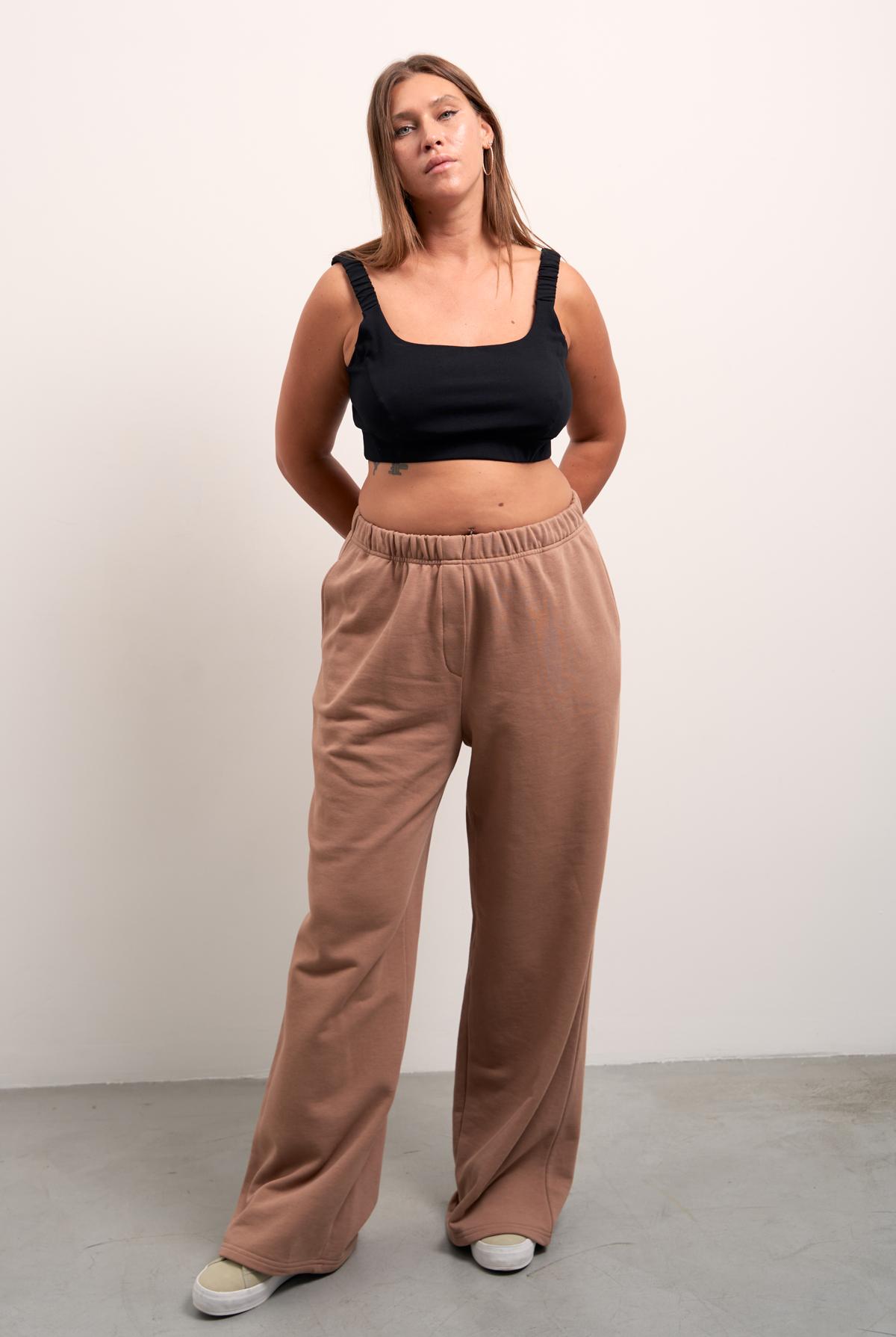 Брюки свободные, широкие по всей длине. Пояс цельнокроенный с эластичной тесьмой внутри и со шнуром. Боковые карманы на передних половинках. На правой задней половинке накладной карман. Брюки выполнены из хлопкового трикотажного футера в двух цветах: сером и темно бежевом.