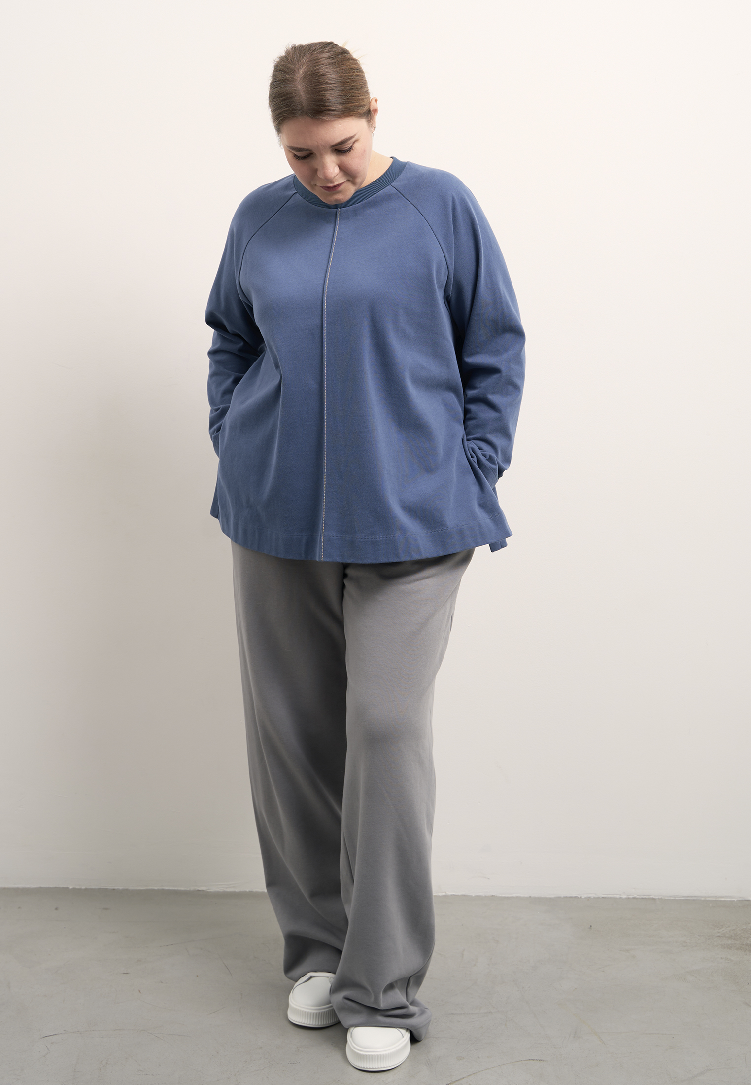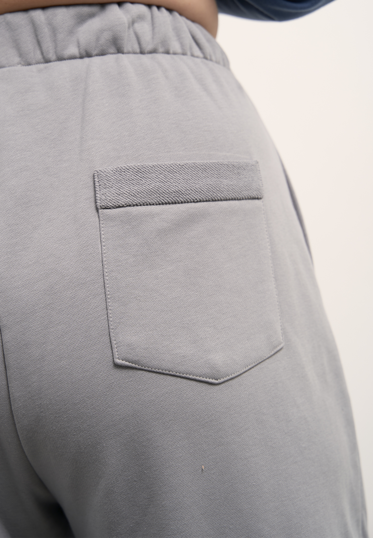 Брюки свободные, широкие по всей длине. Пояс цельнокроенный с эластичной тесьмой внутри и со шнуром. Боковые карманы на передних половинках. На правой задней половинке накладной карман. Брюки выполнены из хлопкового трикотажного футера в двух цветах: сером и темно бежевом.