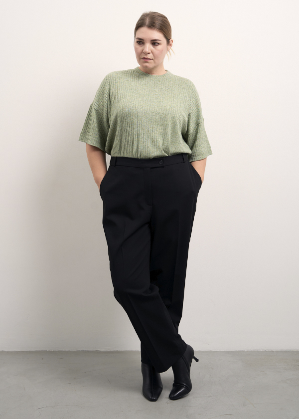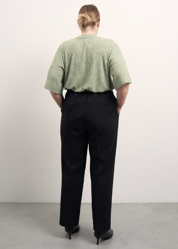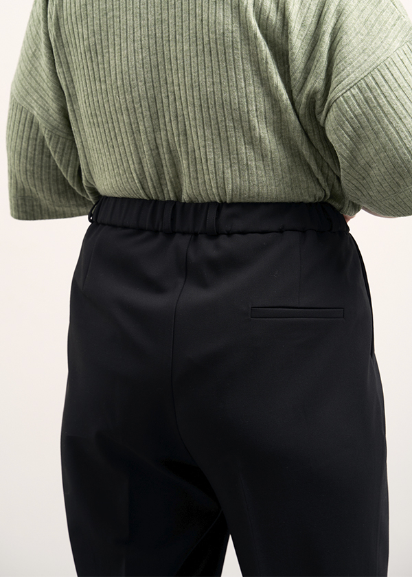 Брюки прилегающие в области бедер, плавно сужающиеся к низу. Посадка на талии. Пояс притачной, по спинке с эластичной тесьмой внутри. Застегиваются спереди на молнию и пуговицы. Боковые карманы на передних половинках. На правой задней половинке выполнен ложный прорезной карман с листочкой. Брюки укороченные до щиколотки. Выполнены из вискозосодержащей костюмной ткани с эластаном в черном и бежевом цвете.