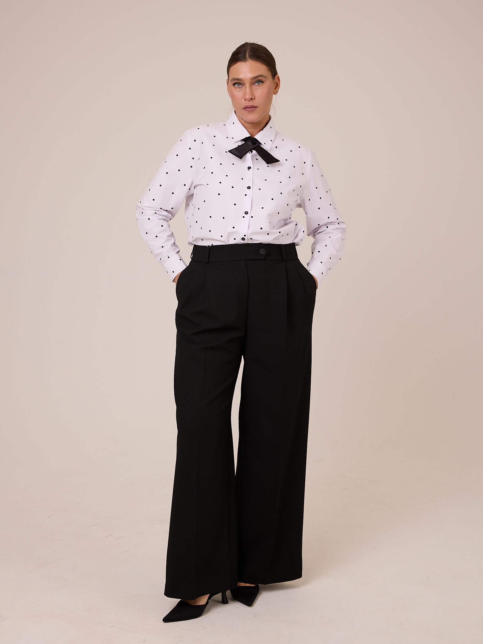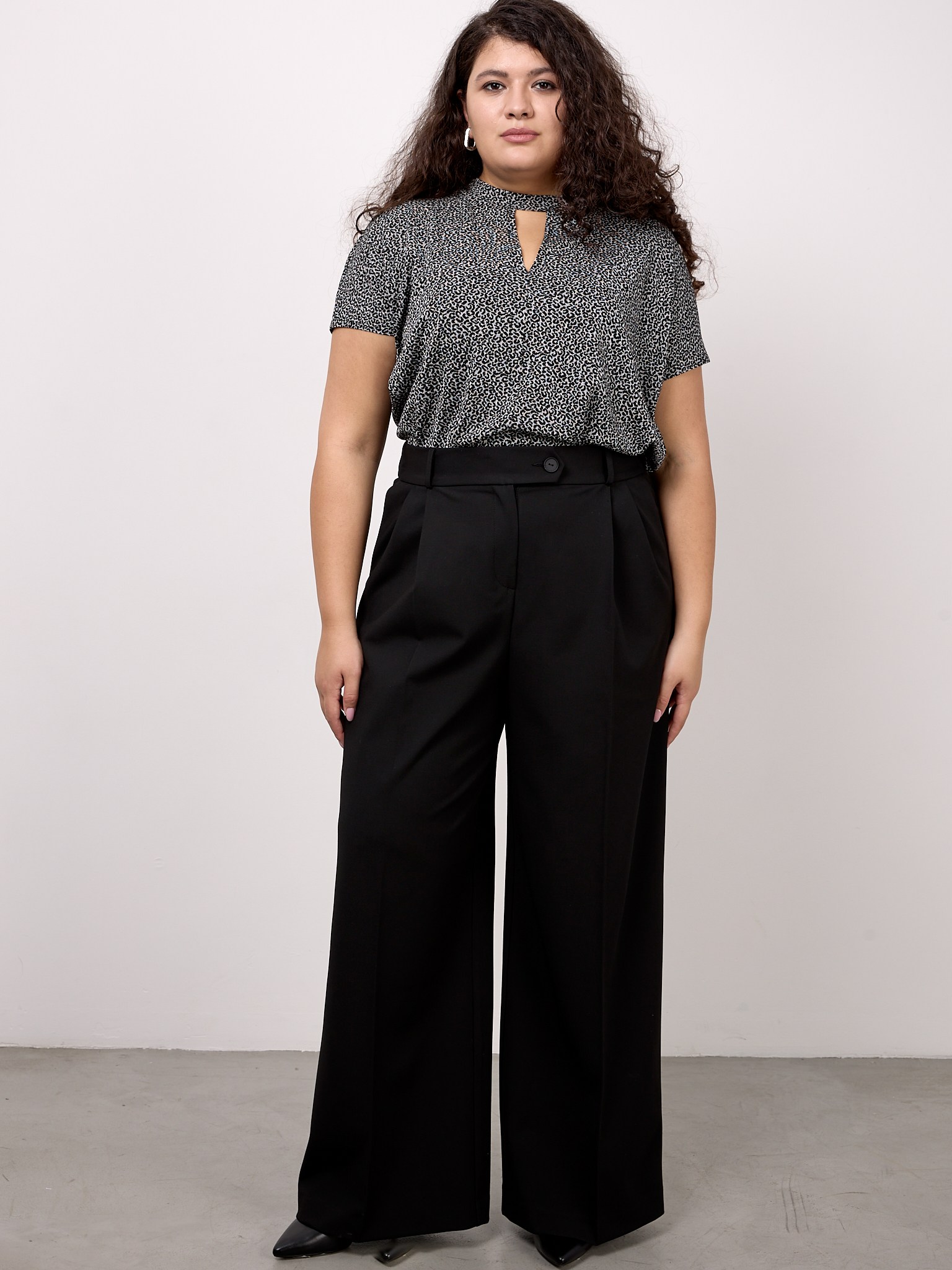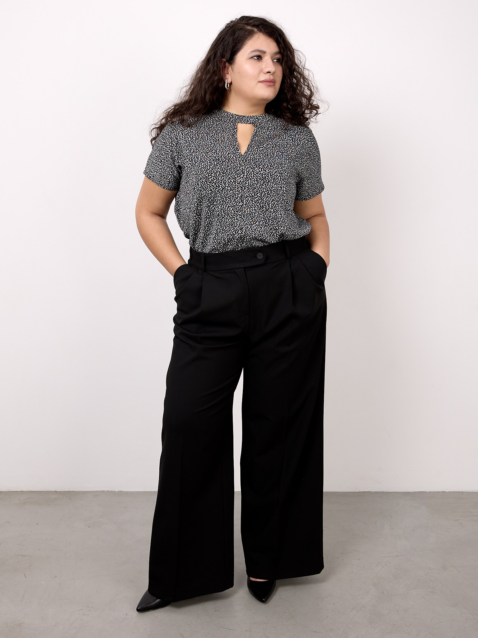 Брюки свободные, широкие по всей длине типа «палаццо», со складками у пояса. Посадка на талии. Пояс притачной, по спинке с эластичной тесьмой внутри. Застегиваются на молнию и пуговицы. Боковые карманы на передних половинках. На задней правой половинке ложный карман с листочкой. Брюки выполнены из вискозосодержащей ткани с эластаном в черном цвете.