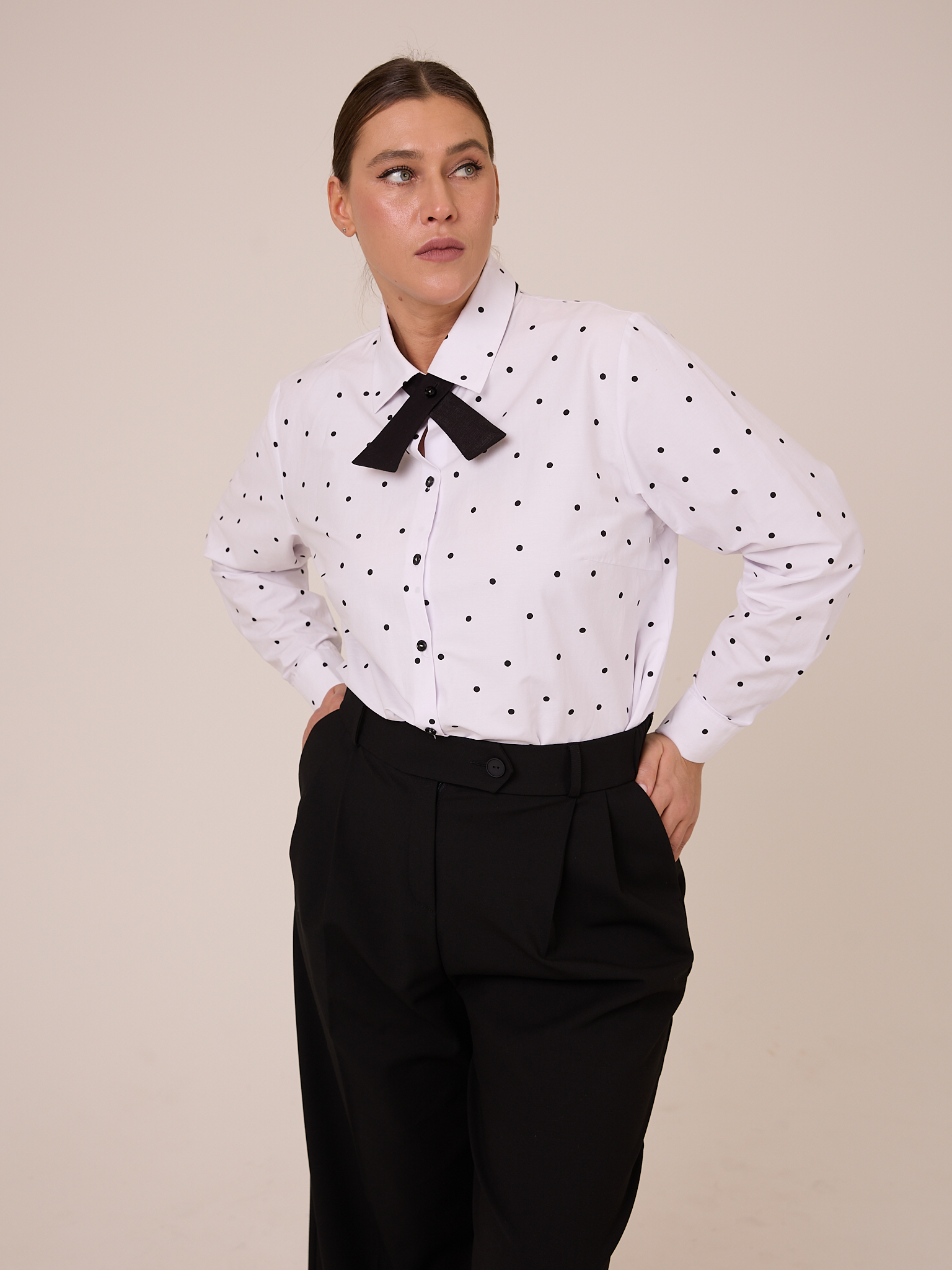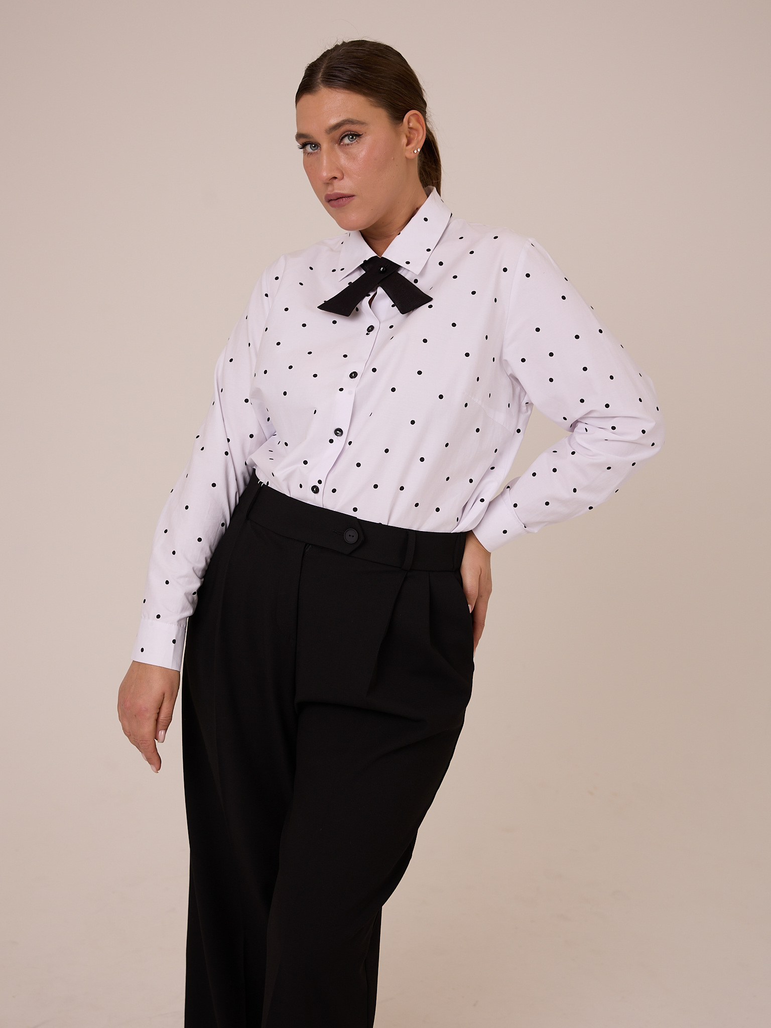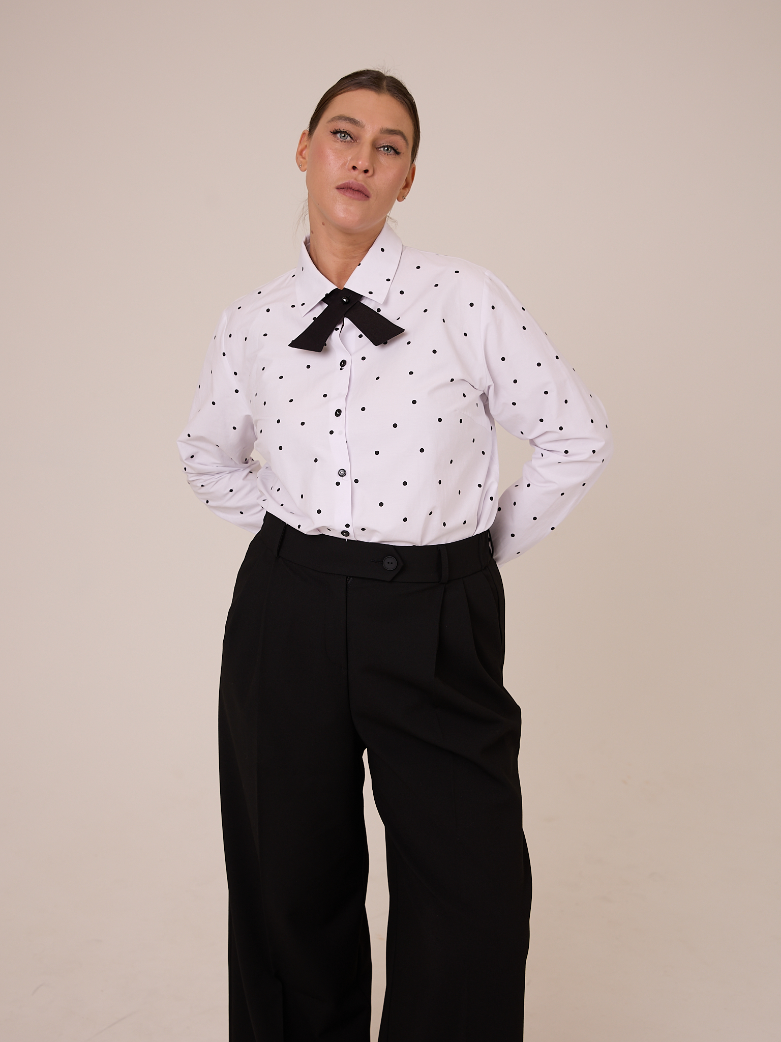Брюки свободные, широкие по всей длине типа «палаццо», со складками у пояса. Посадка на талии. Пояс притачной, по спинке с эластичной тесьмой внутри. Застегиваются на молнию и пуговицы. Боковые карманы на передних половинках. На задней правой половинке ложный карман с листочкой. Брюки выполнены из вискозосодержащей ткани с эластаном в черном цвете.