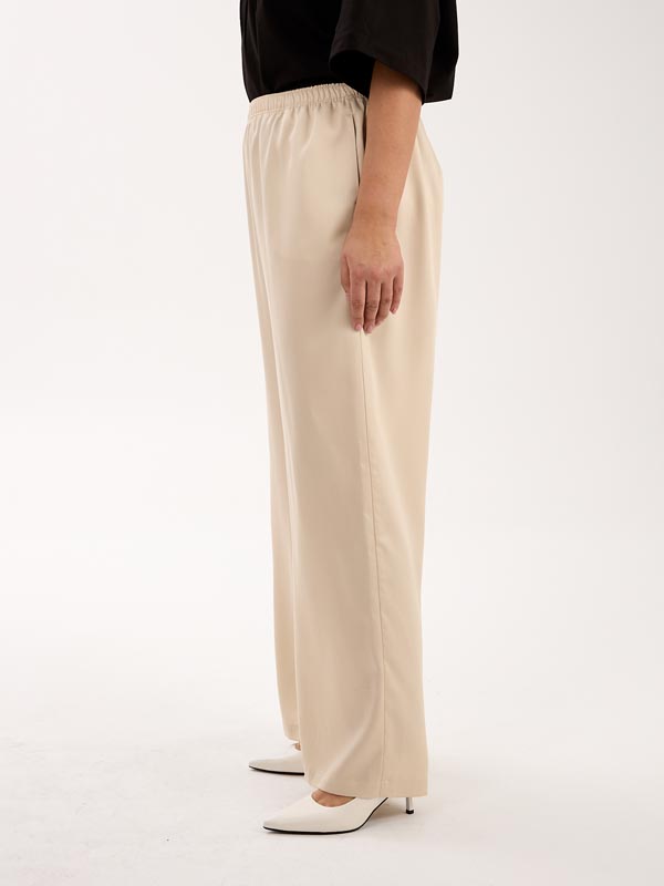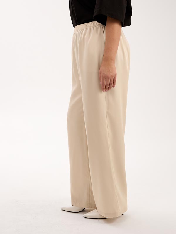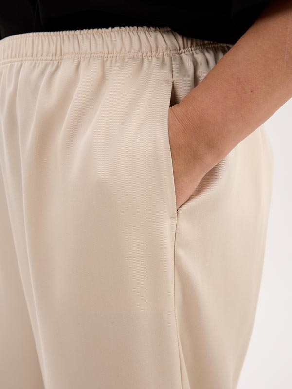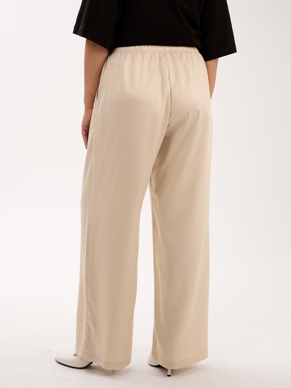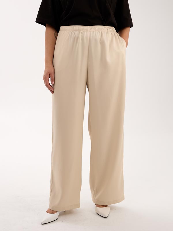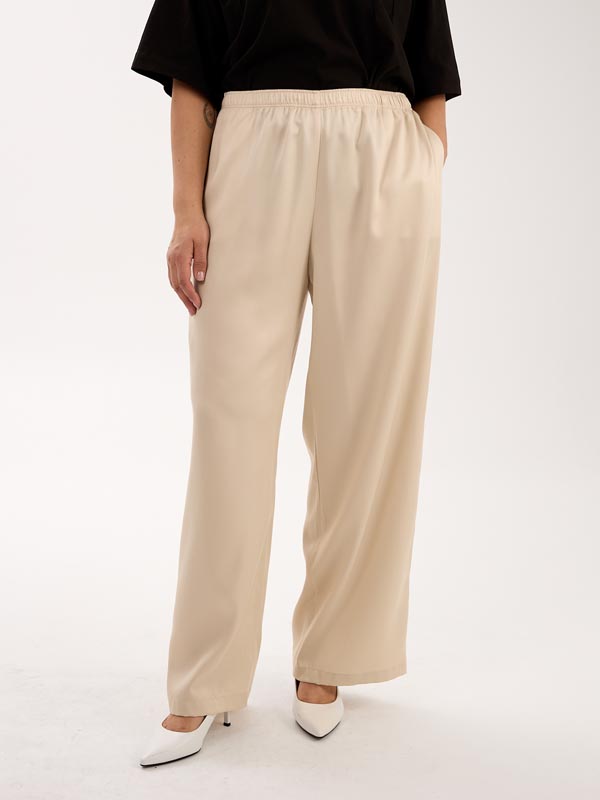 Брюки с классической посадкой, свободные в области бедер, умеренно широкие по всей длине. Карманы на брюках выполнены в боковых швах. Пояс с эластичной тесьмой внутри. Брюки выполнены из тенселя (вискозы) в молочном и голубом цвете.