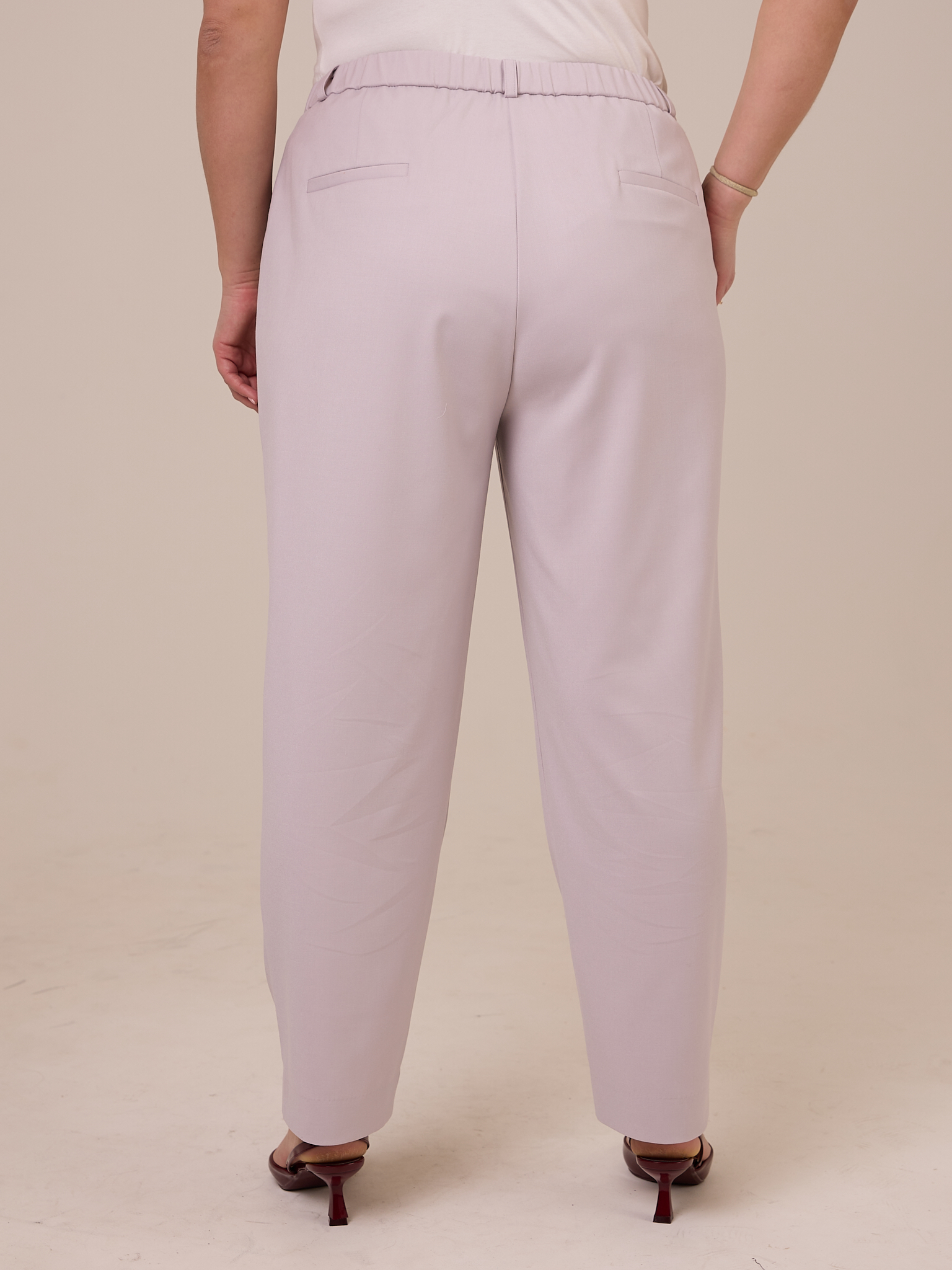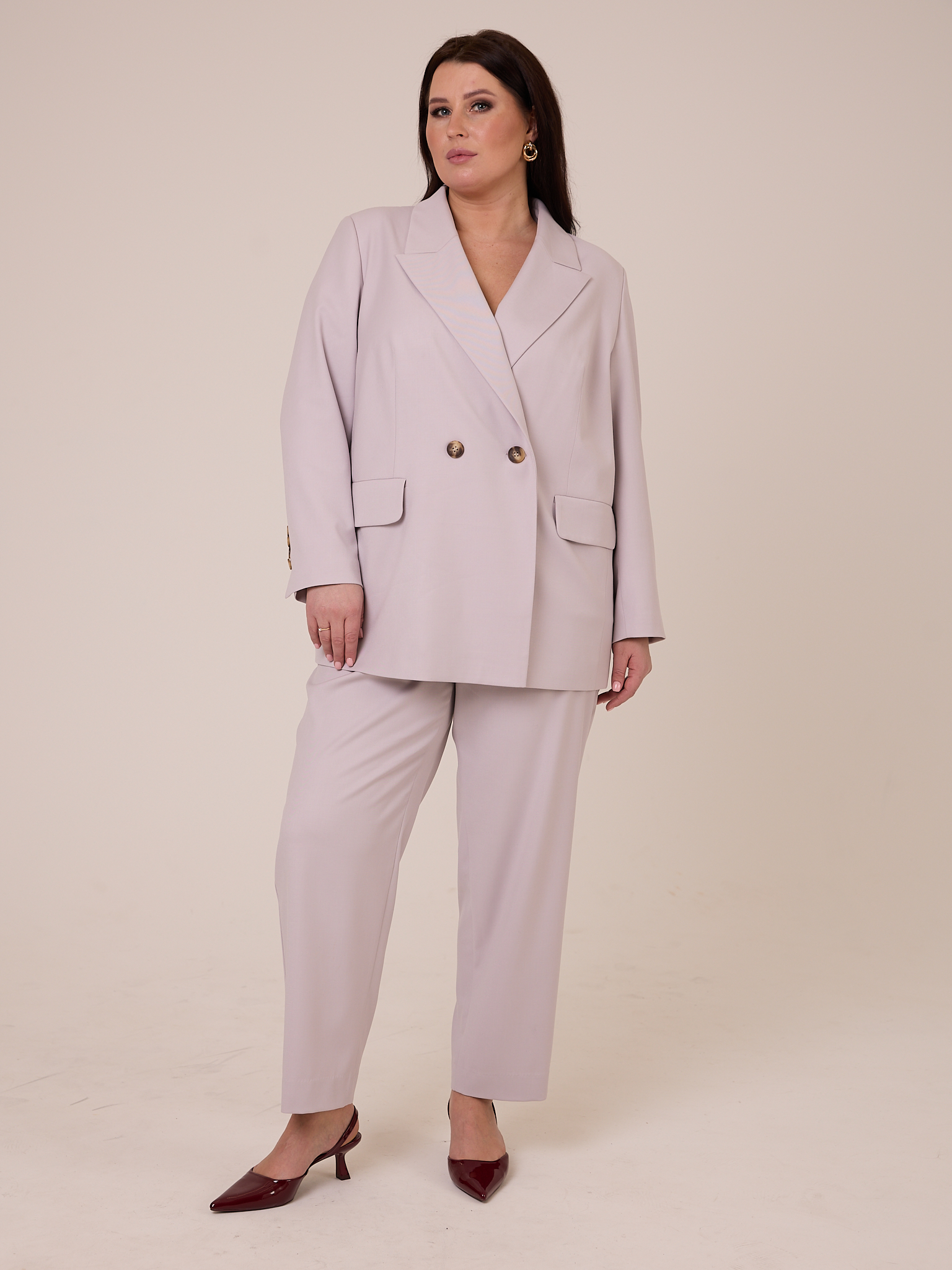 Брюки является частью костюма GIL. Костюм состоит из жакета и брюк. Жакет двубортный, полуприлегающего силуэта. Воротник английский с лацканами. Рукава двухшовные со шлицей. Карманы прорезные с клапанами, расположены горизонтально. Изделие застегивается на петли и пуговицы. Жакет выполнен из вискозосодержащей костюмной ткани на подкладке в серо-розовом и черном цветах. Брюки с классической посадкой, полуприлегающие в области бедер, немного заужены к низу. Длина до щиколотки. Пояс притачной, по спинке с эластичной тесьмой внутри. Боковые карманы на передних половинках. На задних половинках ложные карманы «в рамку». Застежка спереди. Брюки выполнены из вискозосодержащей ткани в серо-розовом и черном цветах.