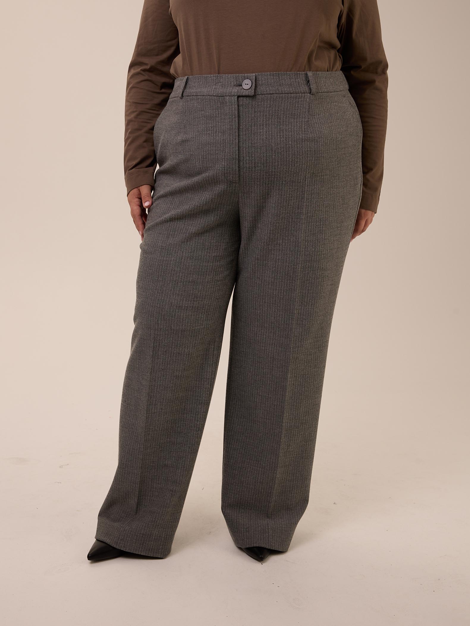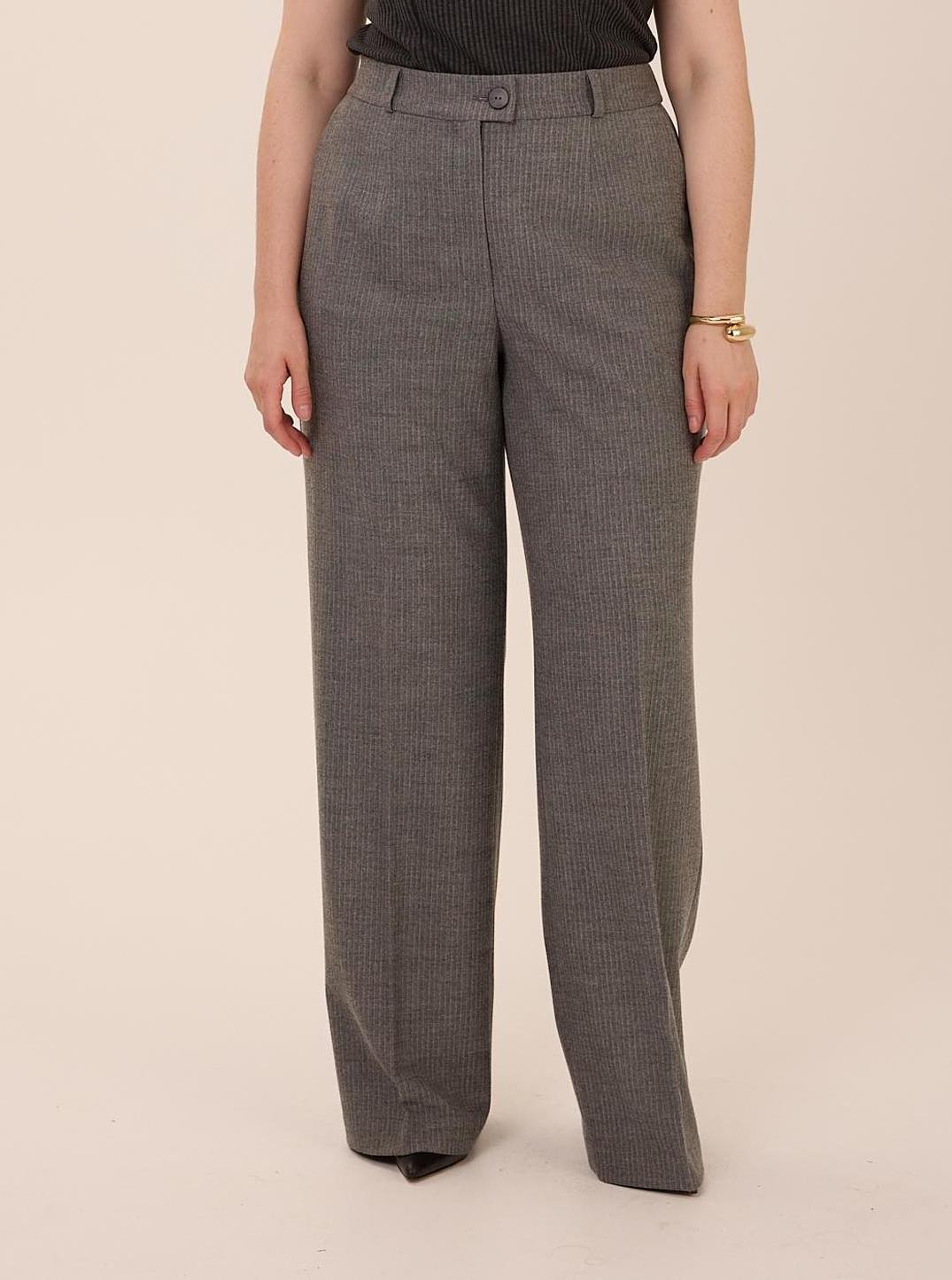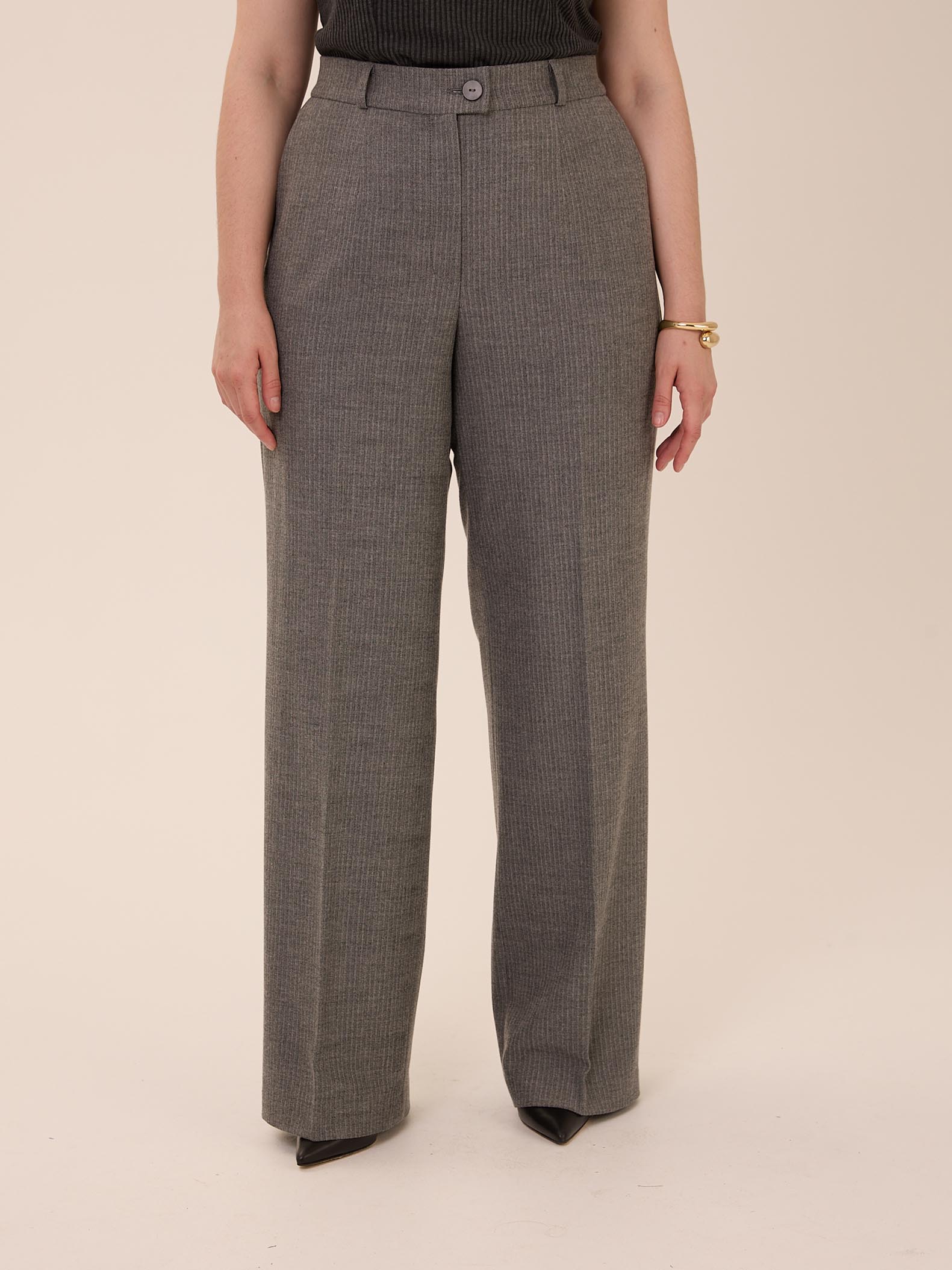 Брюки является частью костюма JULIA. Костюм состоит из жакета и брюк. Брюки прямого кроя, с классической посадкой. Умеренно широкие по всей длине. Пояс притачной, по спинке с эластичной тесьмой внутри. Боковые карманы на передних половинках. На задних половинках выполнены прорезные карманы «в рамку». Застежка спереди. Брюки выполнены из вискозосодержащей костюмной ткани «елочка» в сером цвете.