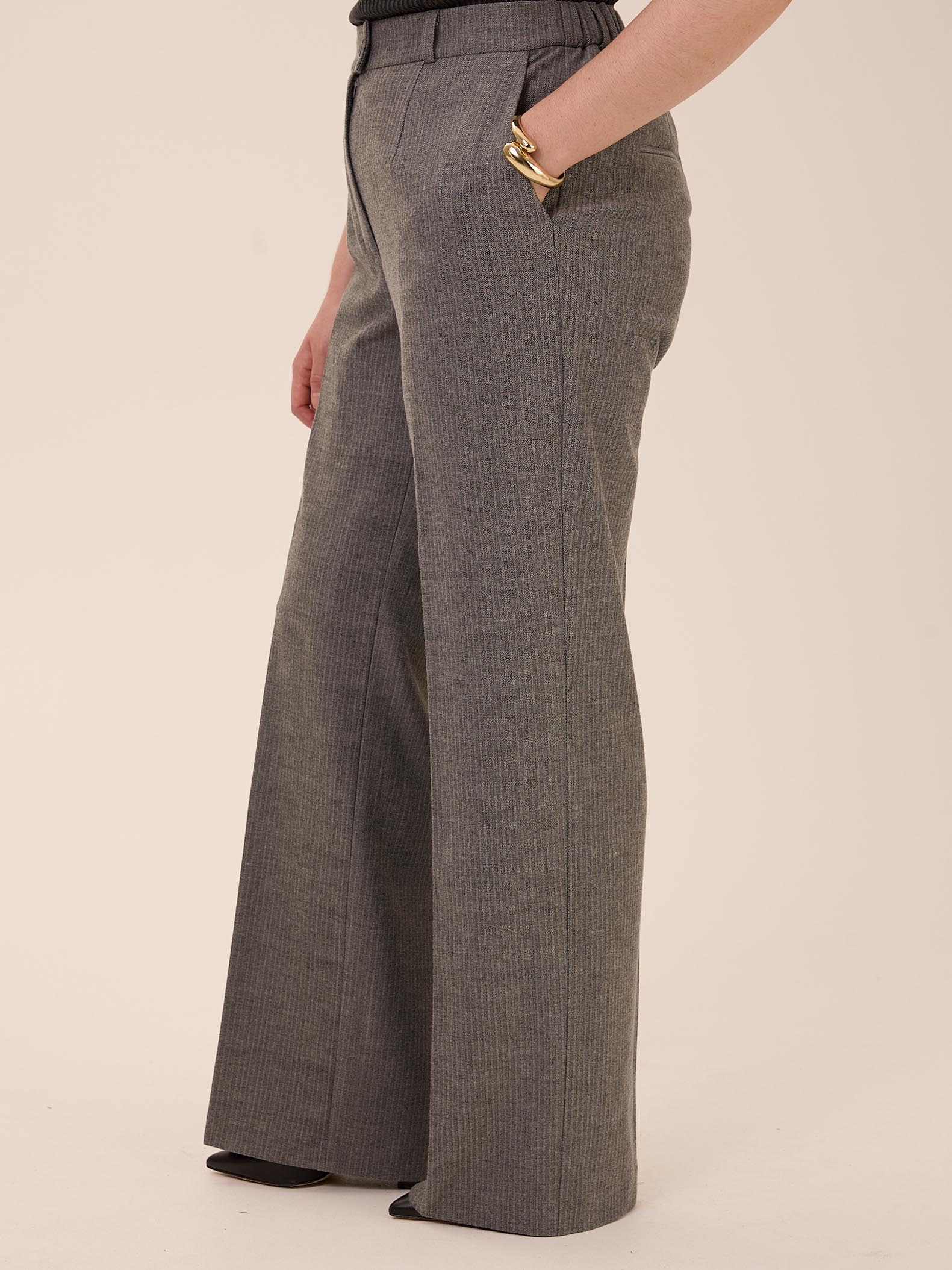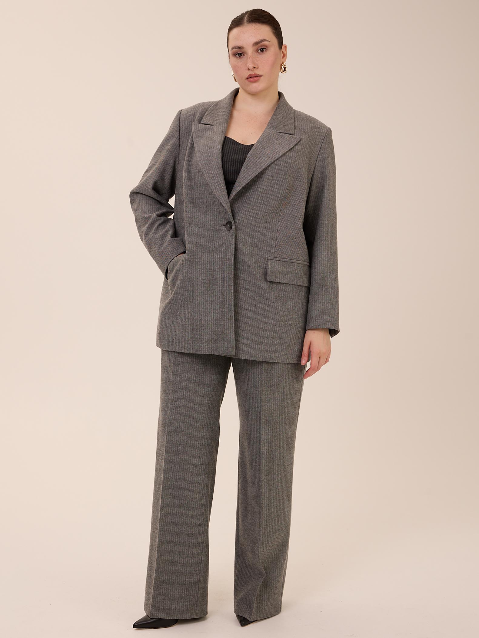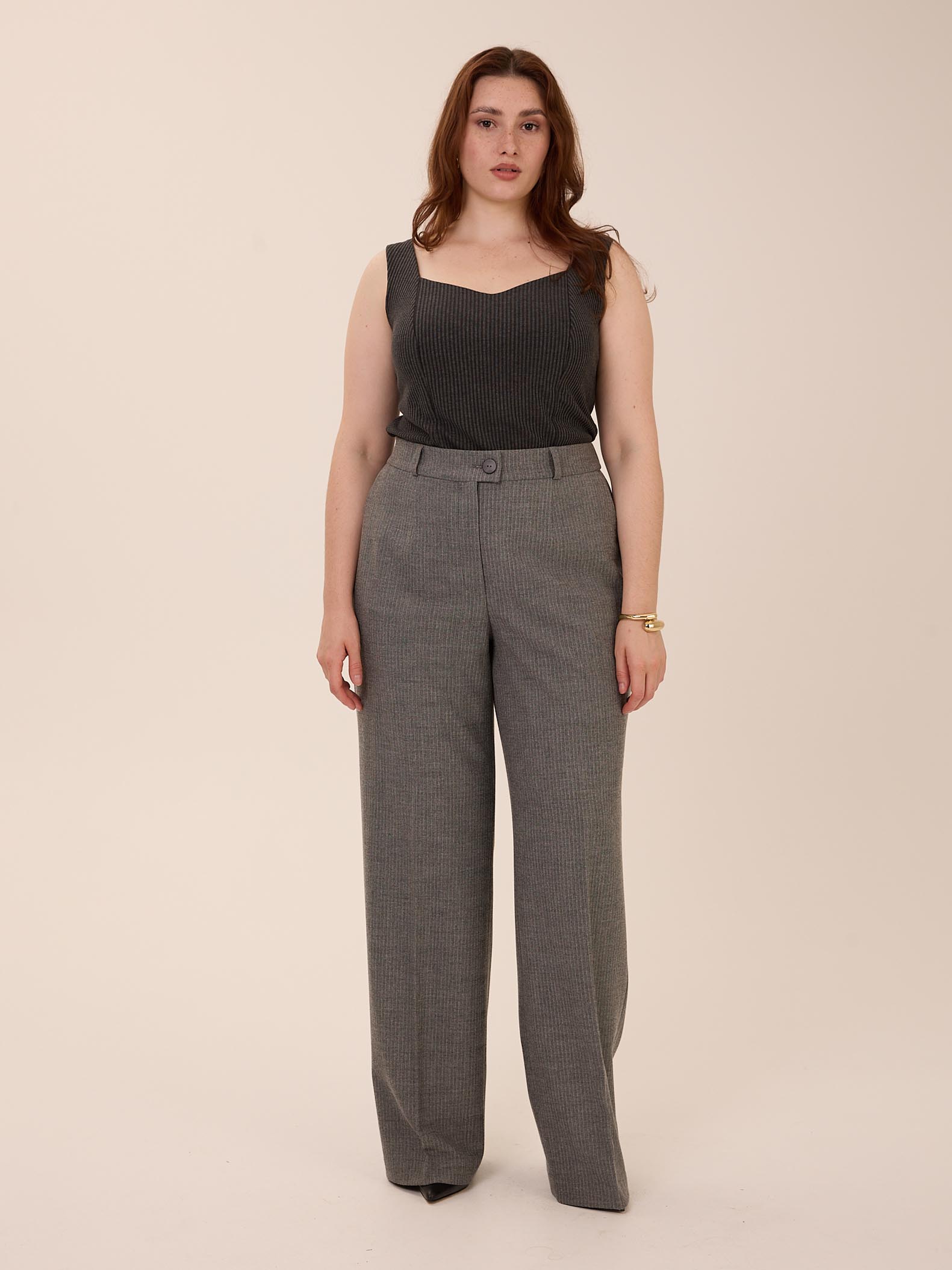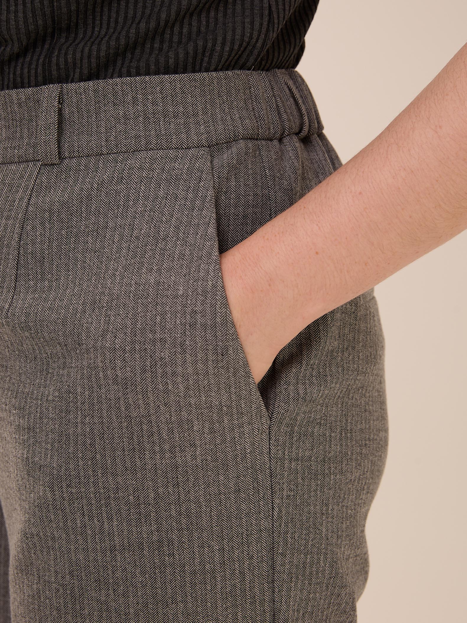 Брюки является частью костюма JULIA. Костюм состоит из жакета и брюк. Брюки прямого кроя, с классической посадкой. Умеренно широкие по всей длине. Пояс притачной, по спинке с эластичной тесьмой внутри. Боковые карманы на передних половинках. На задних половинках выполнены прорезные карманы «в рамку». Застежка спереди. Брюки выполнены из вискозосодержащей костюмной ткани «елочка» в сером цвете.
