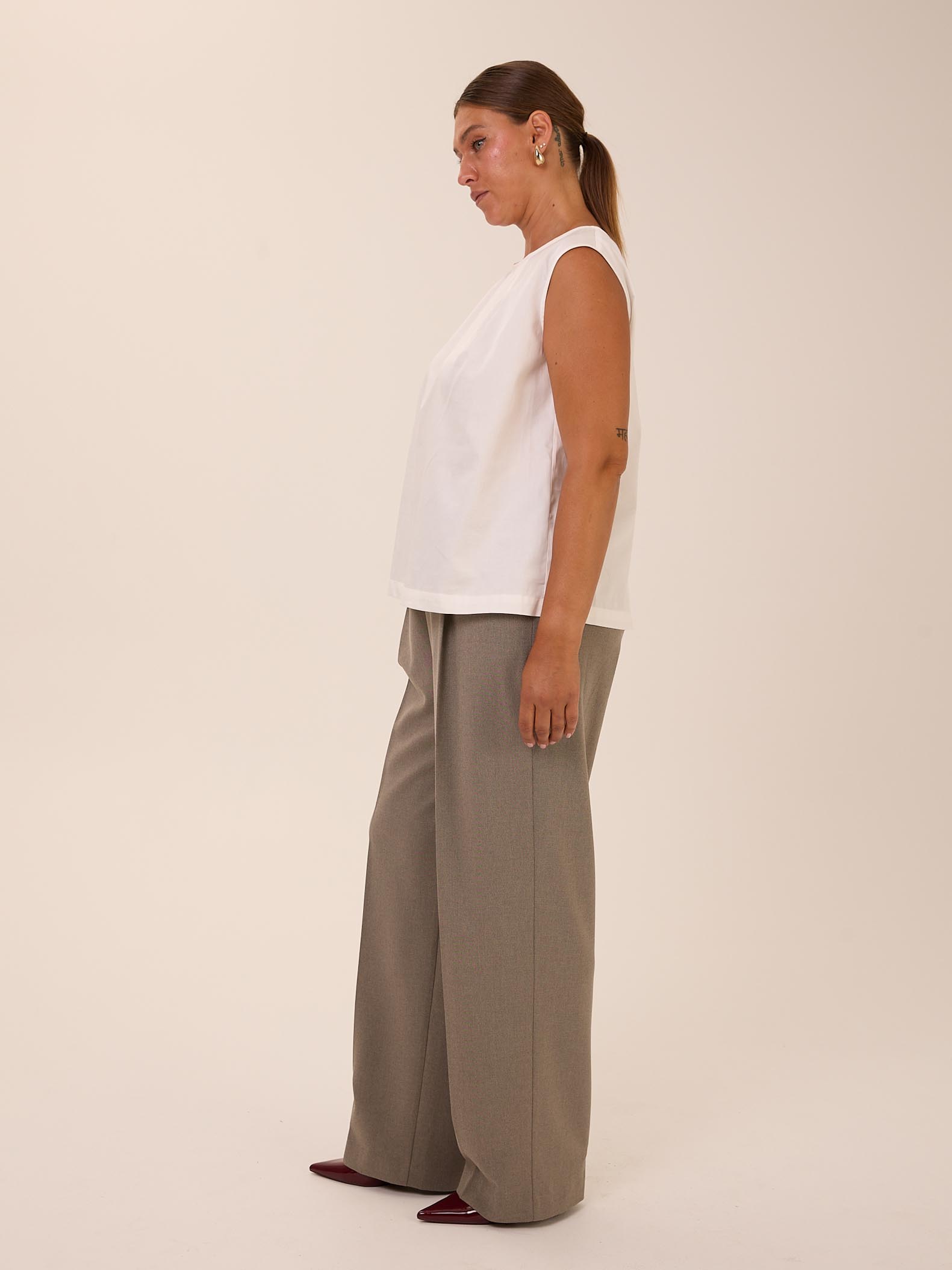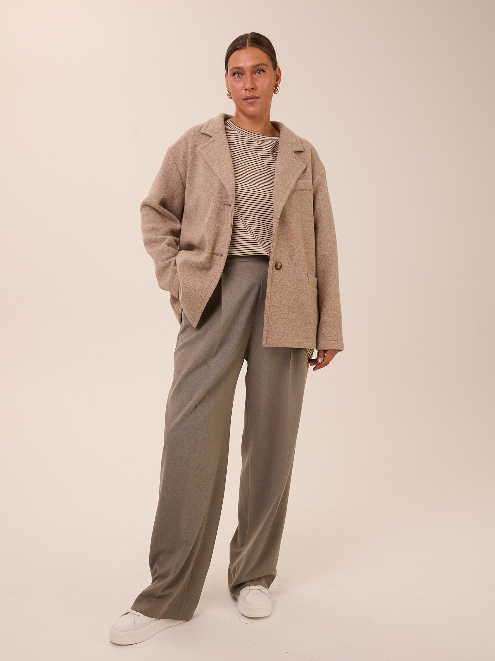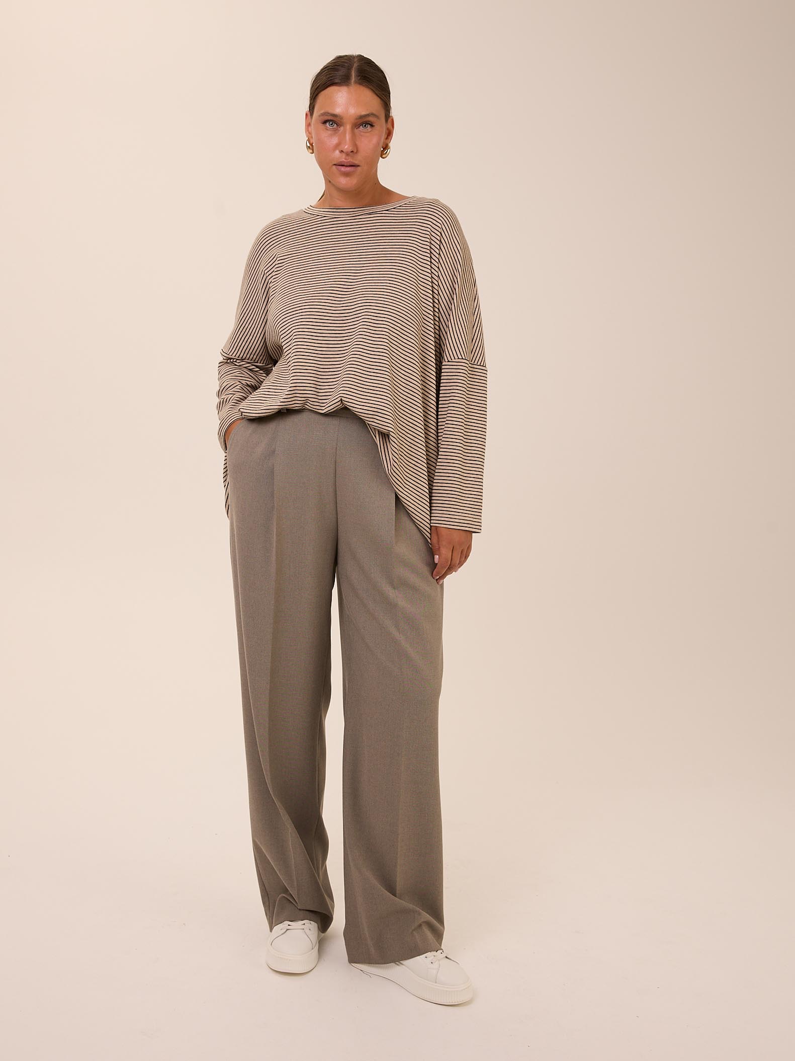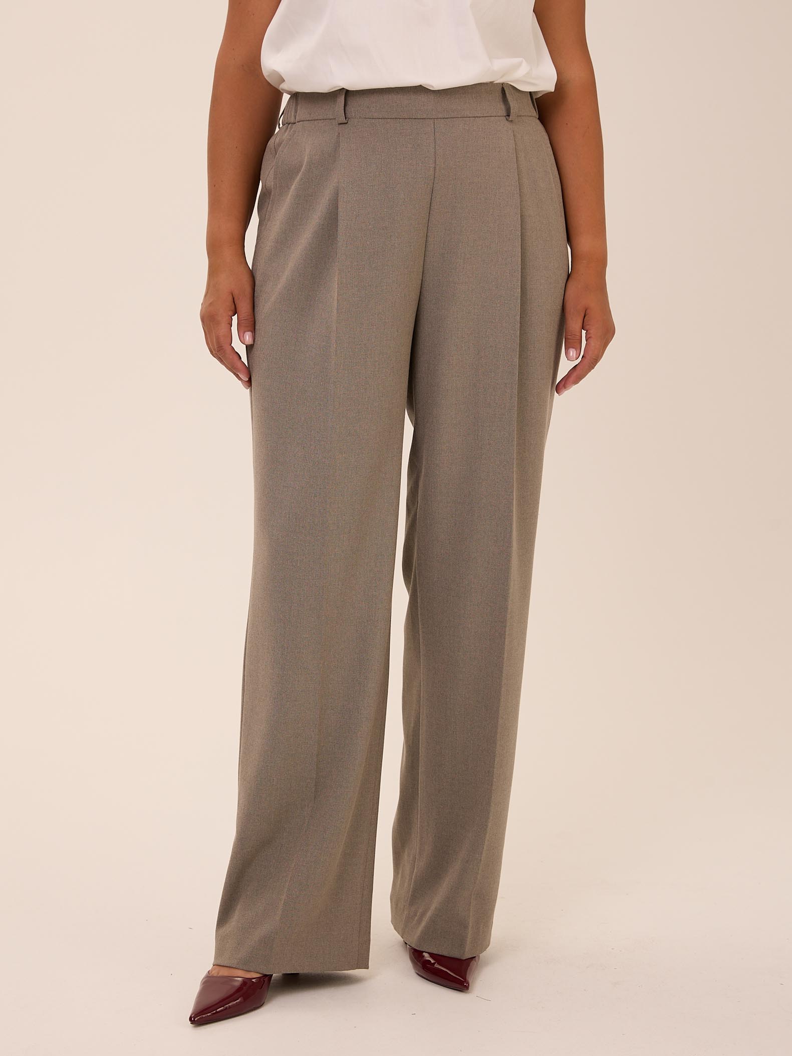 Брюки является частью костюма VALENTA. Брюки с классической посадкой, свободные вверху за счет складок у пояса. Умеренно широкие по всей длине. Пояс притачной, по спинке с эластичной тесьмой внутри. Боковые карманы на передних половинках. Брюки выполнены из вискозосодержащей костюмной ткани в сером цвете.