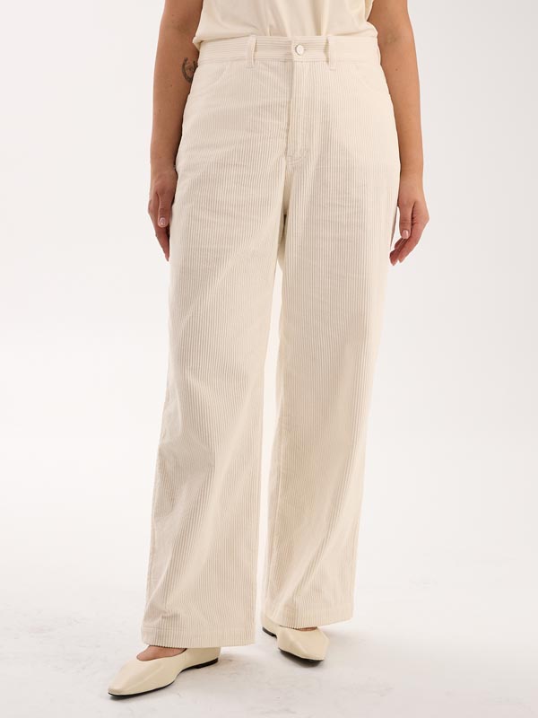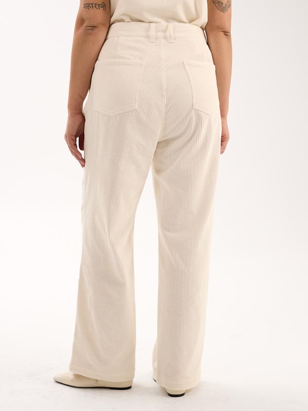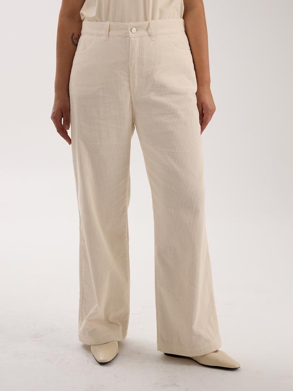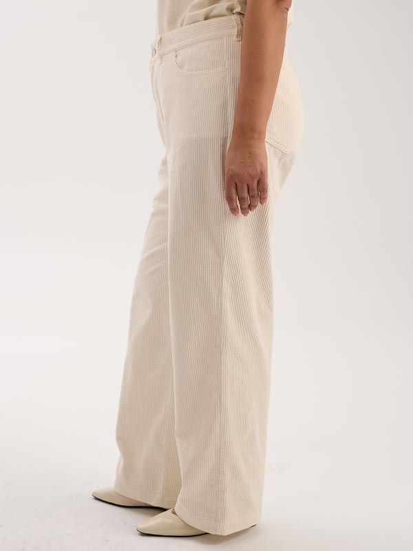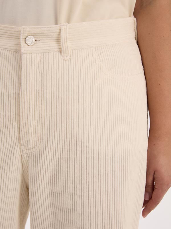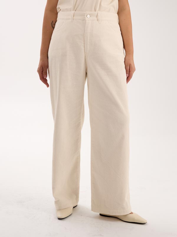 Брюки в джинсовом стиле. Полуприлегающие в области бедер, умеренно широкие по всей длине. Боковые карманы закругленные, на задних половинках накладные пятиугольные карманы. Пояс притачной, прямой, с настрочными шлевками. Брюки застегиваются на металлическую молнию и болт. Выполнены из 100% хлопкового вельвета в сером, молочном и бордовом цветах.