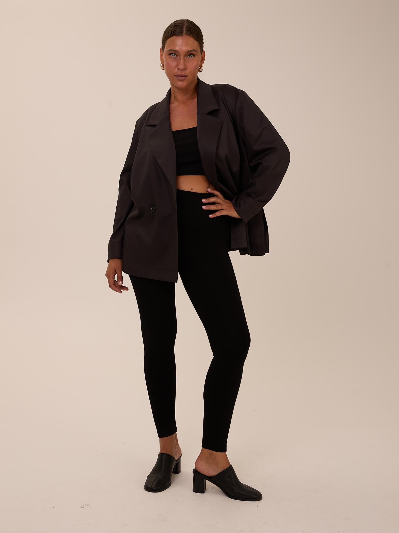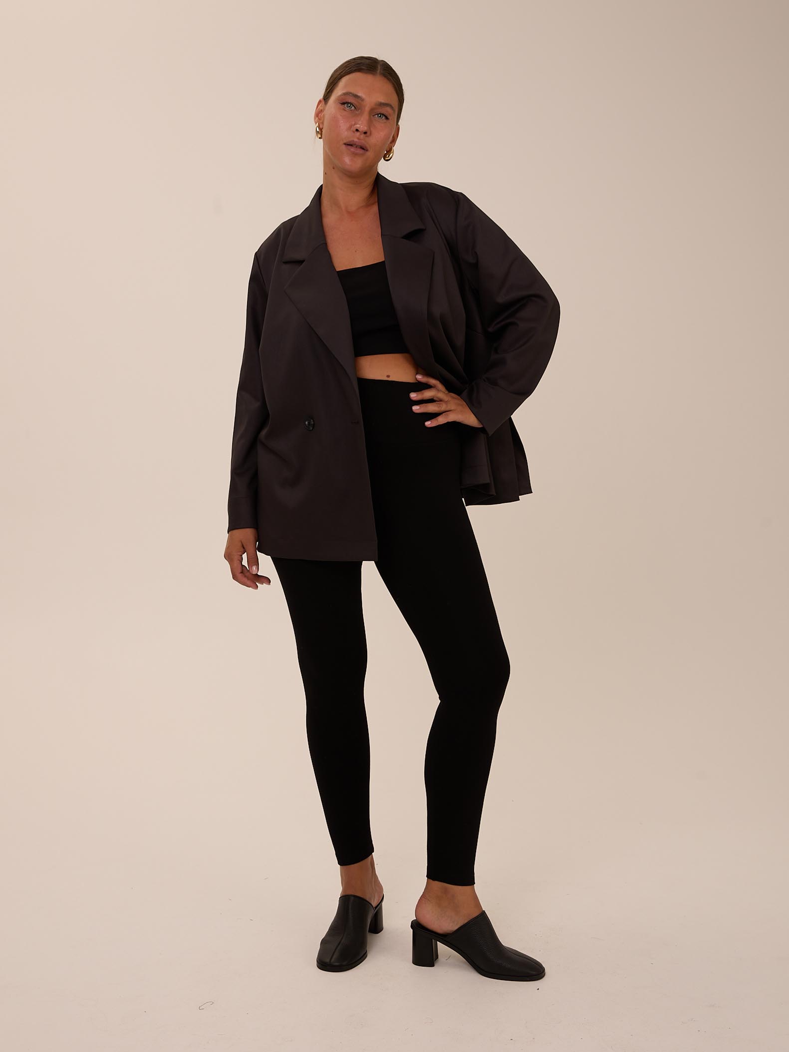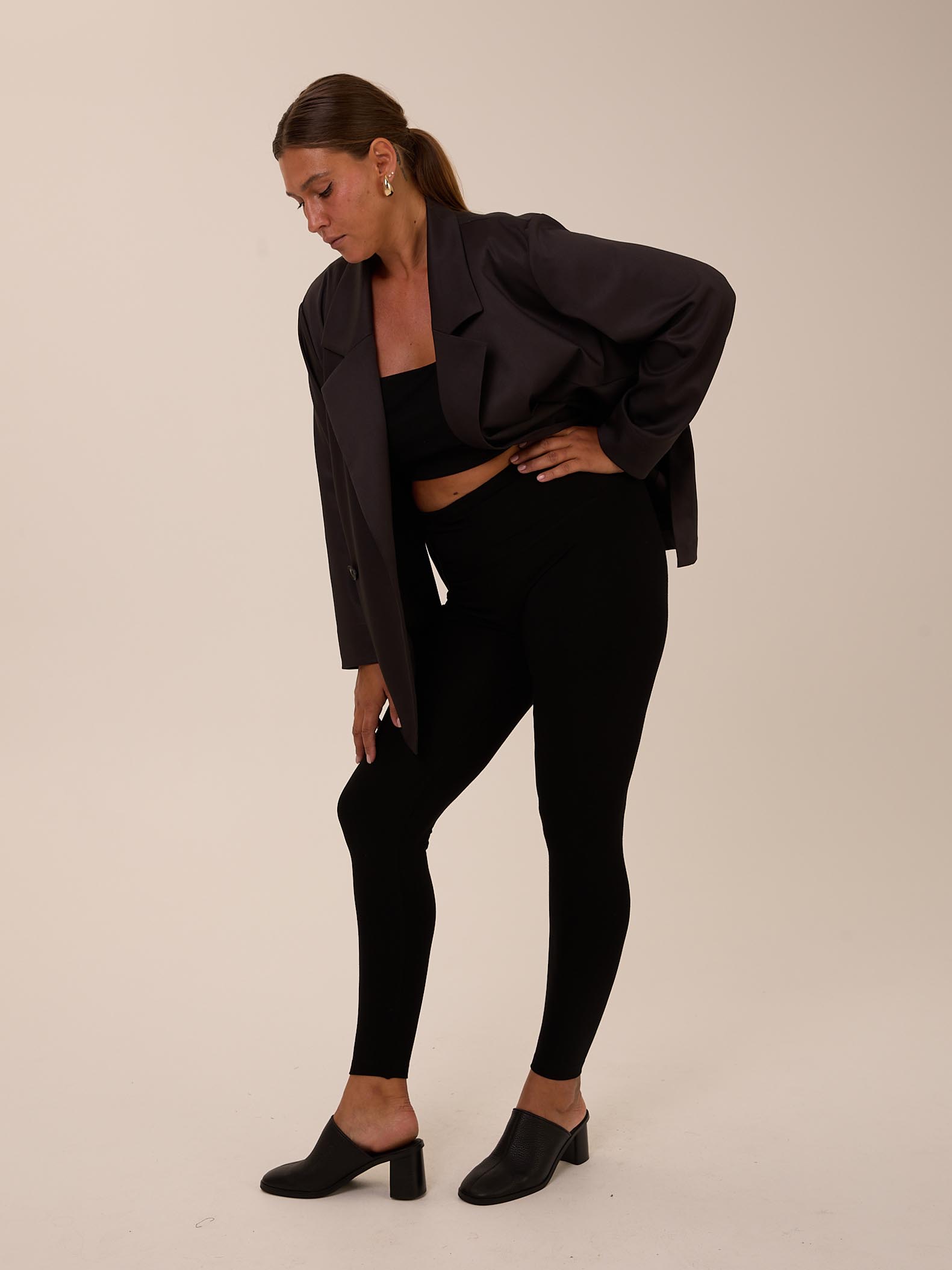 Прилегающие, узкие брюки-леггинсы. Пояс с эластичной тесьмой внутри. Выполнены из эластичного вискозного трикотажа в черном цвете. Маломерят на 1 размер.