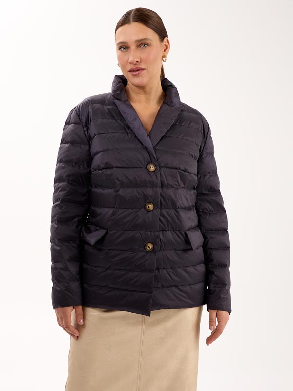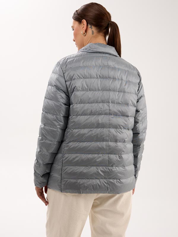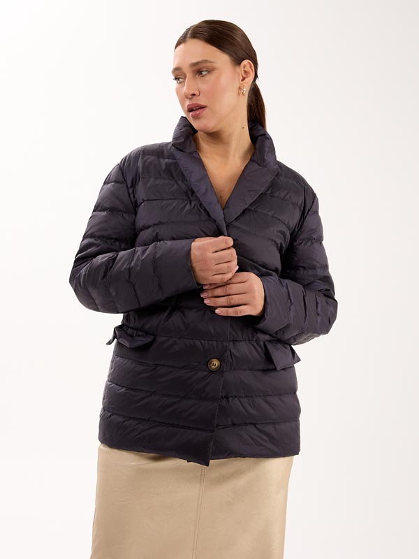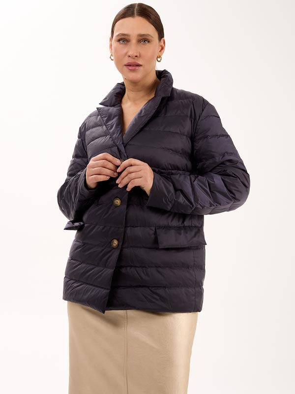 Легкий жакет-пуховик полуприлегающего силуэта, длиной до бедер. Воротник английский с лацканами. Рукава втачные двухшовные. Нагрудная вытачка обеспечивает хорошую посадку. Карманы горизонтальные, пиджачного типа, с клапанами. Изделие застегивается на петли и пуговицы. Выполнено из нейлоновой курточной ткани в трех цветах: темно-синем, серо-голубом, лиловом.