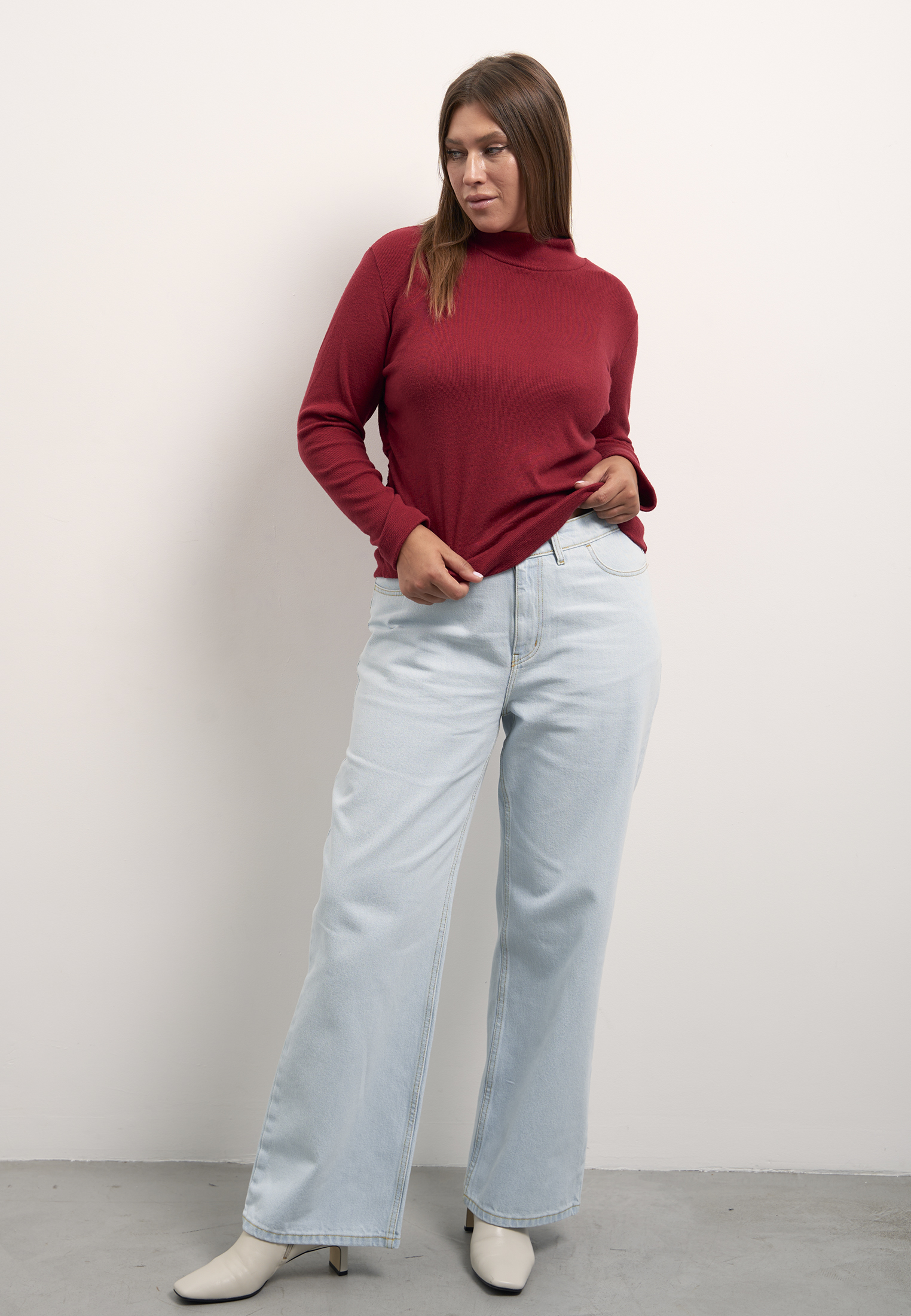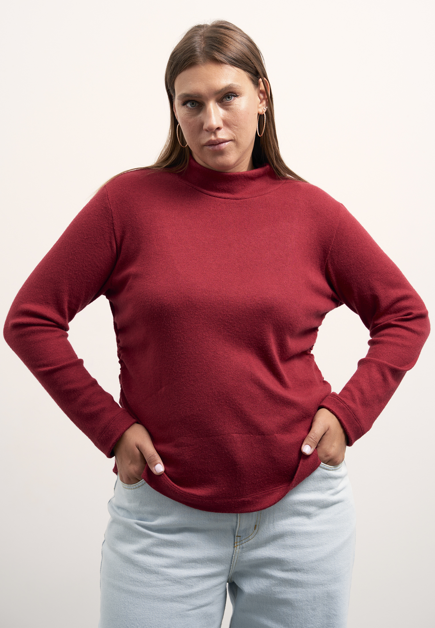 Блузон полуприлегающего силуэта, типа водолазки с невысокой стойкой. Рукава длинные. Боковые швы присобраны и образуют мягкие складки. Блузон выполнен из мягкого вязанного трикотажа с содержанием вискозы в сером и т. красном цветах.