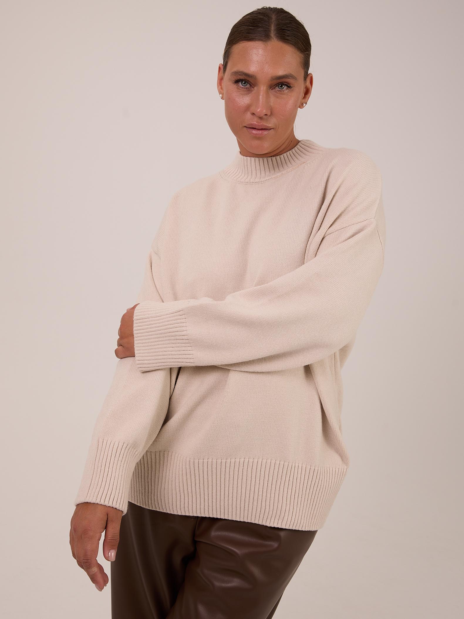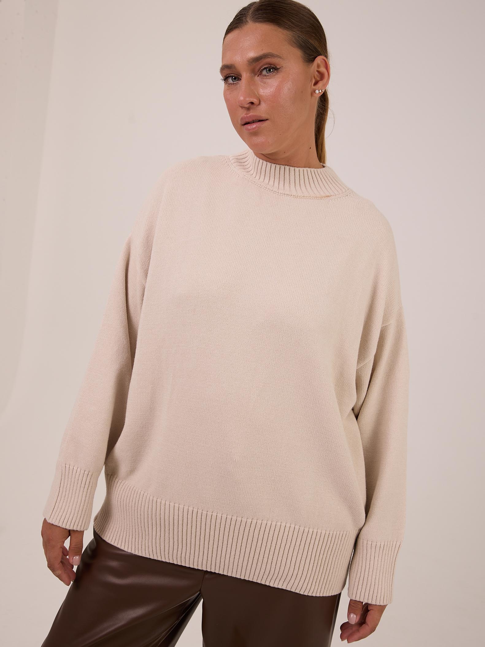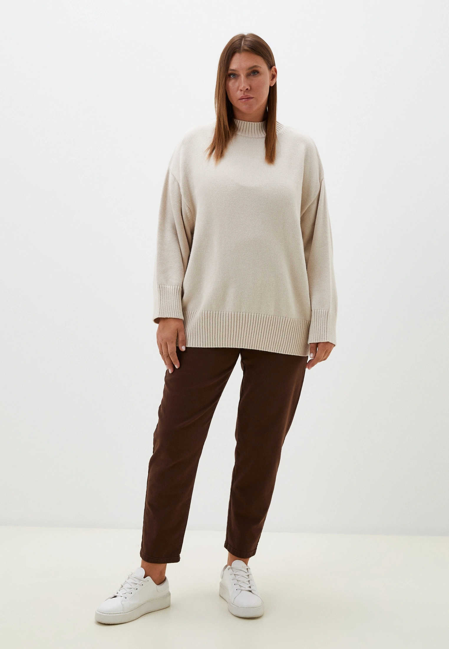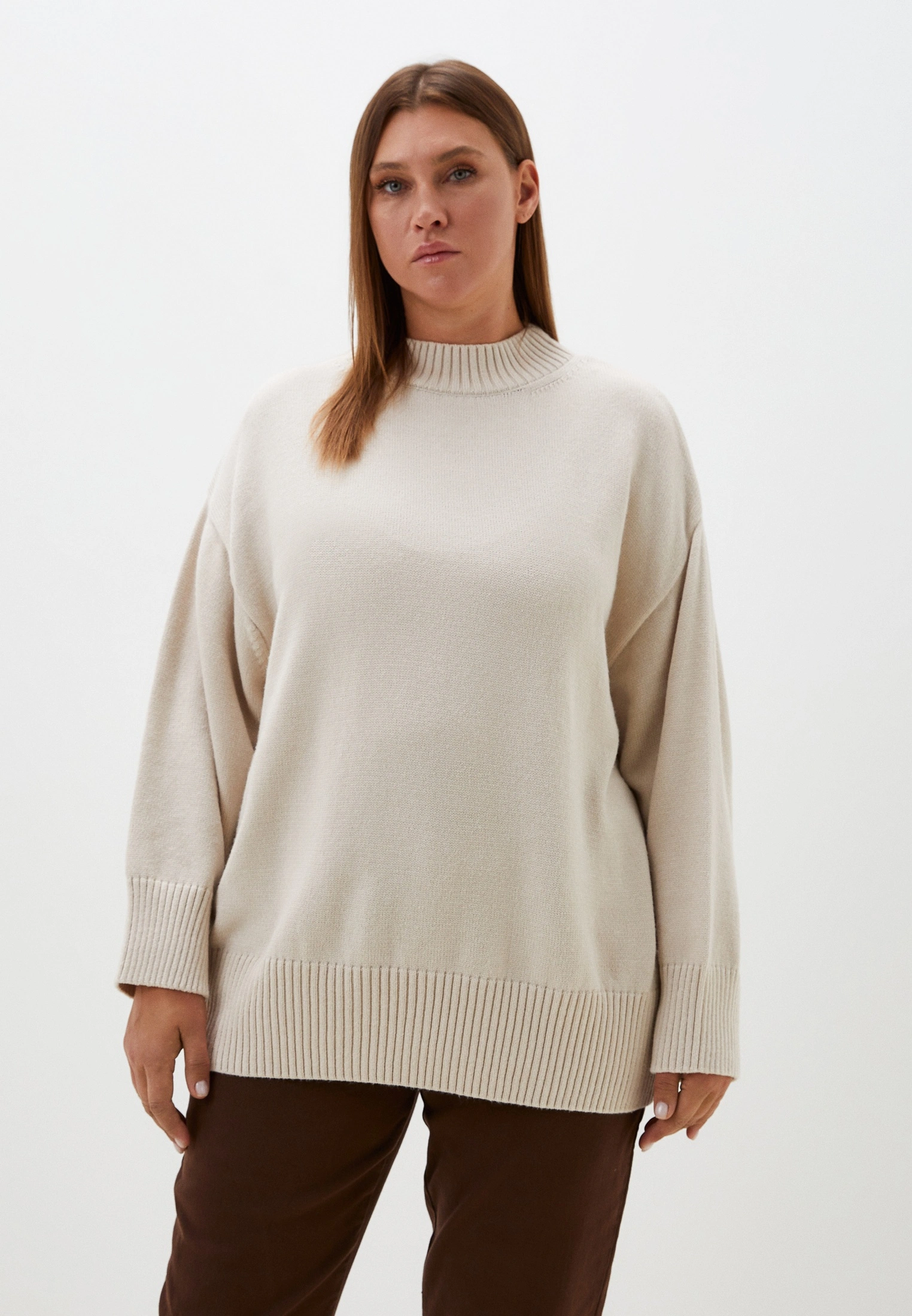 Вязаный джемпер прямого силуэта с широкой эластичной стойкой. Плечевой пояс спущенный. Рукава с широкими подвязанными манжетами. Длина джемпера чуть ниже линии бедер. Внизу изделия - широкий эластичный пояс. Выполнена модель из мягкой вискозосодержащей пряжи.