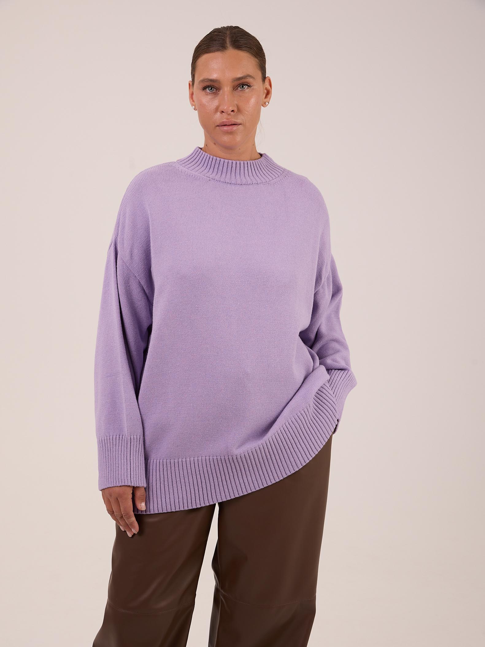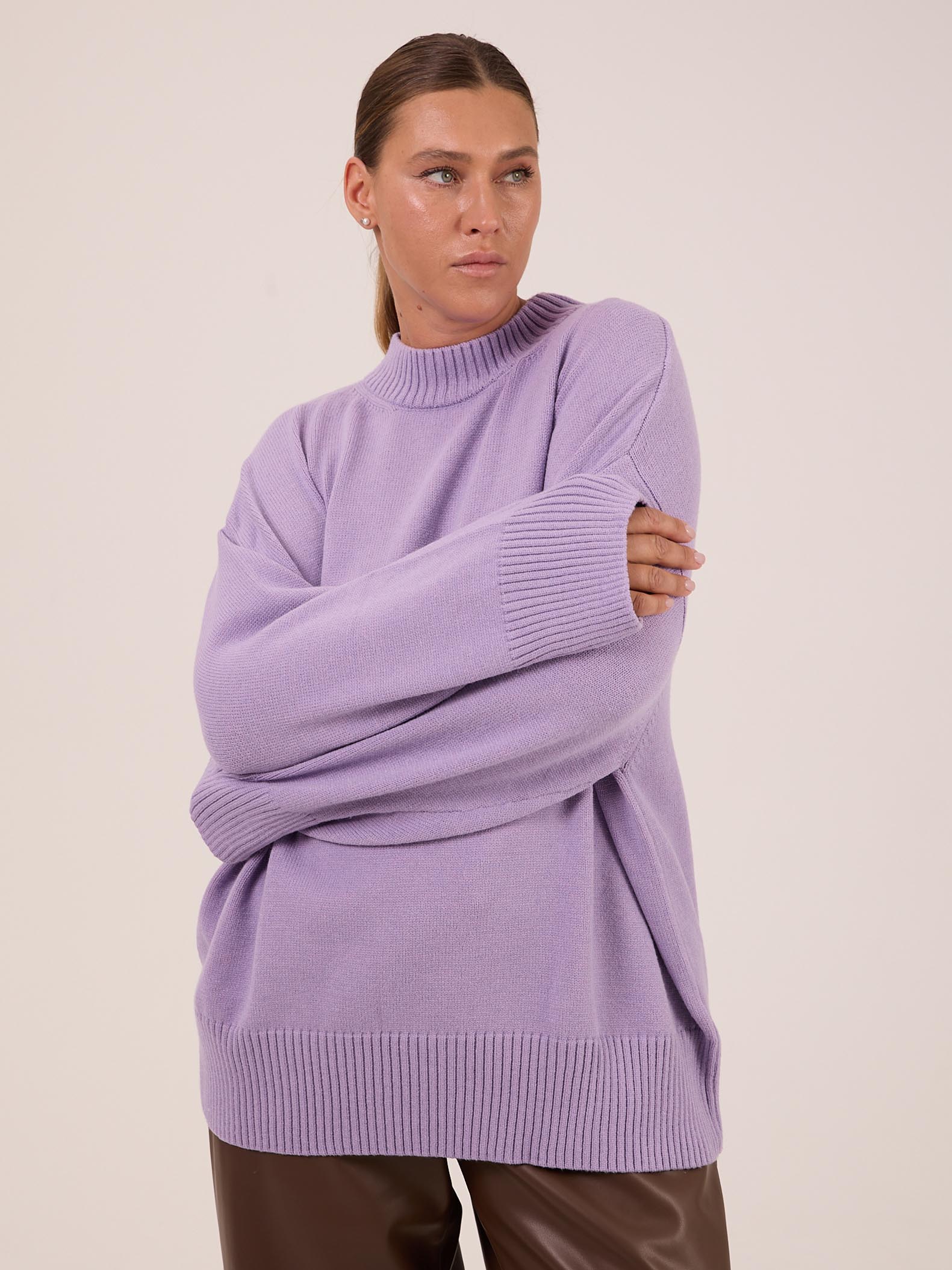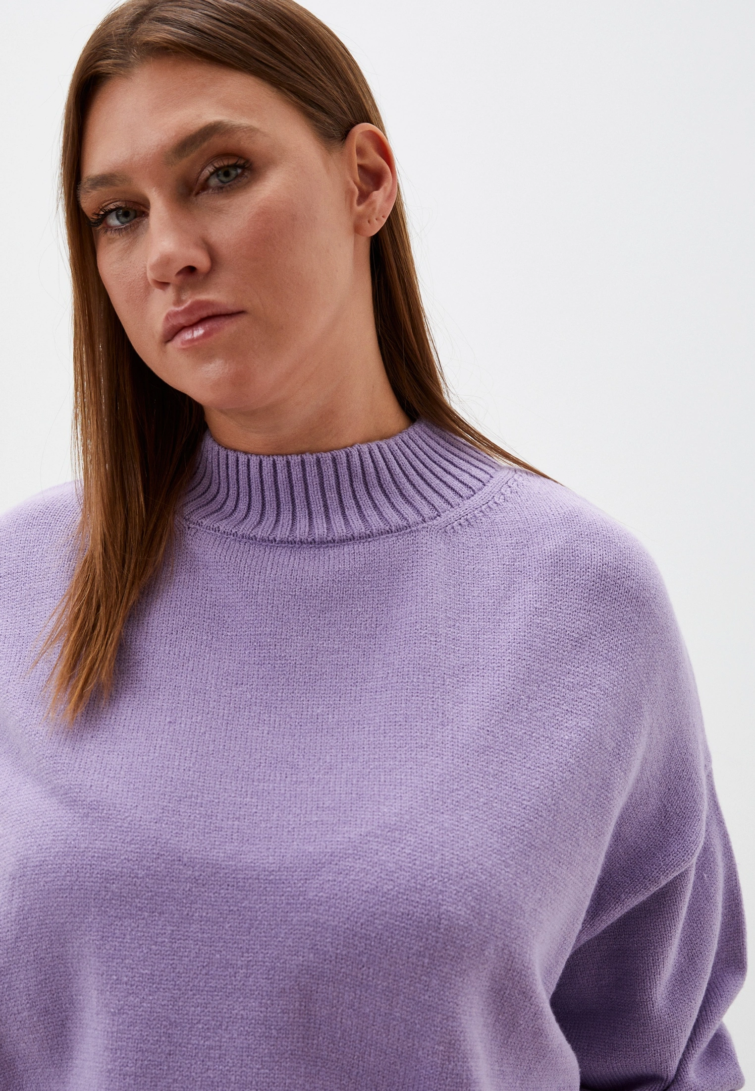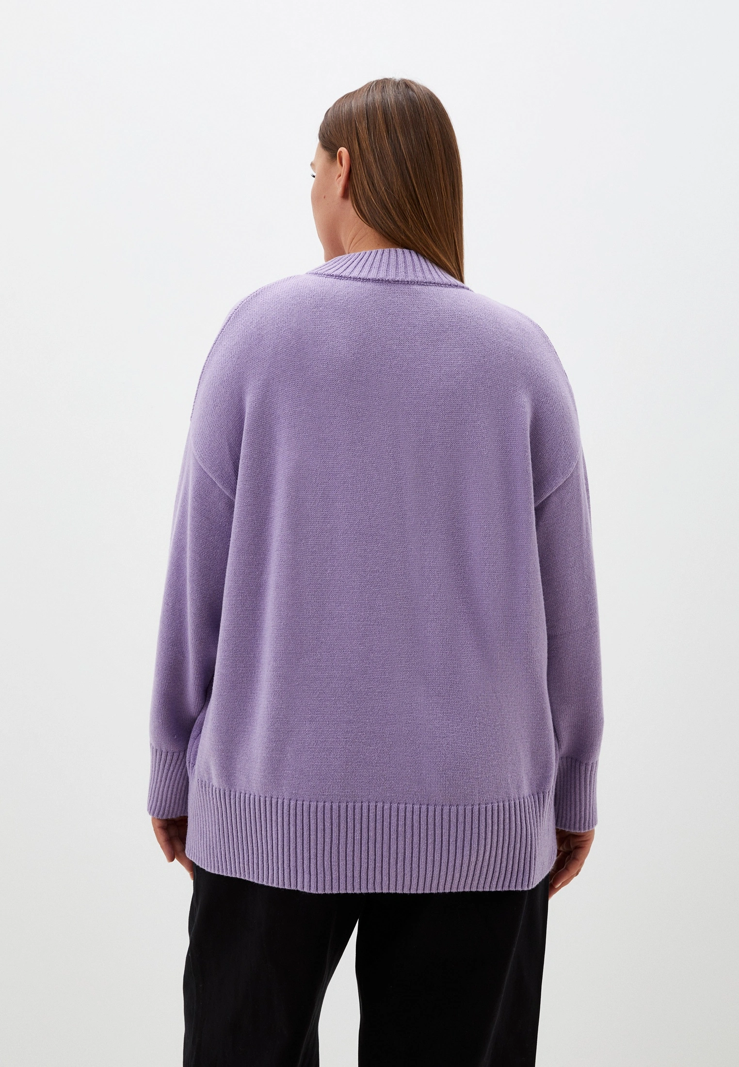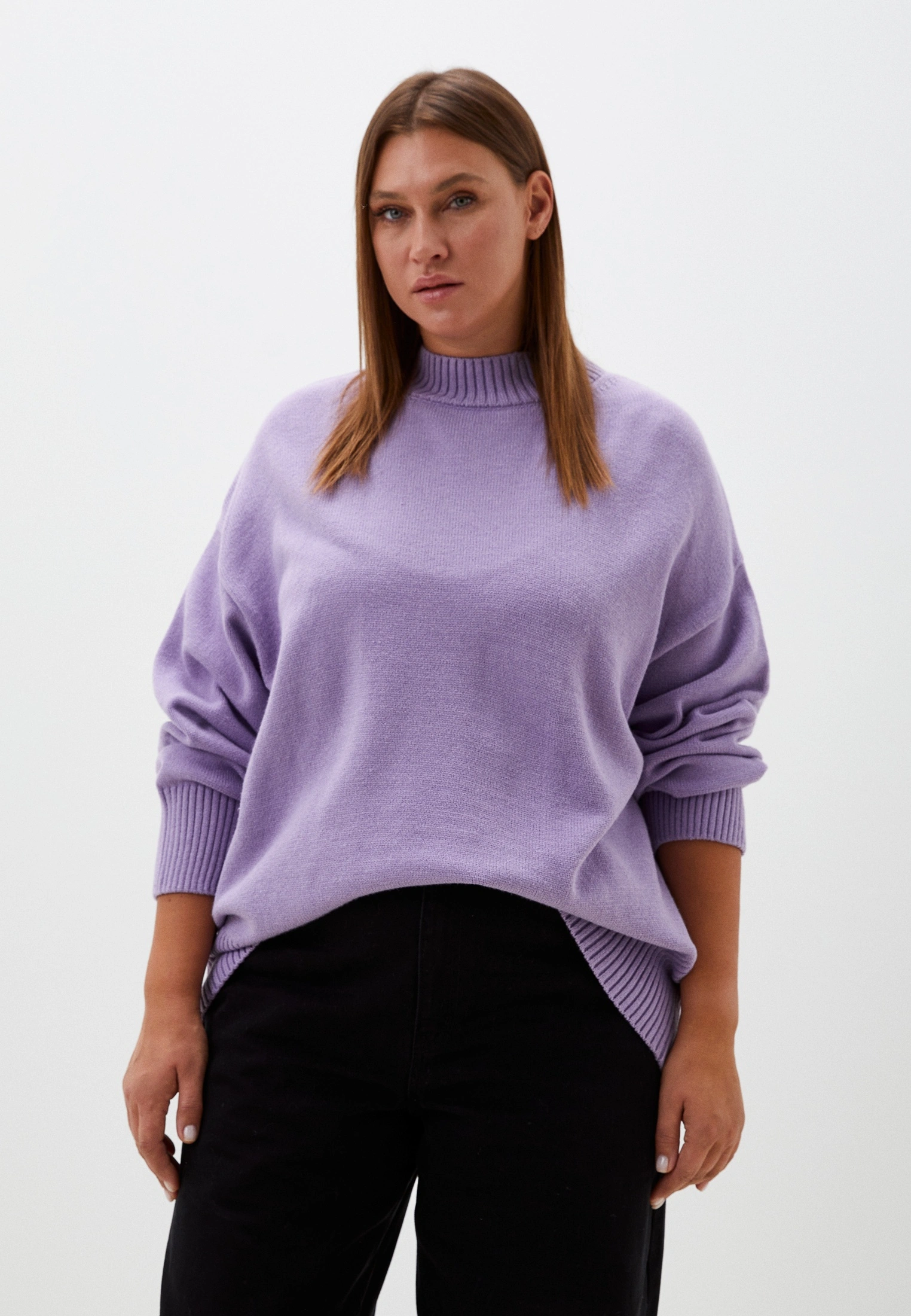 Вязаный джемпер прямого силуэта с широкой эластичной стойкой. Плечевой пояс спущенный. Рукава с широкими подвязанными манжетами. Длина джемпера чуть ниже линии бедер. Внизу изделия - широкий эластичный пояс. Выполнена модель из мягкой вискозосодержащей пряжи.