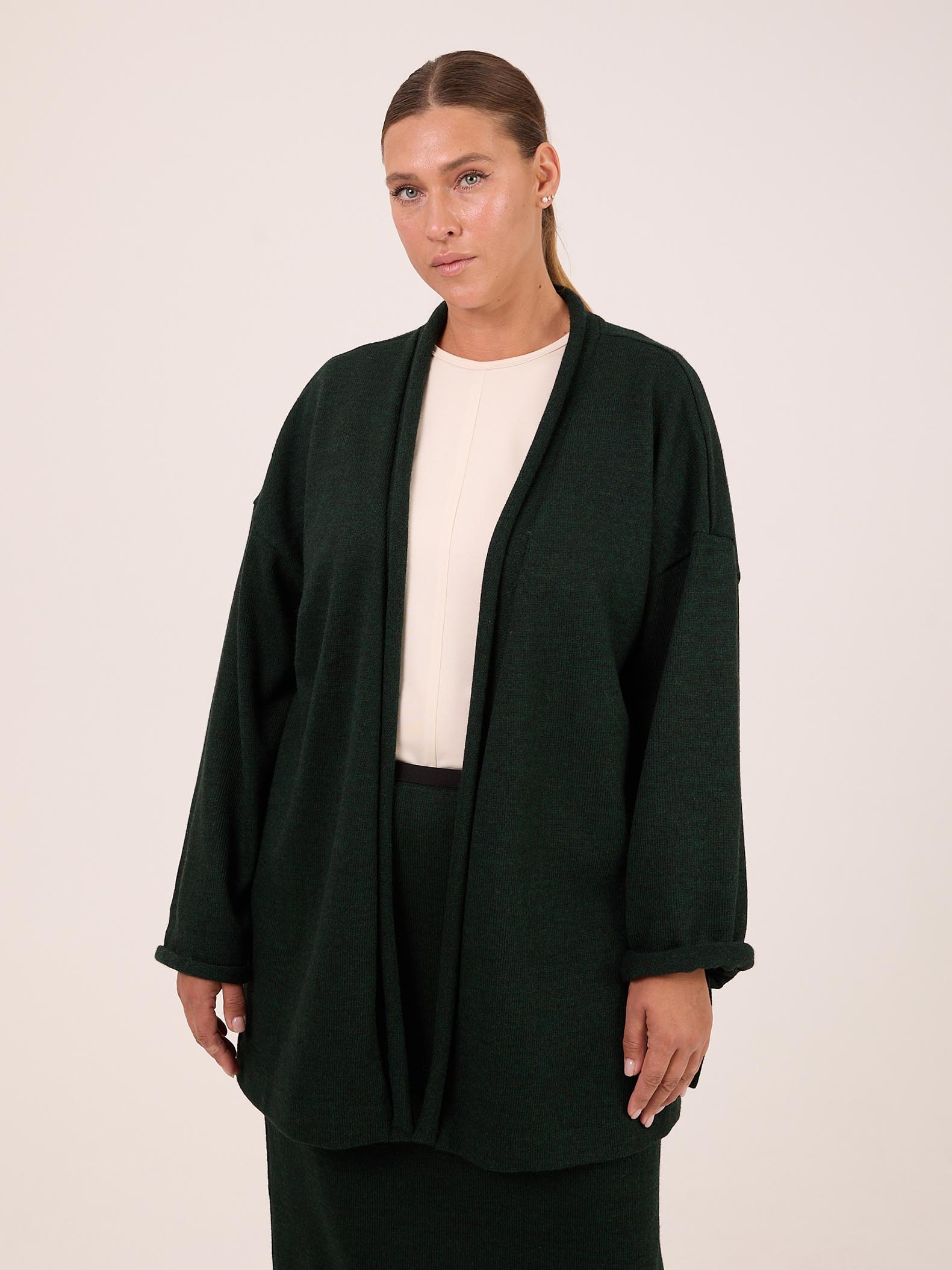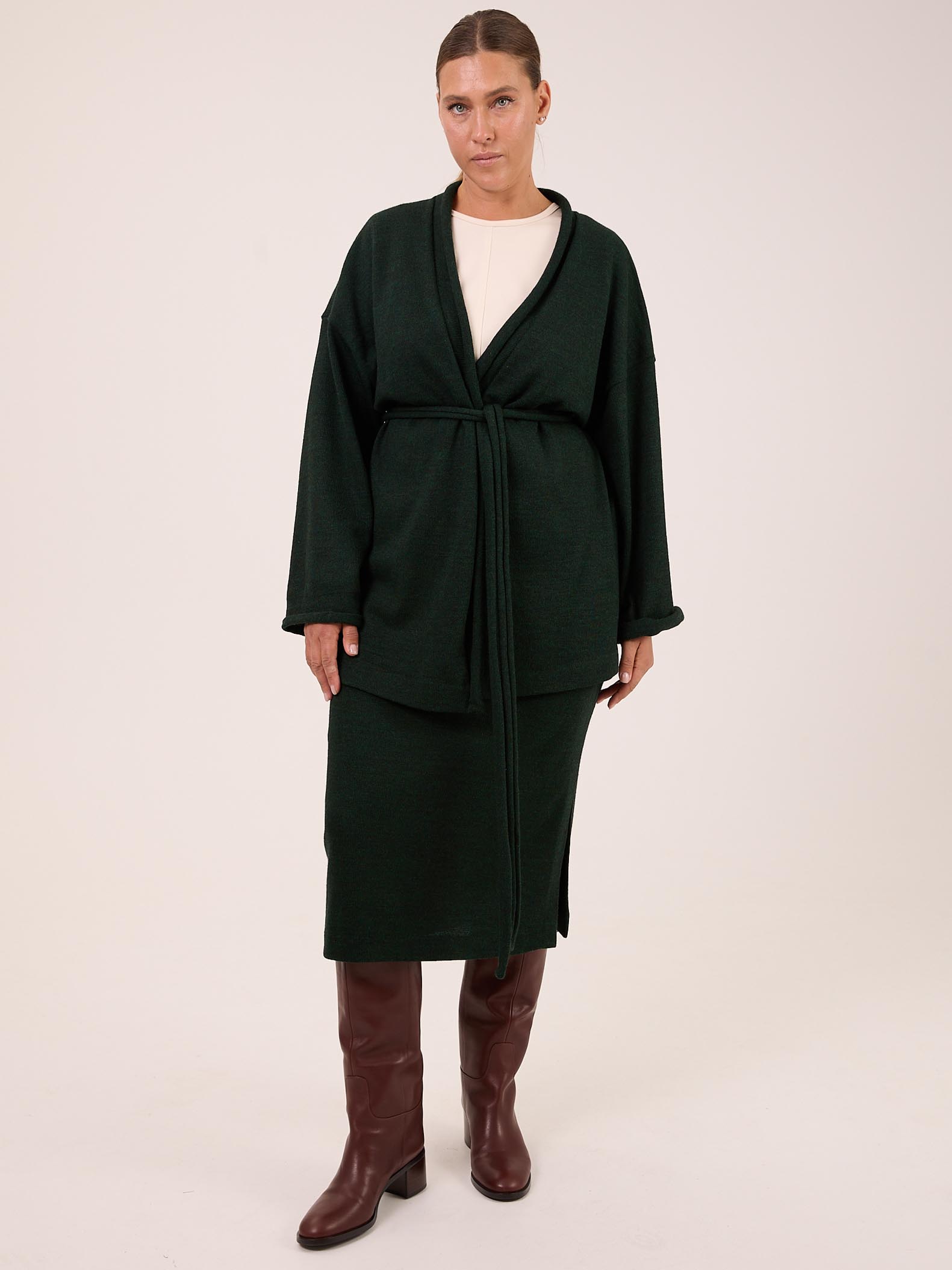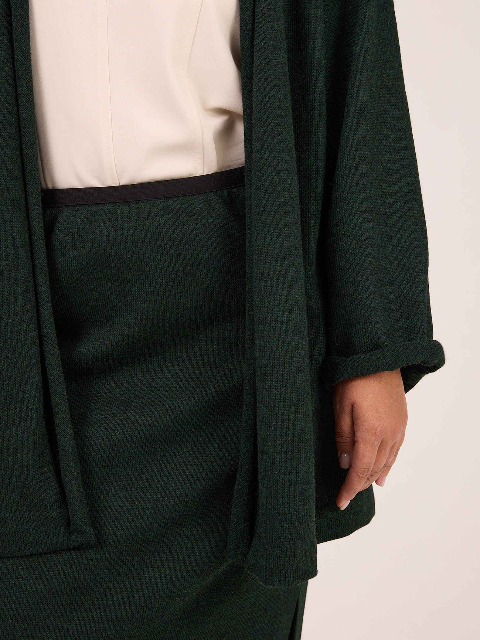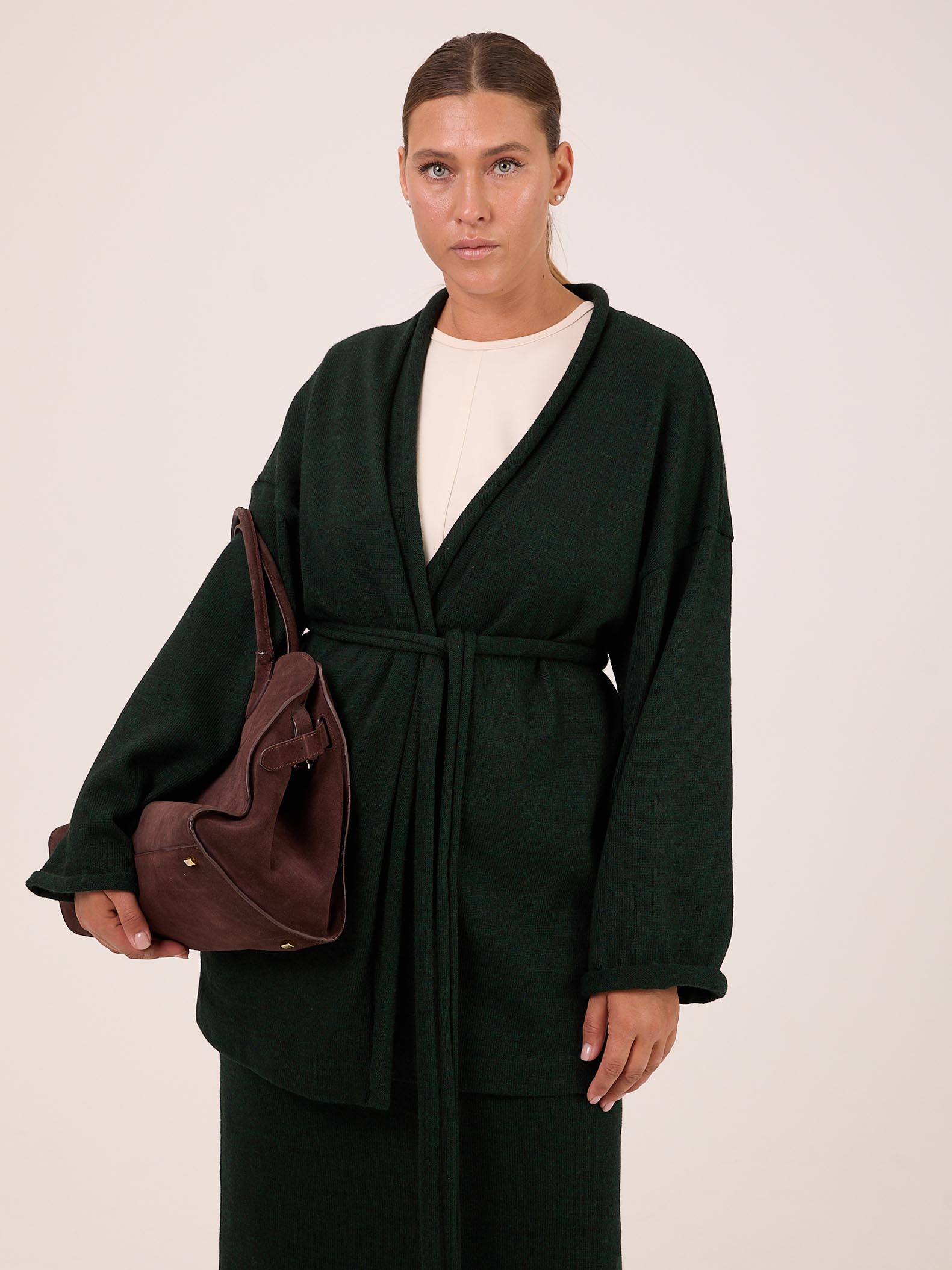 Кардиган является частью костюма AGNESSA. Трикотажный кардиган оверсайз на запах со съемным поясом. Низ рукава и край борта обработаны открытым срезом. Изделие выполнено из шерстяного трикотажа в темно-зеленом цвете.