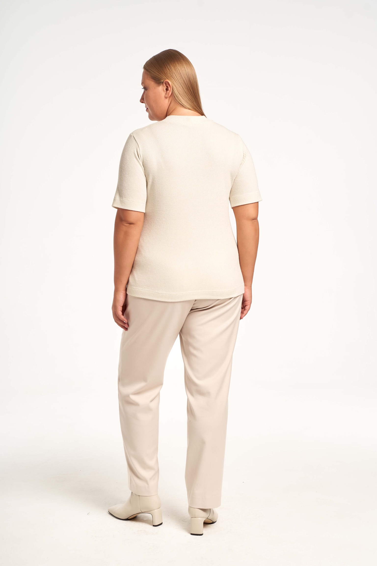 Трикотажный блузон с короткими рукавами. Вырез горловины круглый, с невысокой стойкой. Блузон прямого кроя, длиной до линии бедер. Выполнен из мягкого вискозного трикотажа с люрексом.