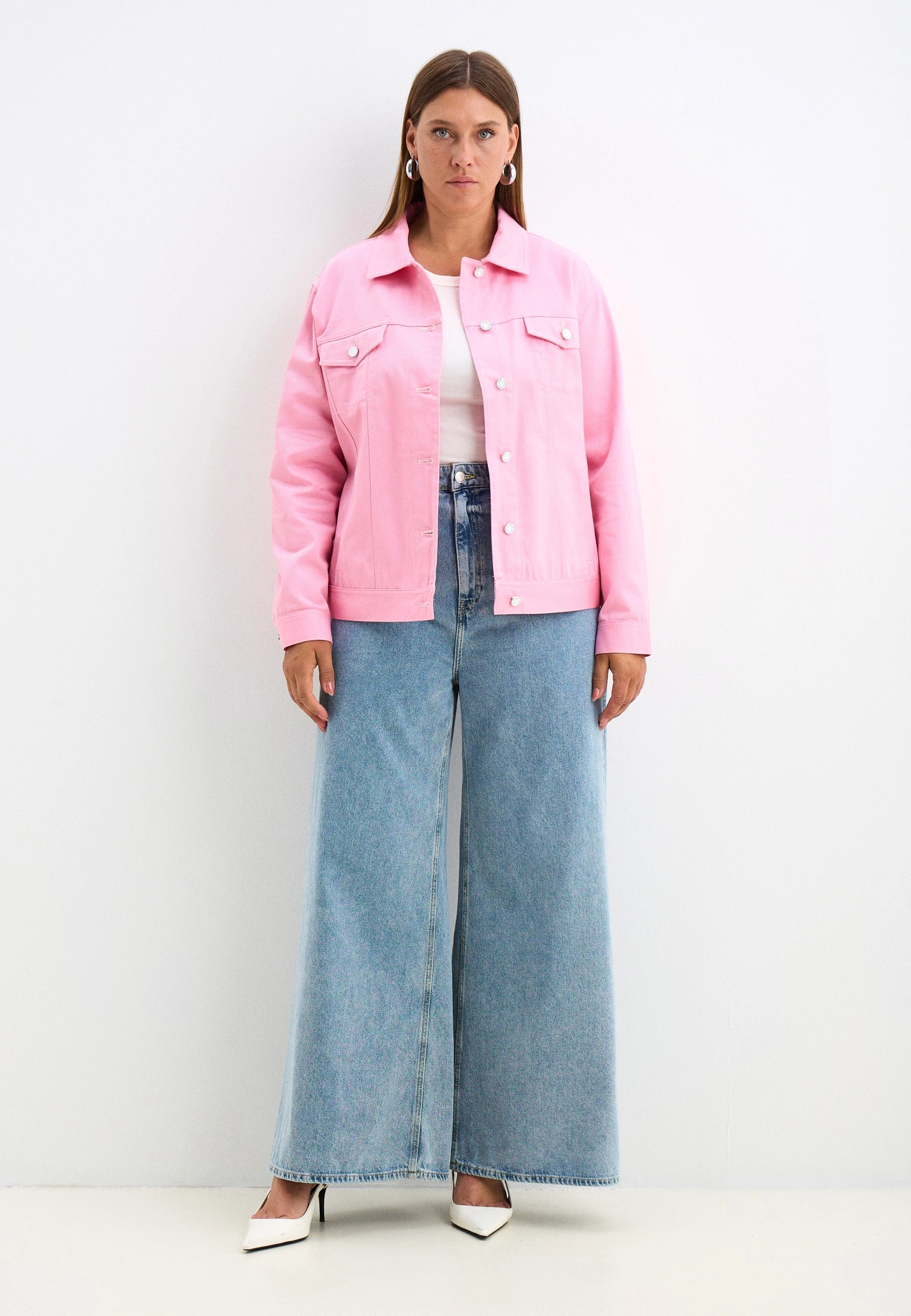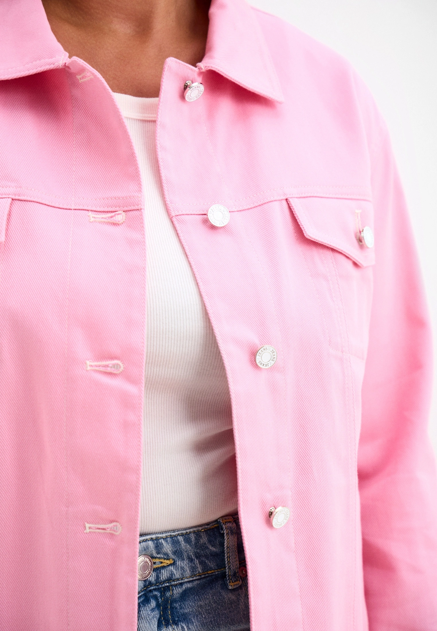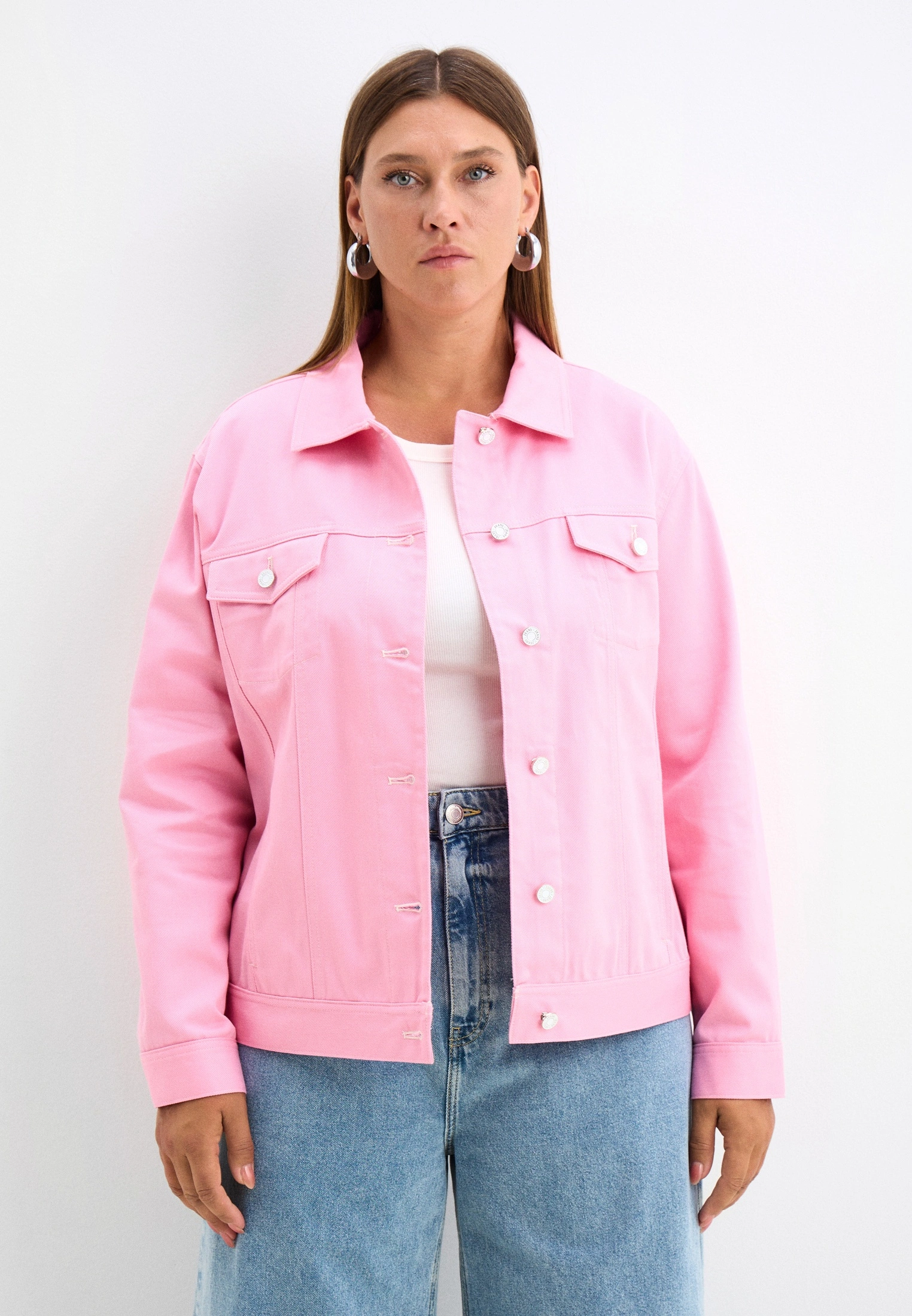 Куртка прямого кроя, длиной до бедер. Воротник отложной. Плечевой пояс приспущен, рукава двухшовные с манжетами. На спинке и полочке отрезные кокетки. На модели выполнены нагрудные карманы с клапанами и боковые карманы в рельефах. По низу изделия притачной пояс. Куртка и манжеты рукавов застегиваются на болты и петли. Модель выполнена из 100% хлопка в молочном, желтом и розовом цветах.