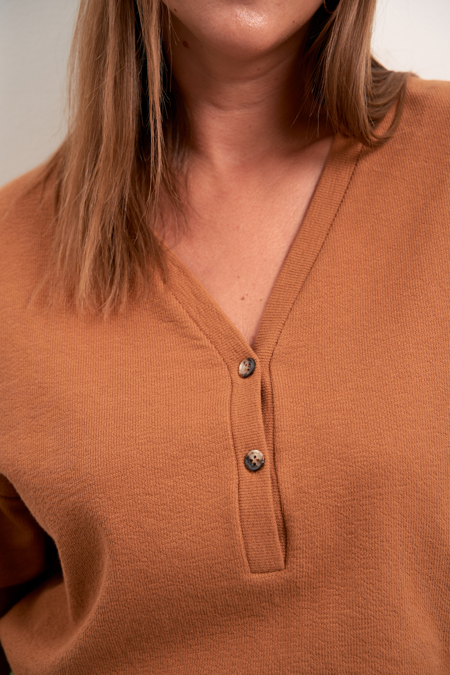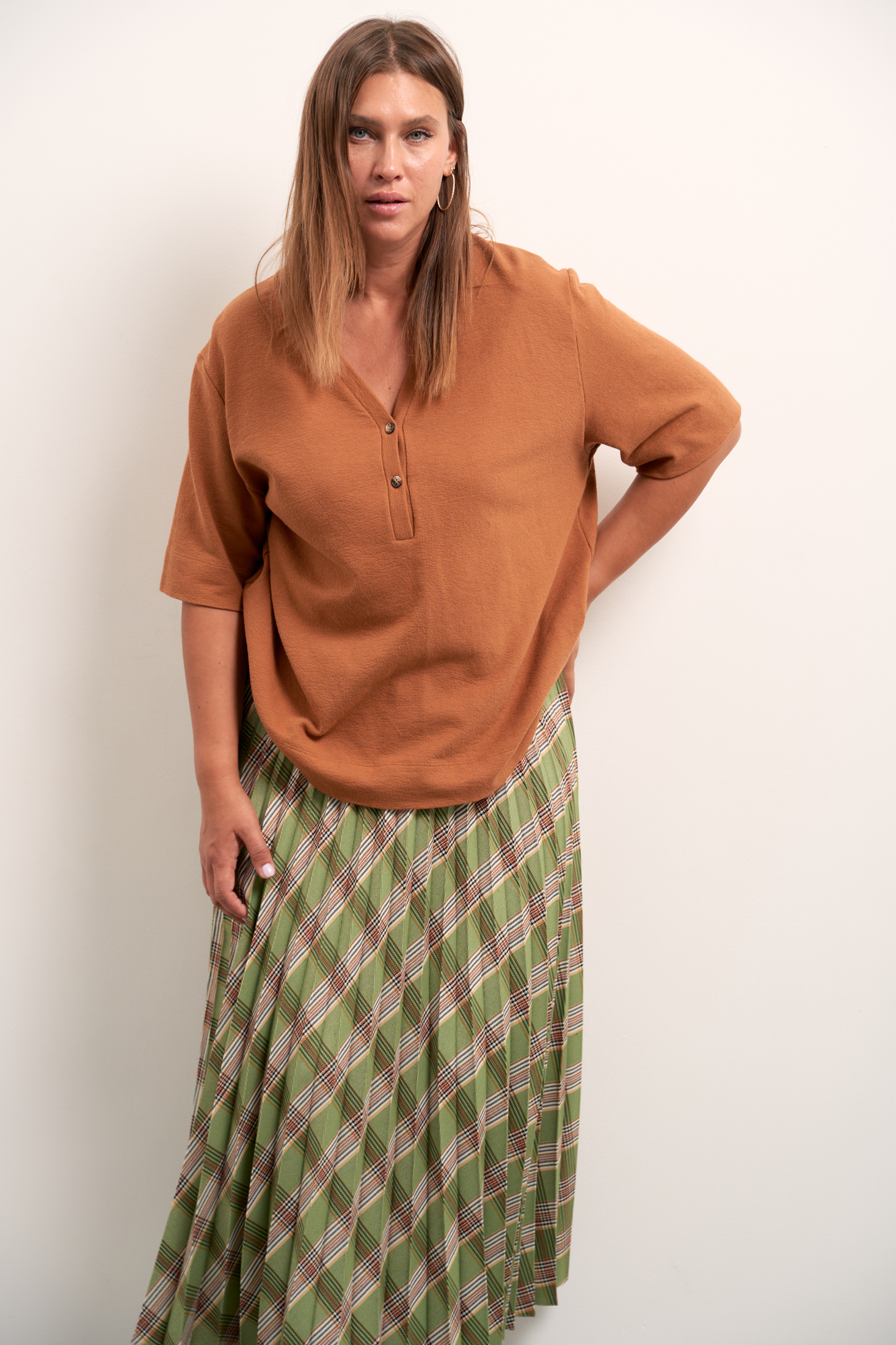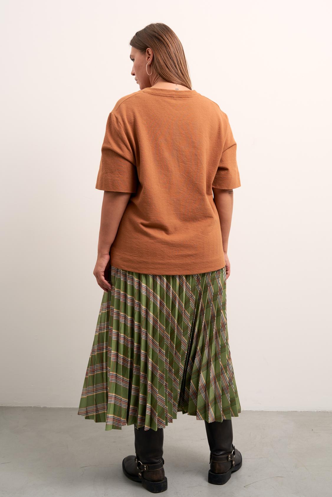Блузон прямого свободного силуэта. Плечевой пояс спущен, рукава прямые, короткие. Горловина обработана планкой «поло» с пуговицами. Длина изделия чуть ниже линии бедер. Изделие выполнено из хлопкового трикотажа в черном и коричневом цветах.