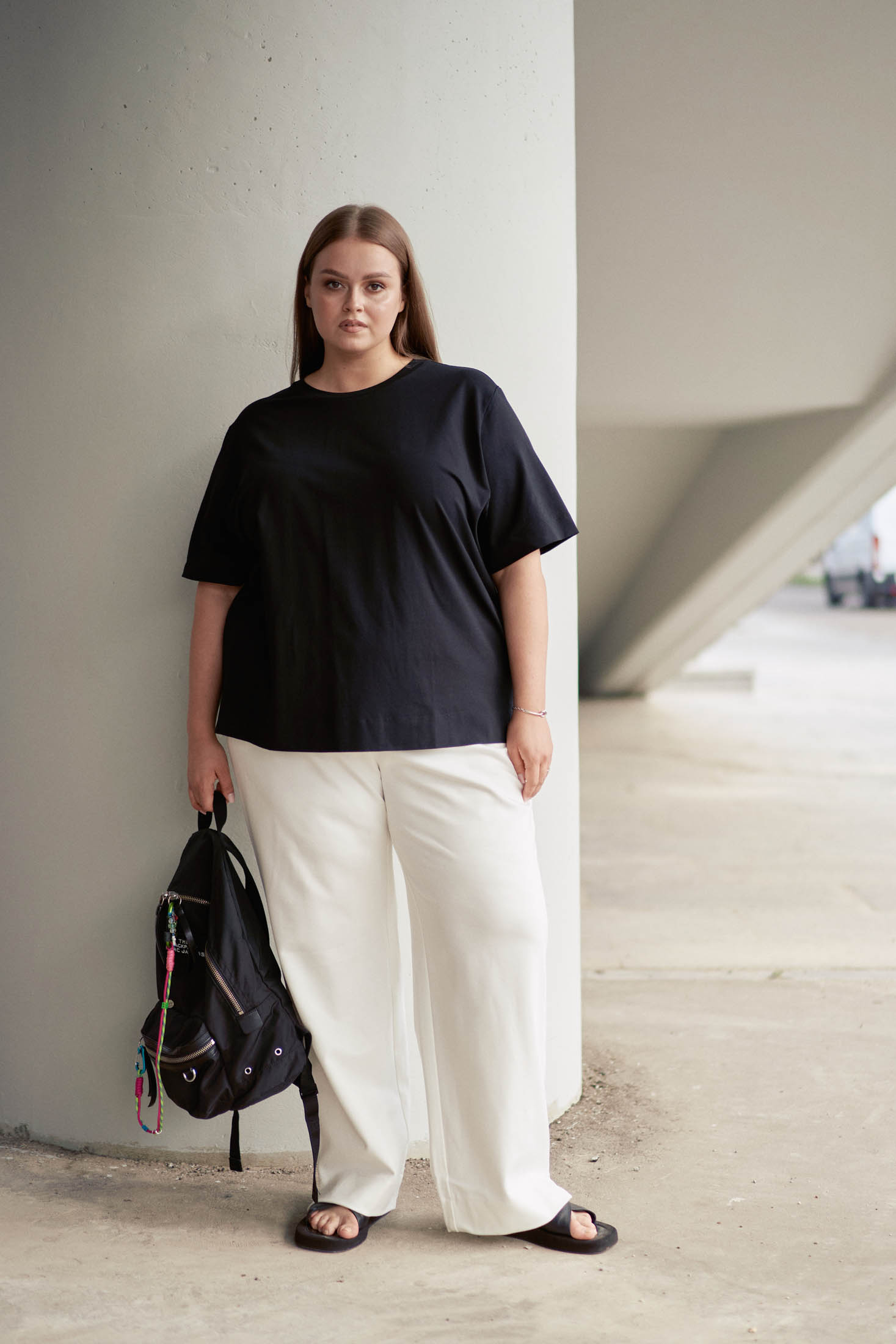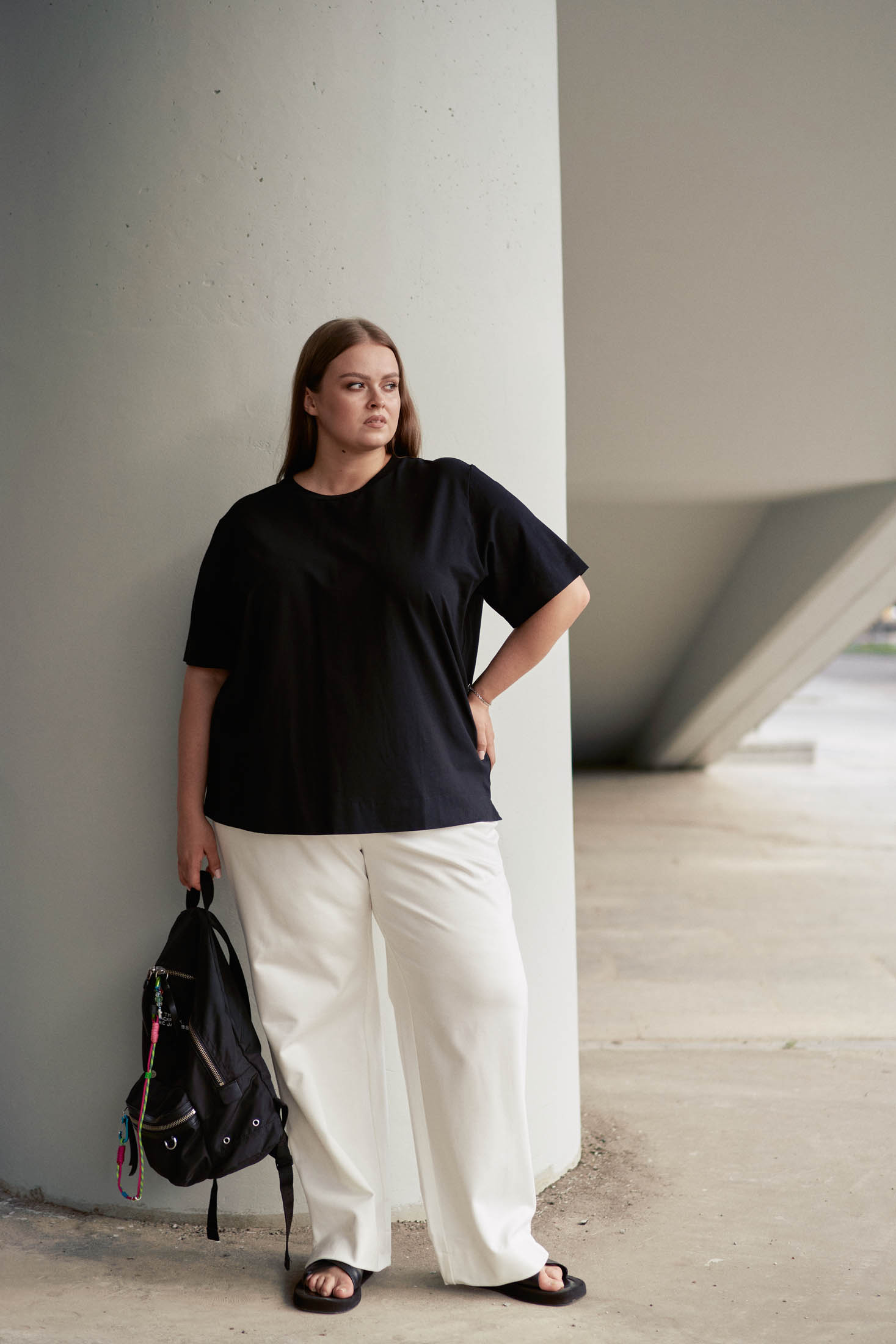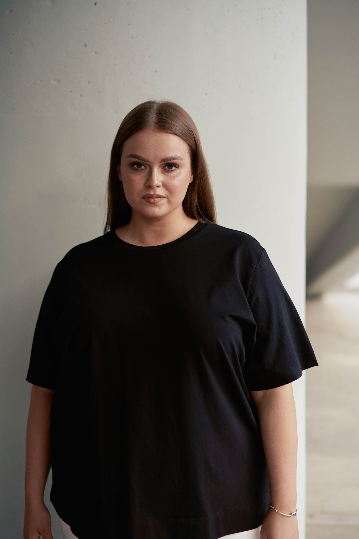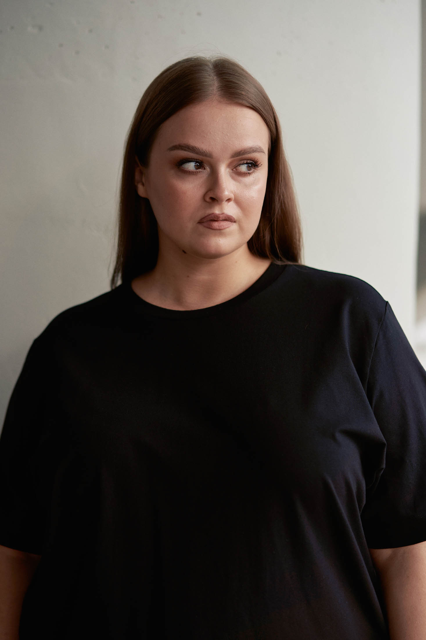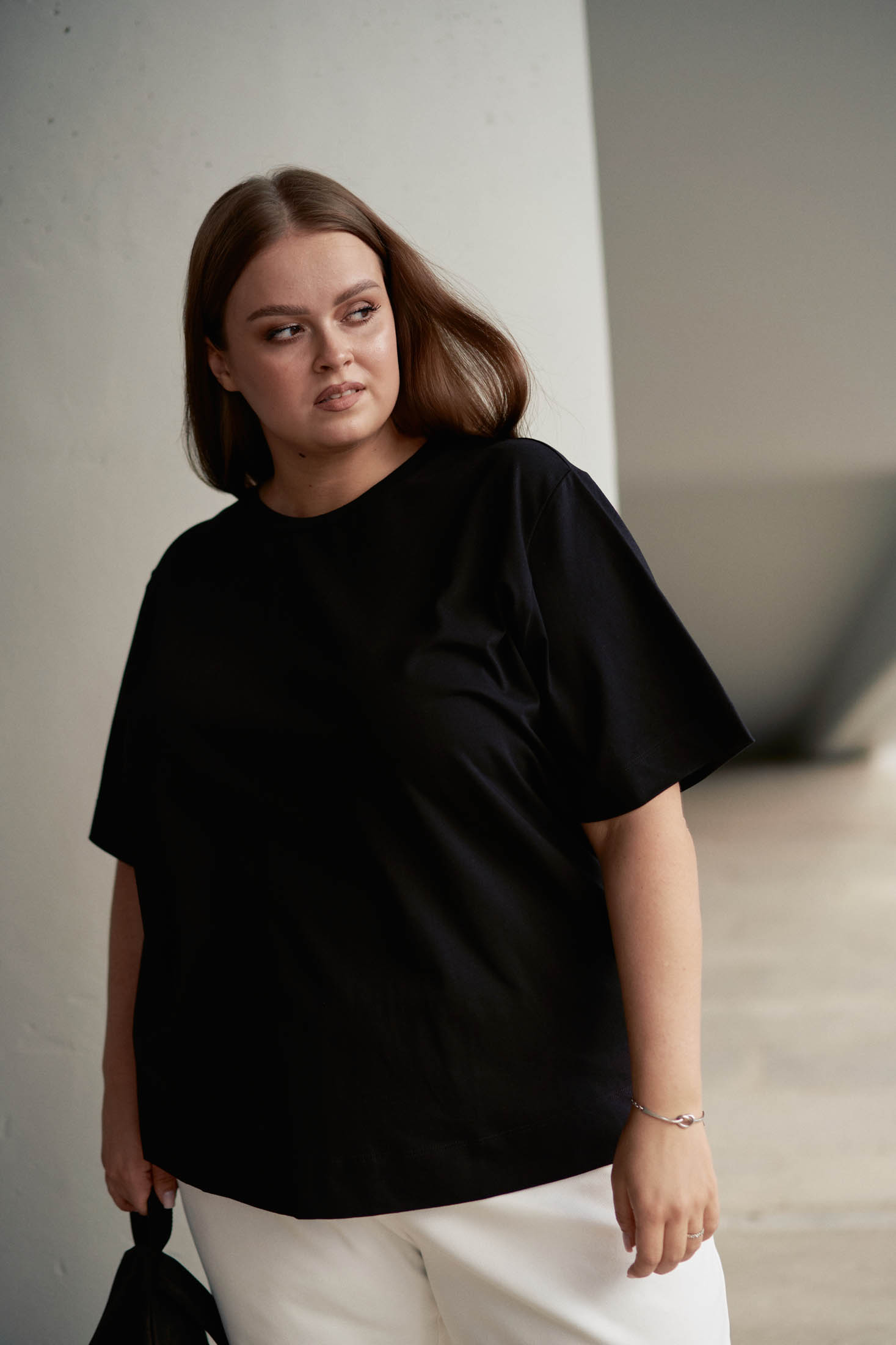 Блузон типа Т-shirt прямого силуэта, длиной до бедер. Рукава короткие прямые, вырез горловины круглый. В боковых швах небольшие разрезы. Рукава и низ изделия имеют широкую эффектную подгибку.