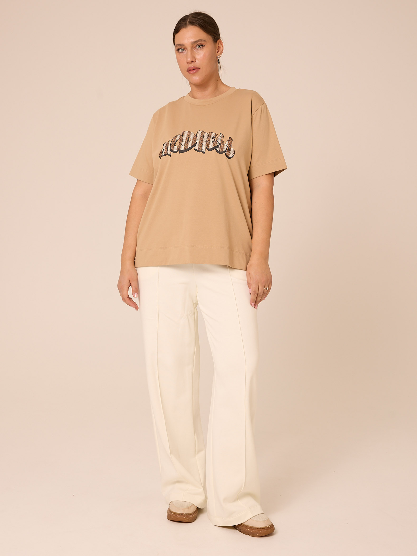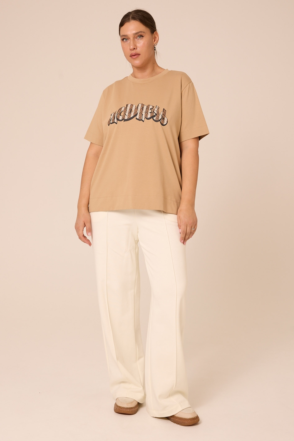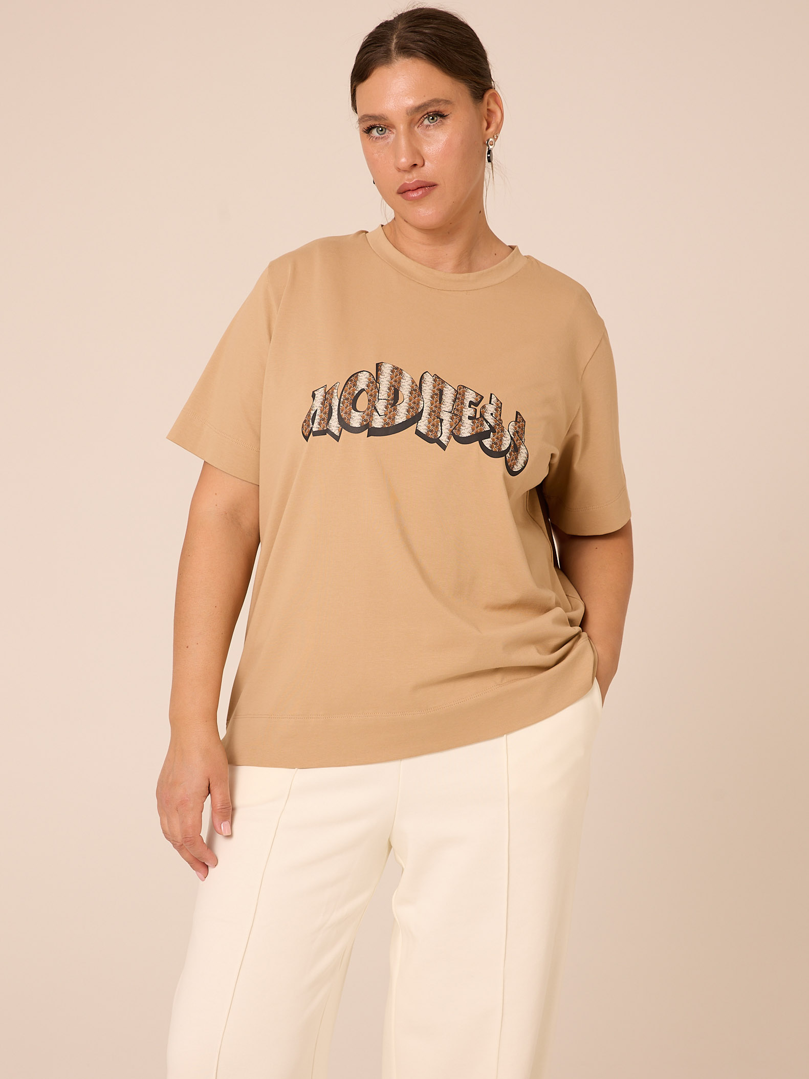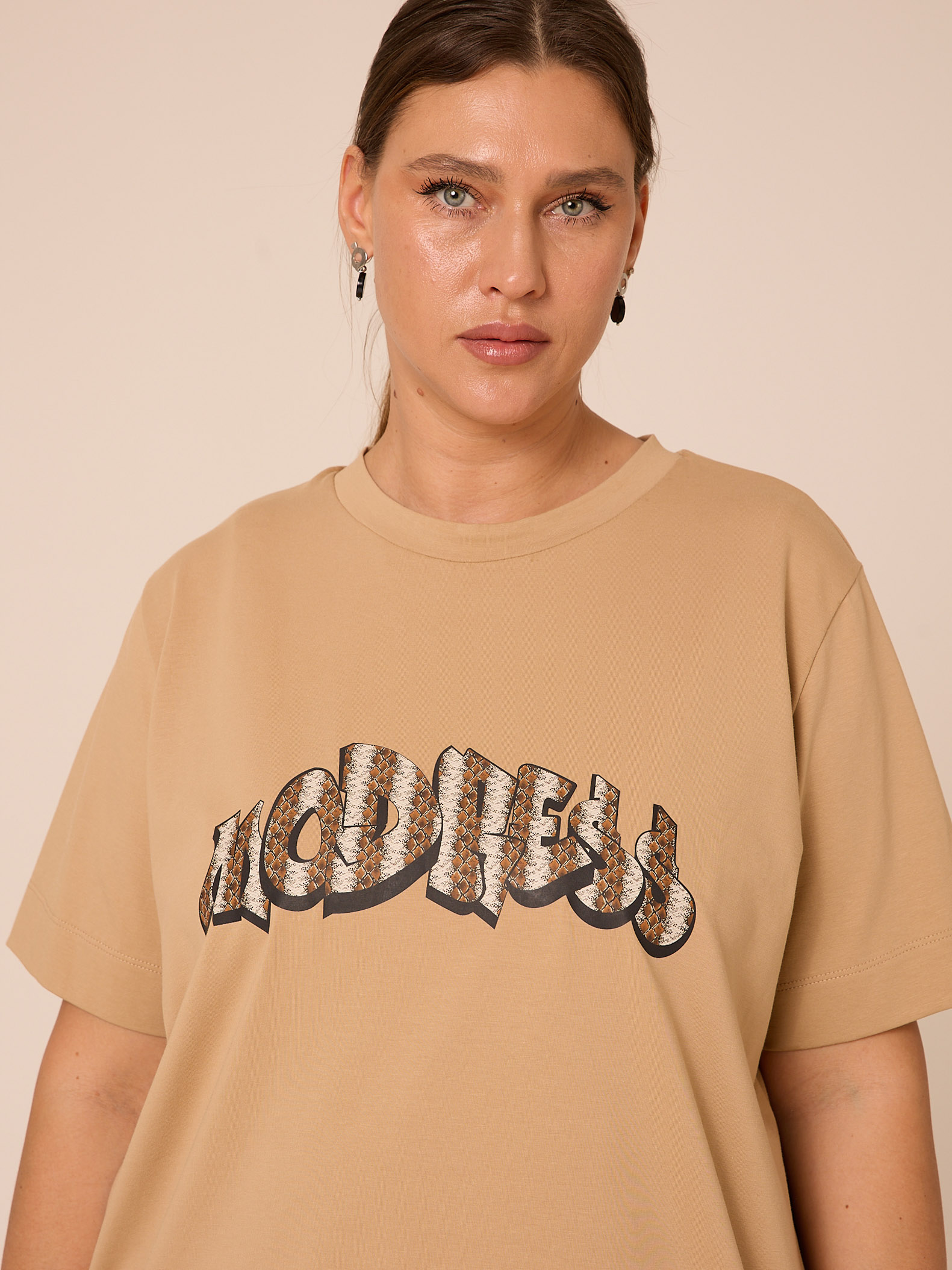 прямого силуэта, длиной до бедер. Рукава короткие прямые, вырез горловины круглый. В боковых швах небольшие разрезы. Рукава и низ изделия имеют широкую эффектную подгибку. Принт термопленка.