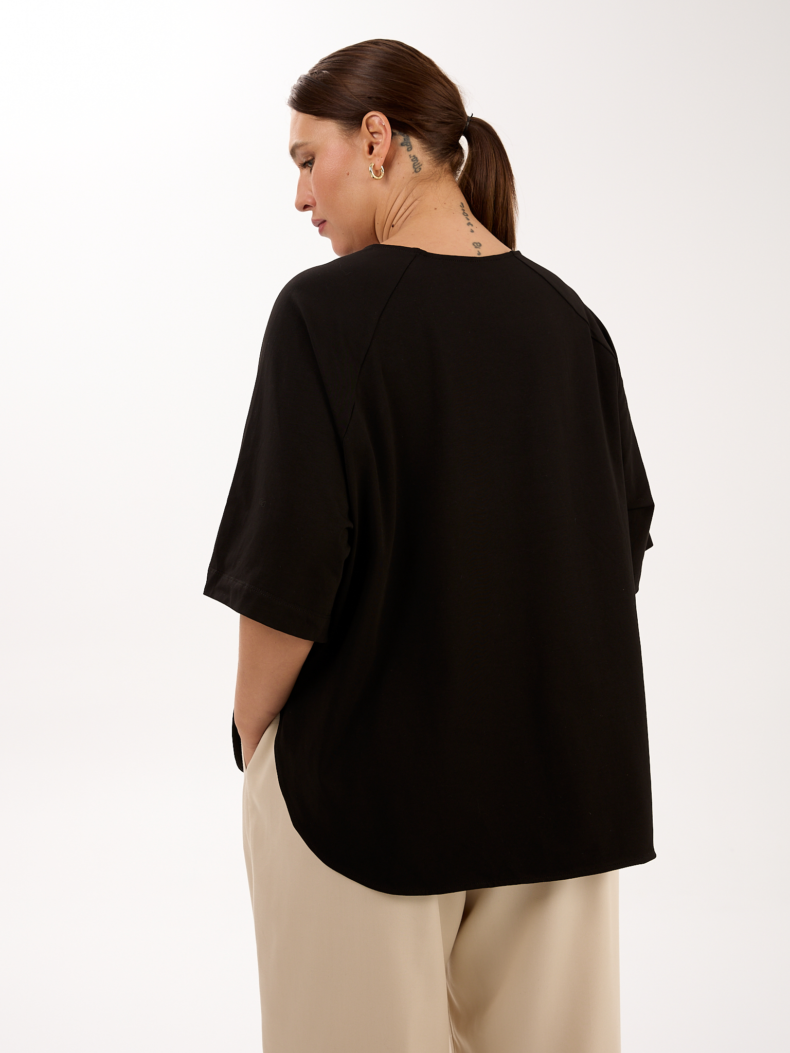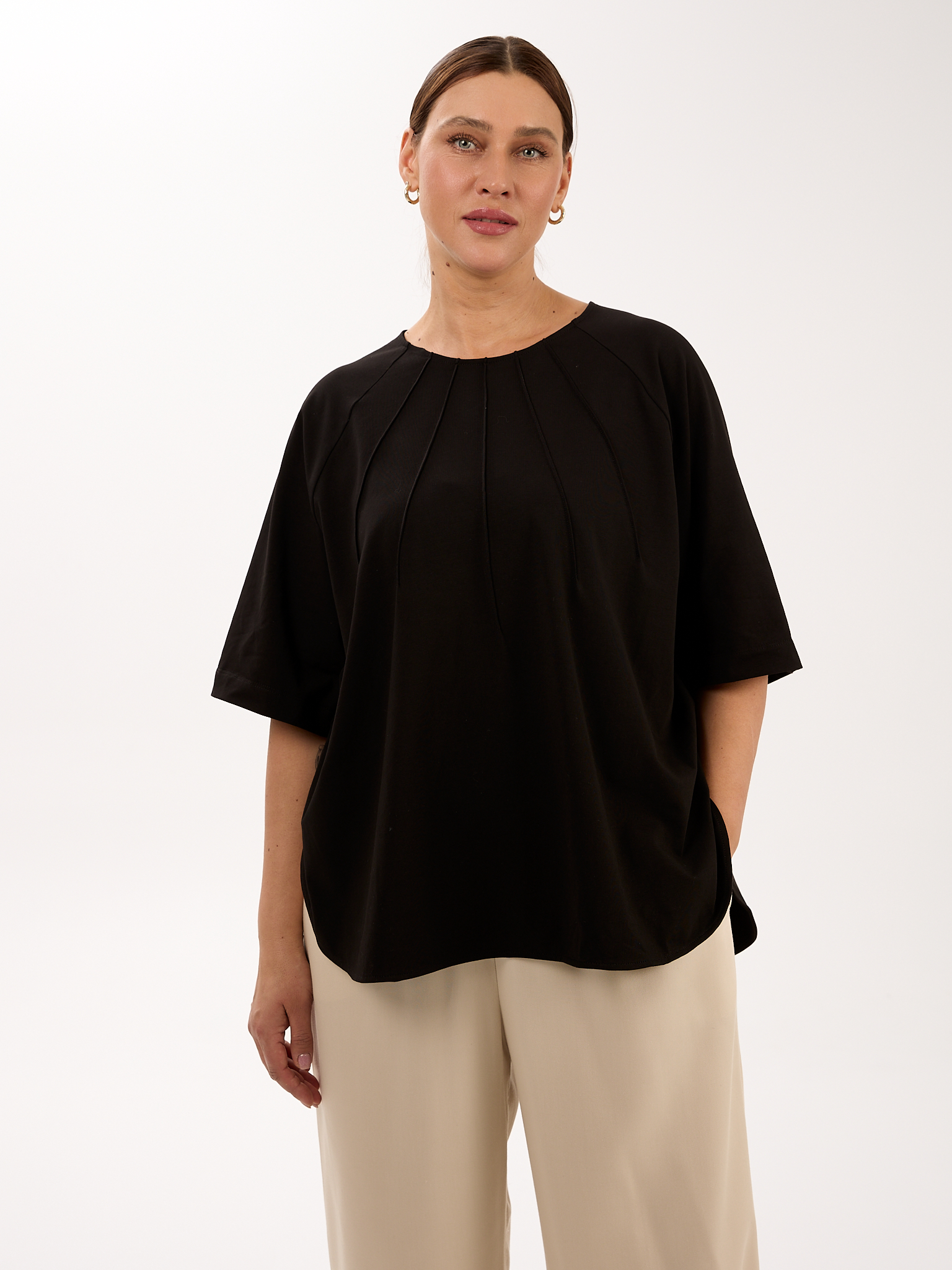 Объемный блузон прямого кроя. Вырез горловины круглый. Рукава – реглан, широкие, длиной до локтя. В боковых швах глубокие закругленные разрезы. Блузон выполнен из эластичного хлопкового трикотажа