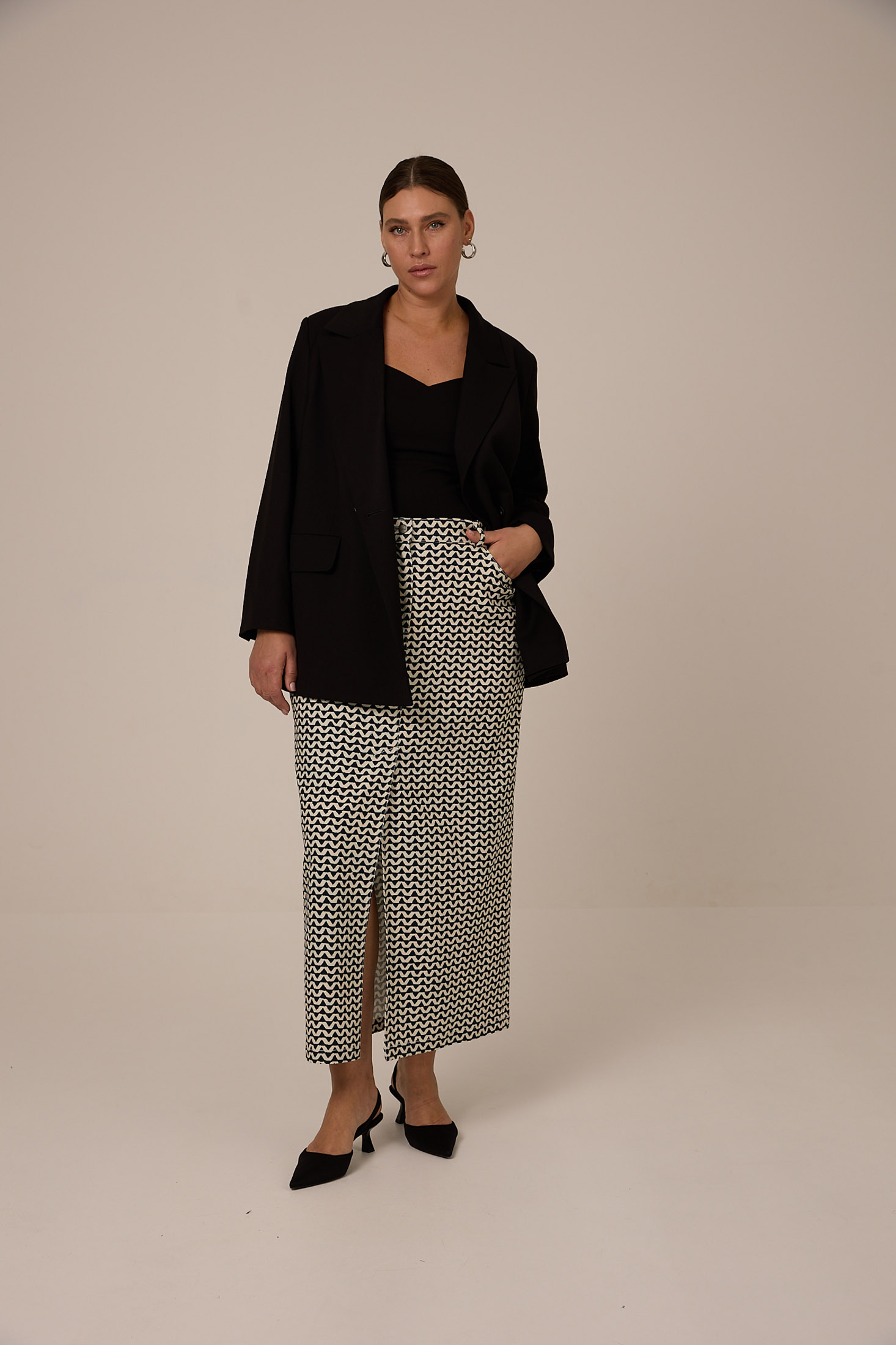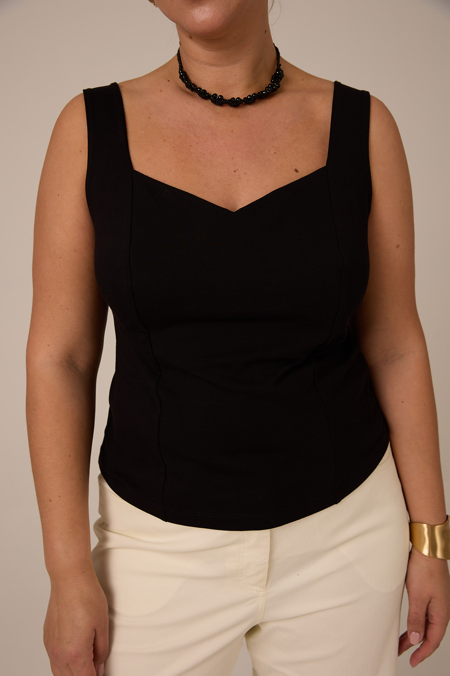 Облегающий, приталенный топ с фигурным вырезом на широких лямках. Выполнен из хлопкового трикотажа в двух цветах черном и молочном.