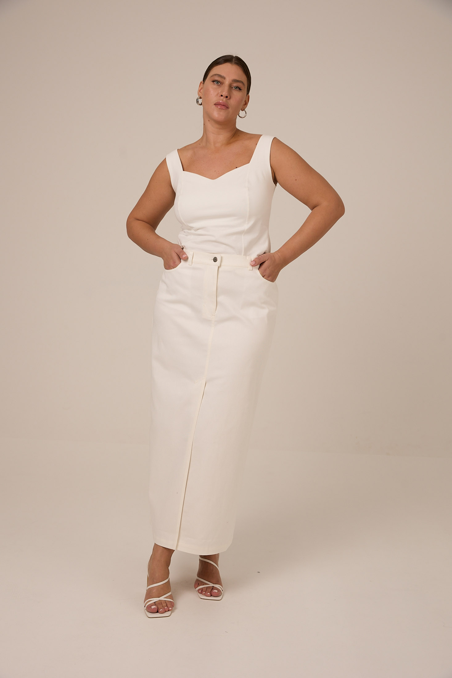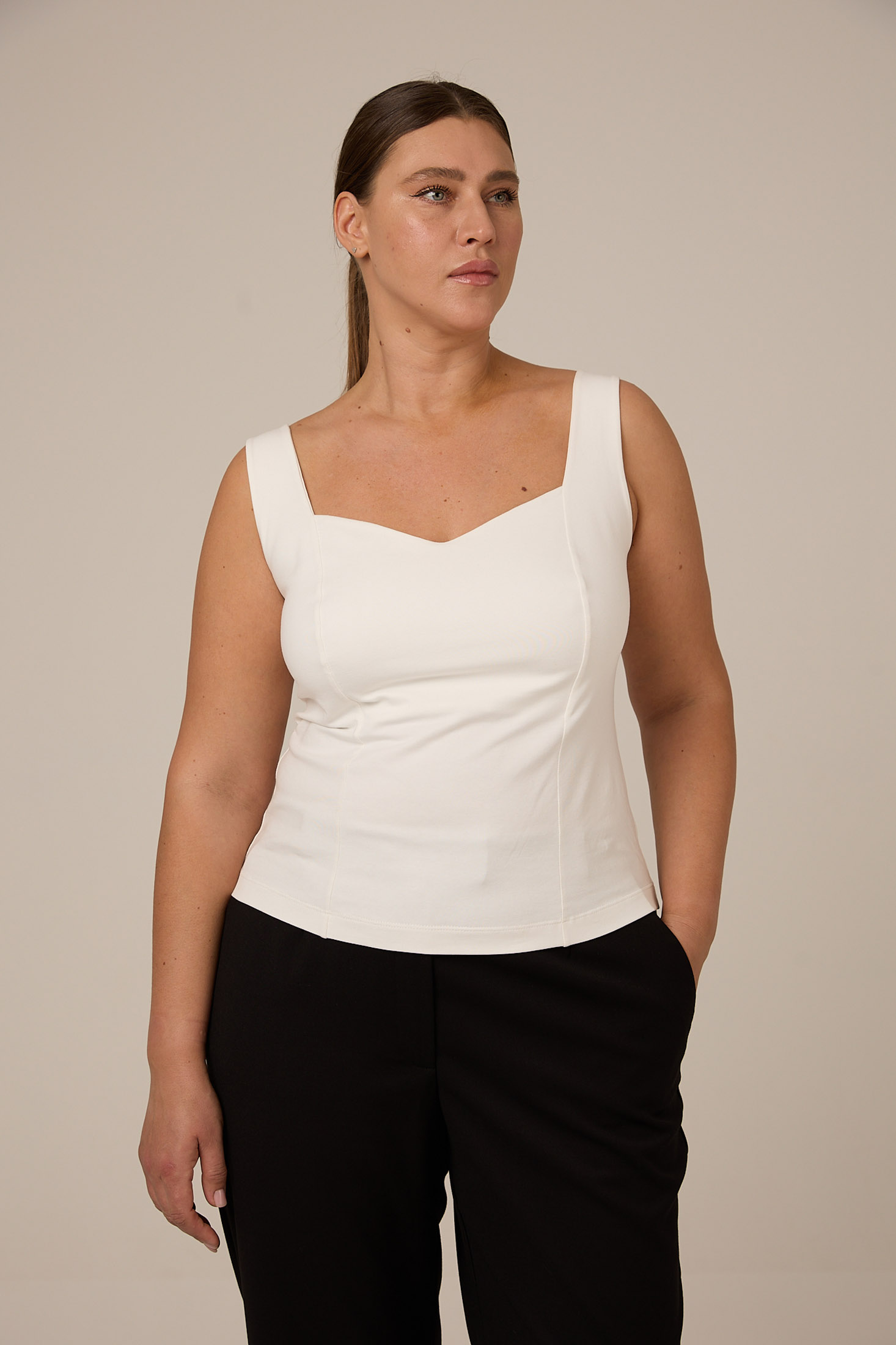 Облегающий, приталенный топ с фигурным вырезом на широких лямках. Выполнен из хлопкового трикотажа в двух цветах черном и молочном.