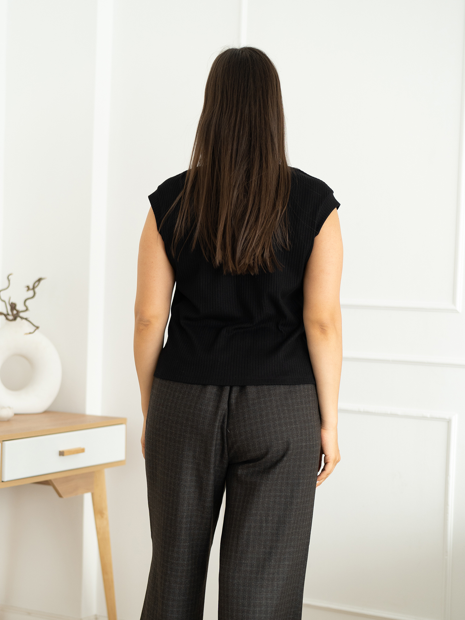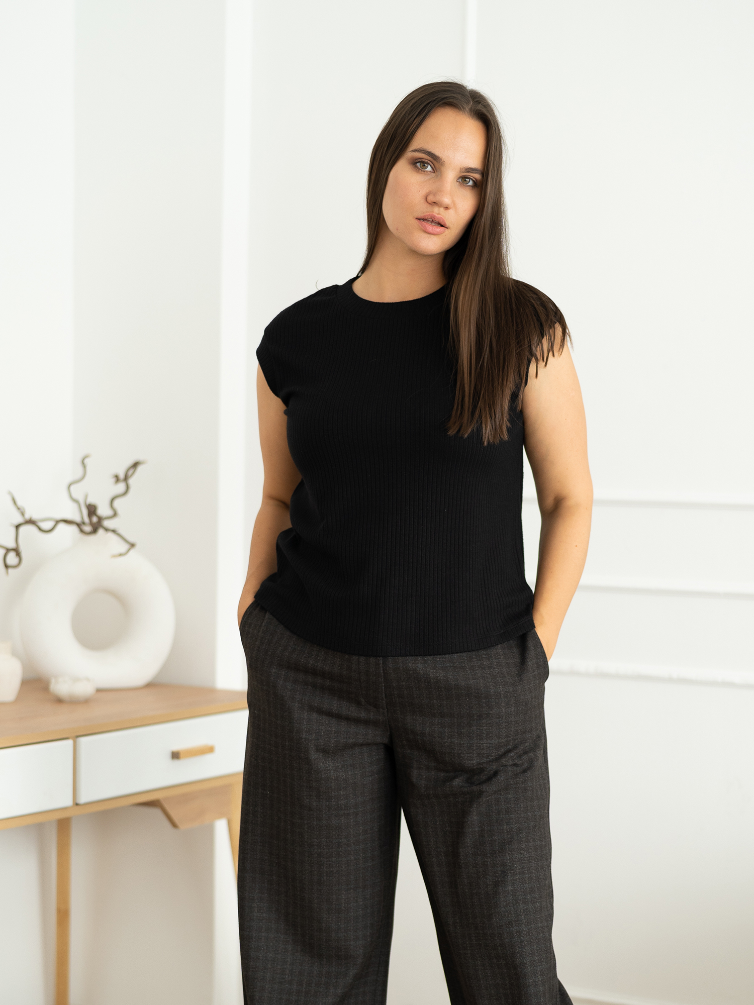 Топ лапша. Трикотажный топ-майка с увеличенной шириной плеча. Вырез горловины круглый. Выполнен из вискозосодержащего трикотажа в черном цвете.