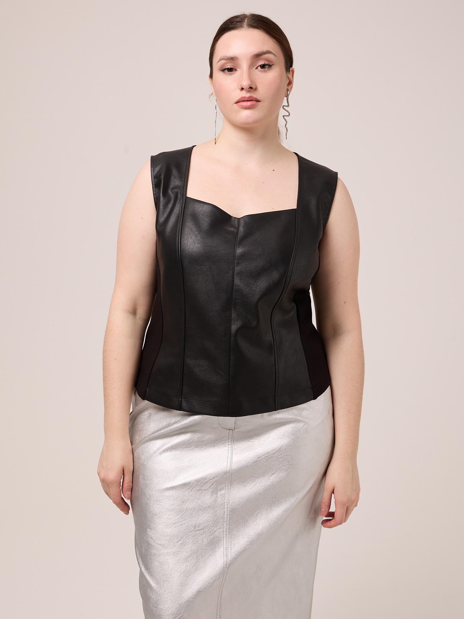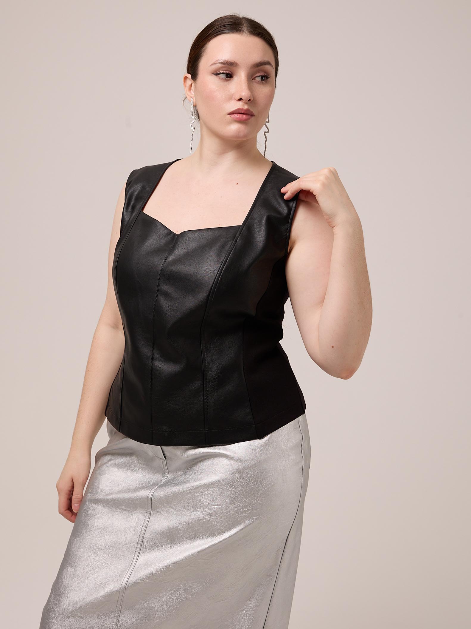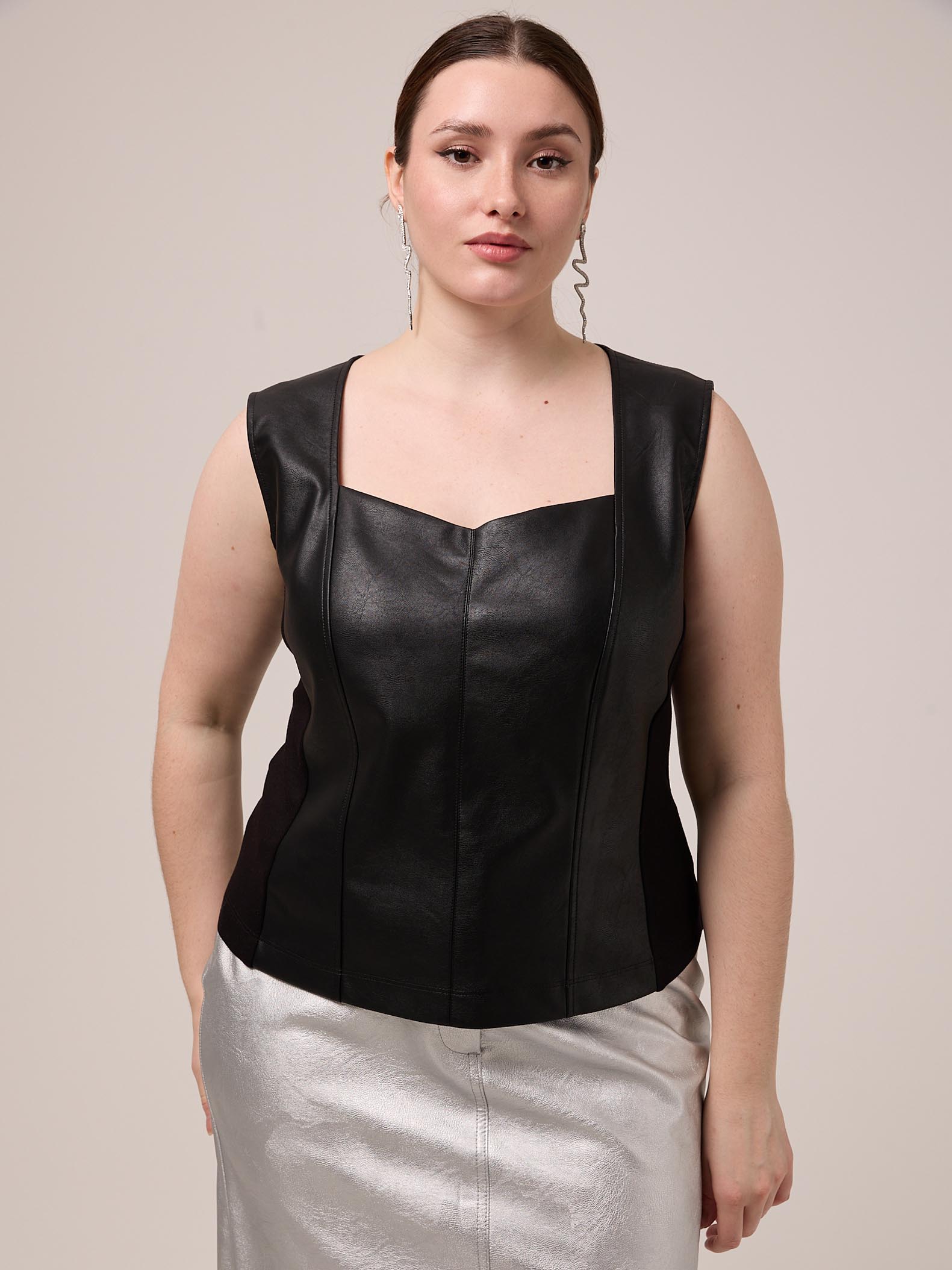 Топ прилегающего силуэта без рукавов. Вырез горловины глубокий, фигурный. Боковые детали выполнены из плотного эластичного трикотажа. Топ выполнен из искусственной кожи в черном цвете.