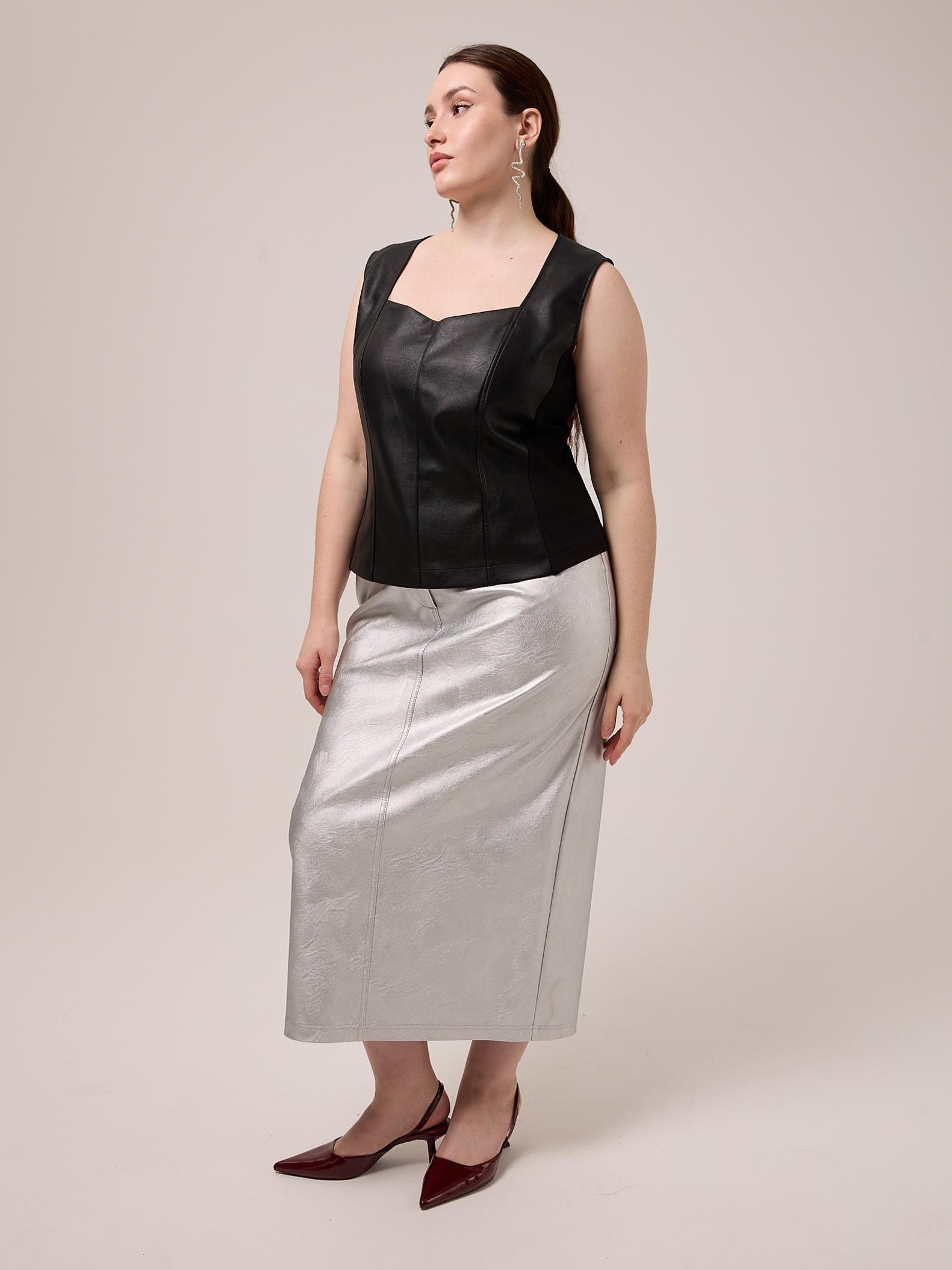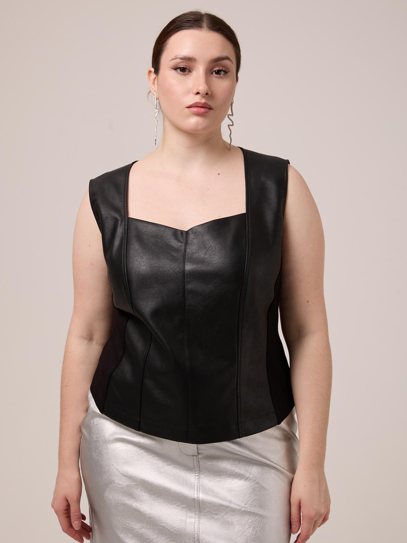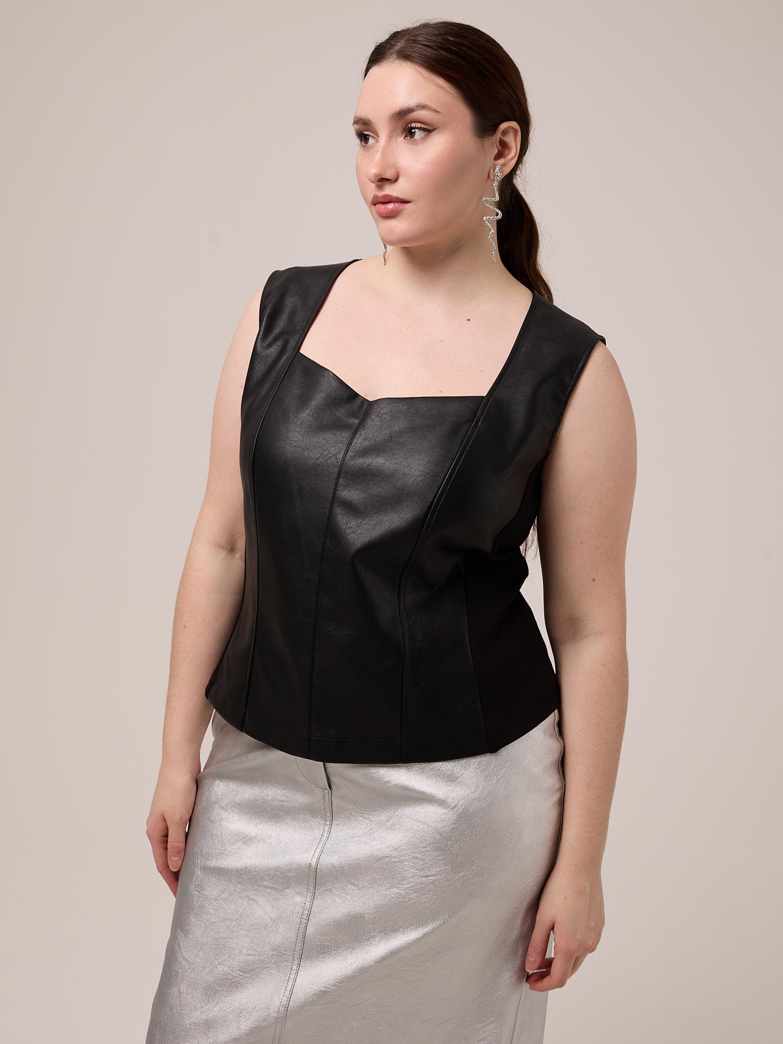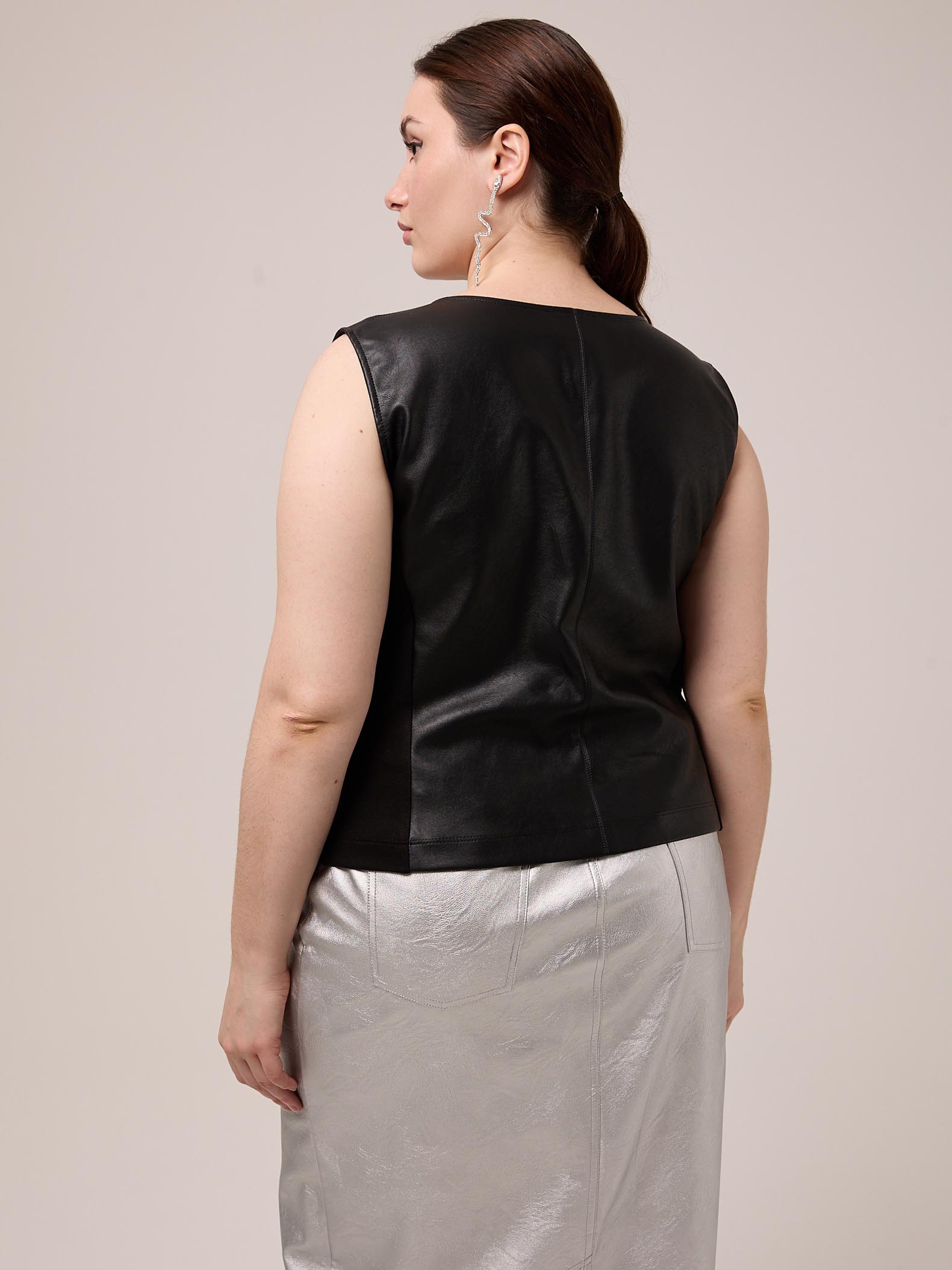 Топ прилегающего силуэта без рукавов. Вырез горловины глубокий, фигурный. Боковые детали выполнены из плотного эластичного трикотажа. Топ выполнен из искусственной кожи в черном цвете.