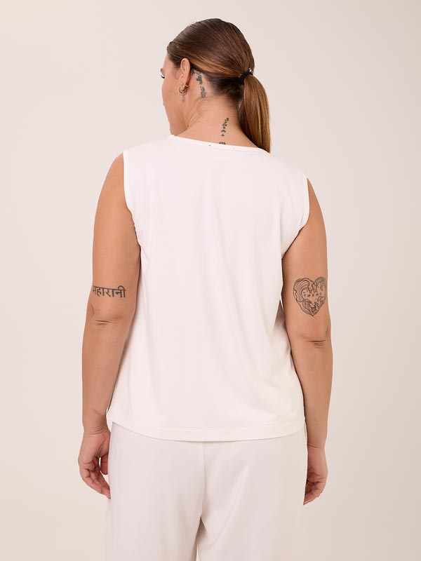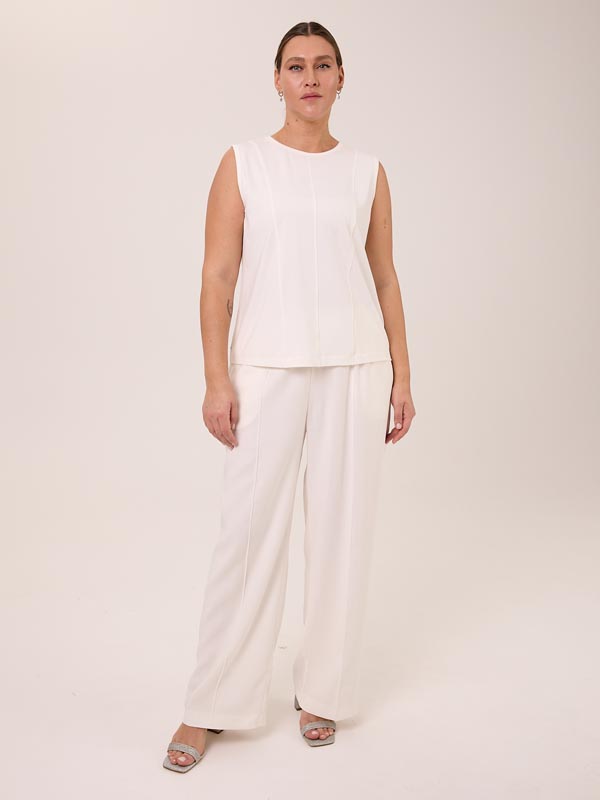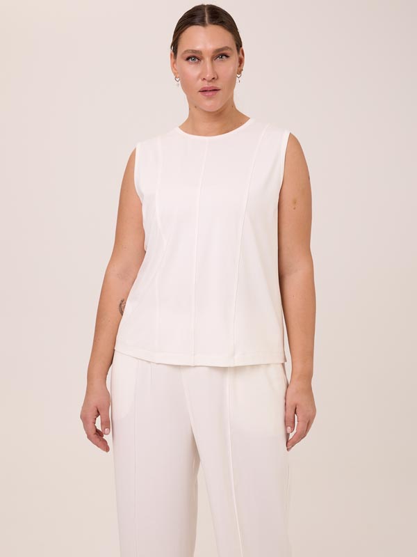 Прилегающий топ без рукавов. Вырез горловины круглый. Декоративно-конструктивные рельефы обеспечивают хорошую посадку.