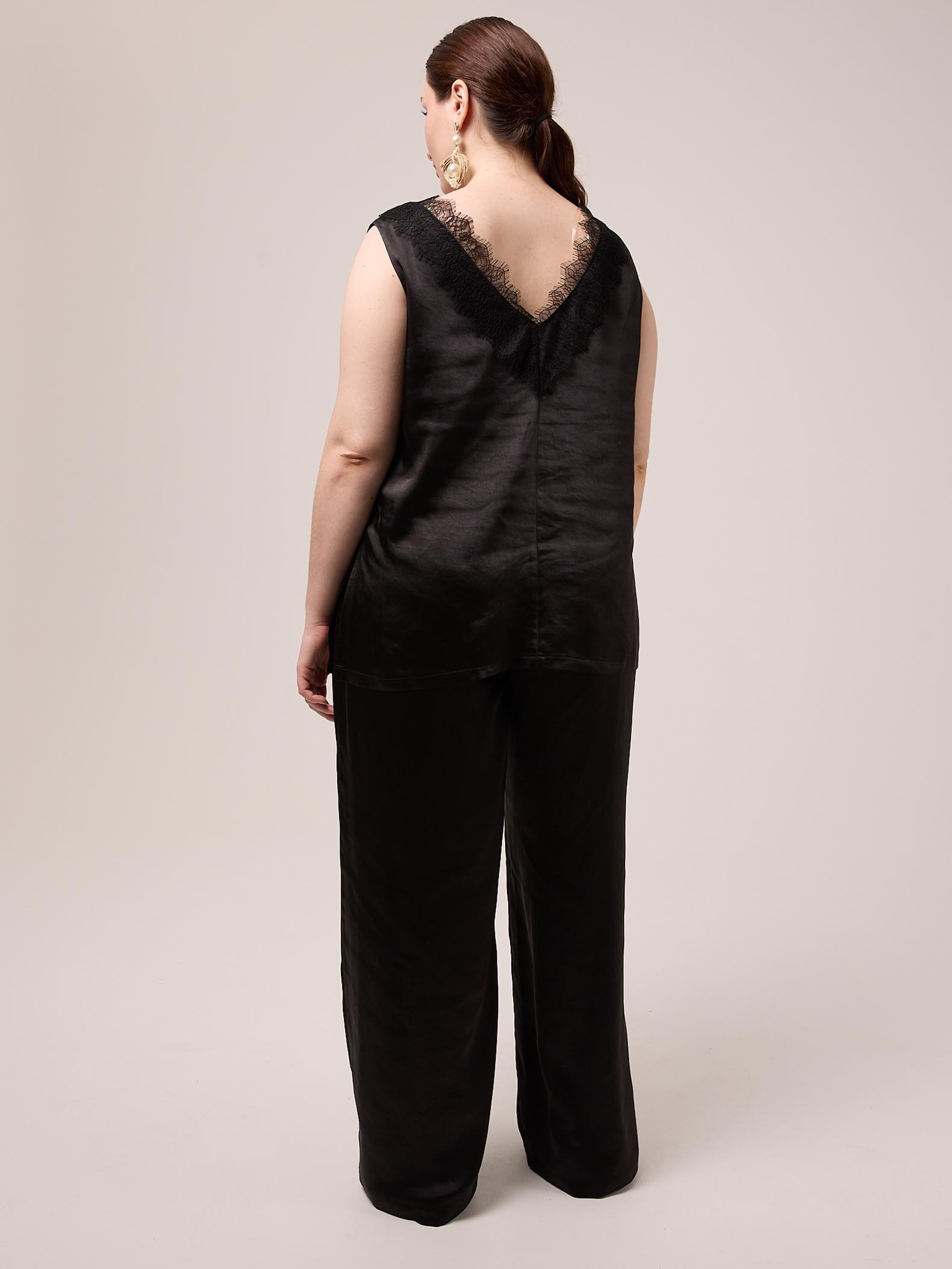 Топ-майка А-образного силуэта без рукавов. Вырез горловины V-образный, с отделкой кружевом. Нагрудная вытачка обеспечивает хорошую посадку. В боковых швах выполнены разрезы.