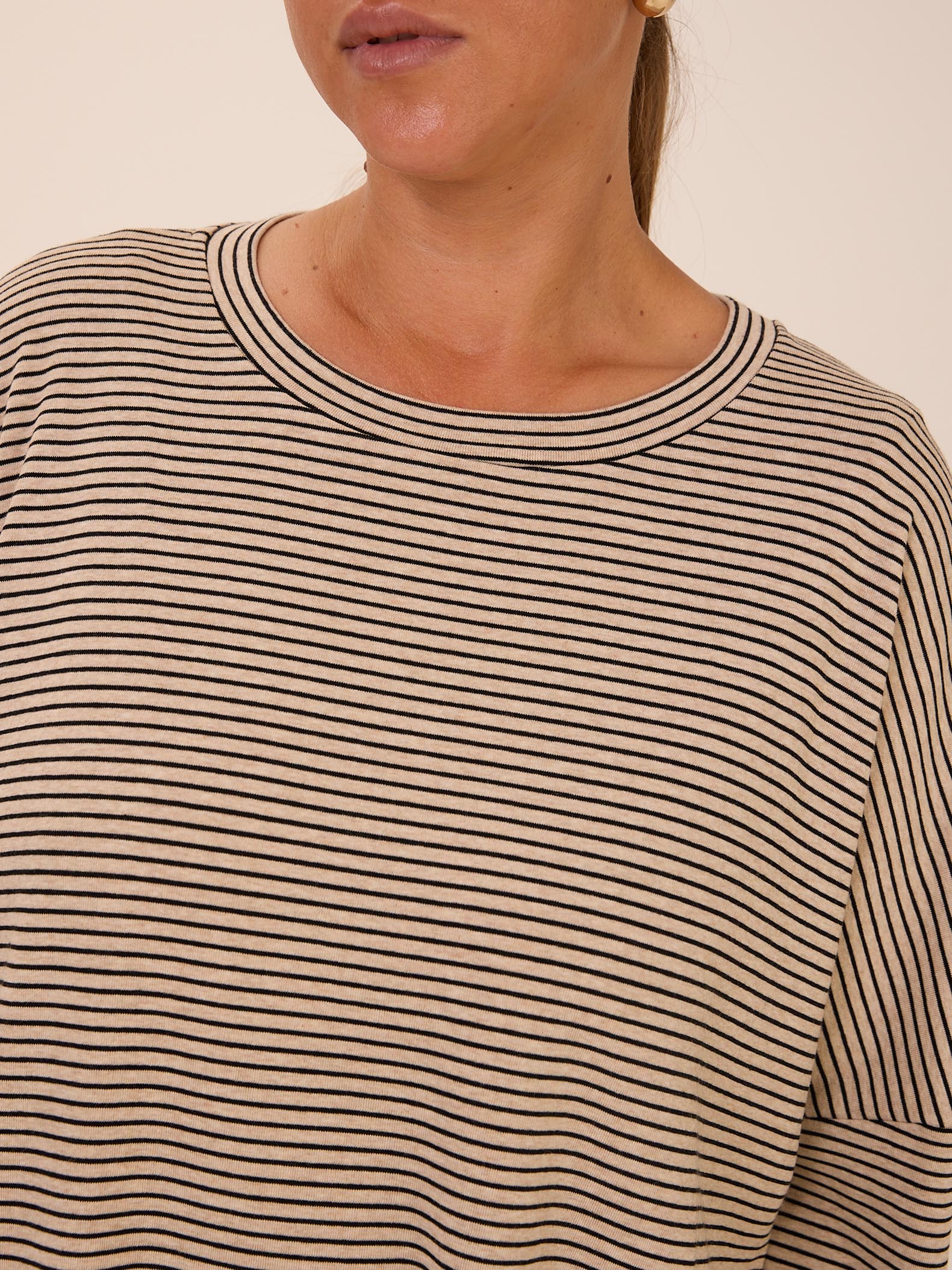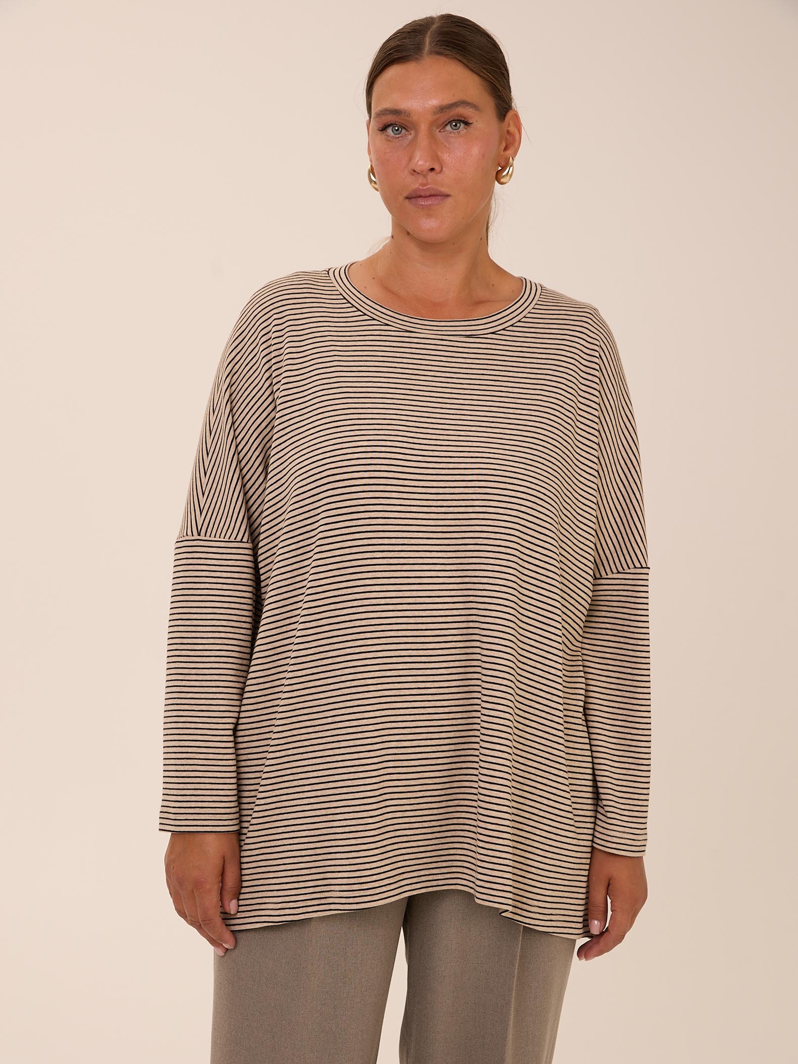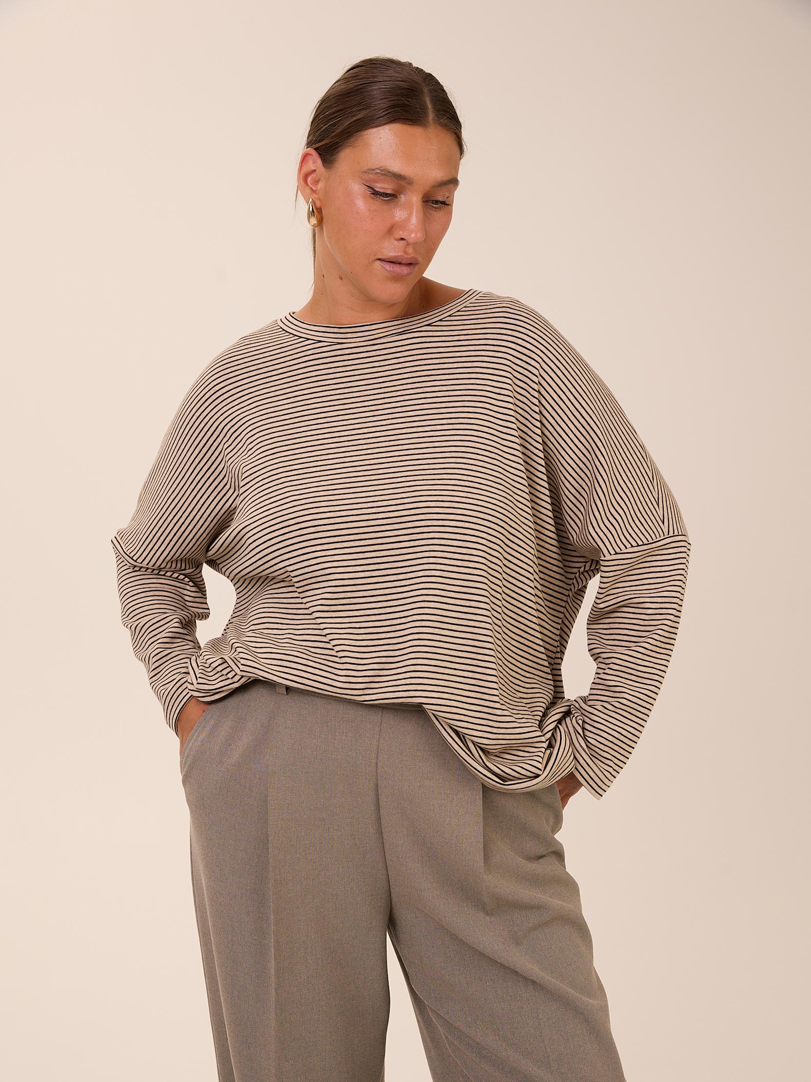 Объемный свитшот «овер» со спущенным плечевым поясом. Вырез горловины круглый. Низ изделия оформлен плавной линией. Выполнен из трикотажа с высоким содержанием хлопка в двух цветах: сером и бежевом.
