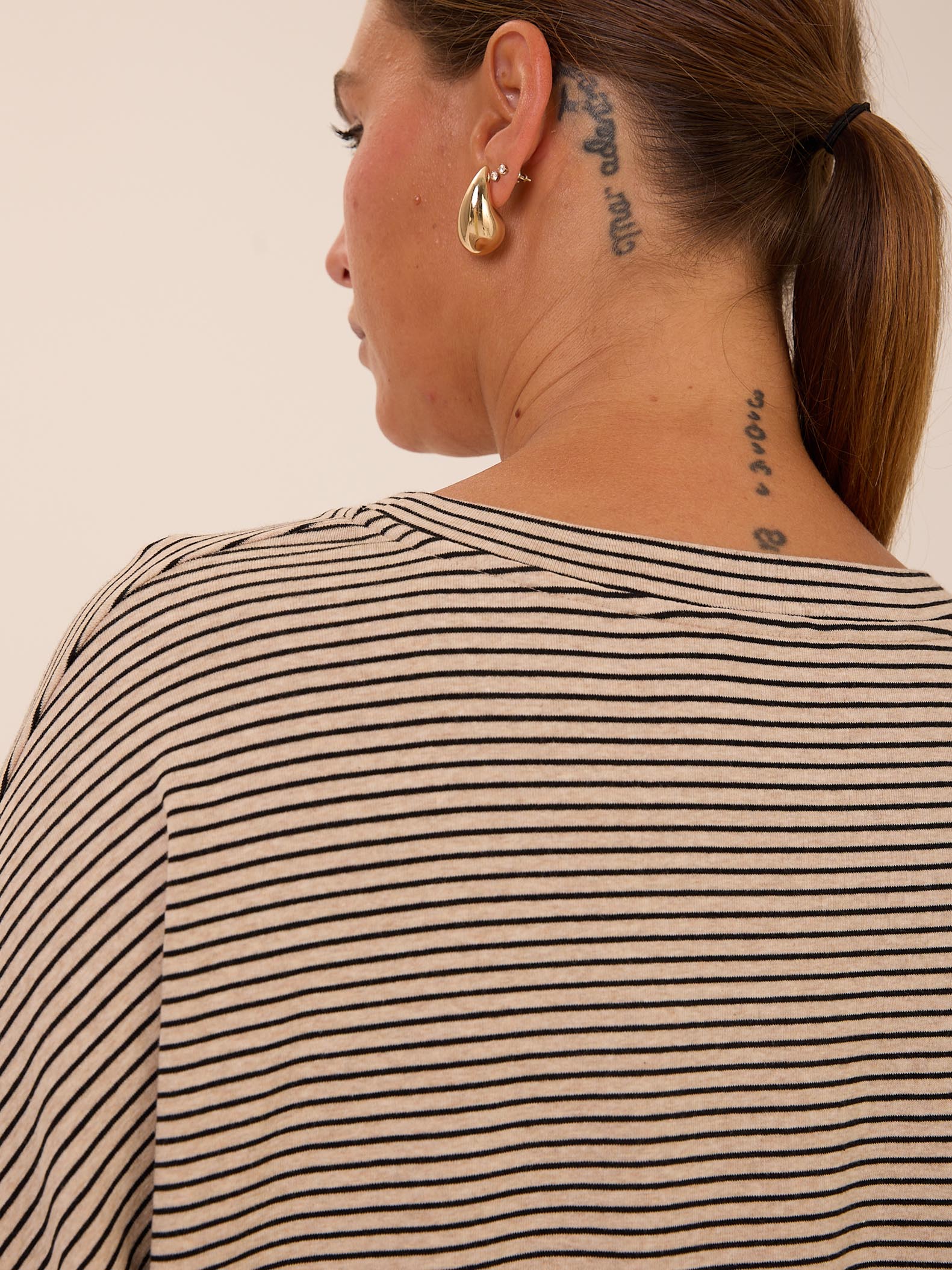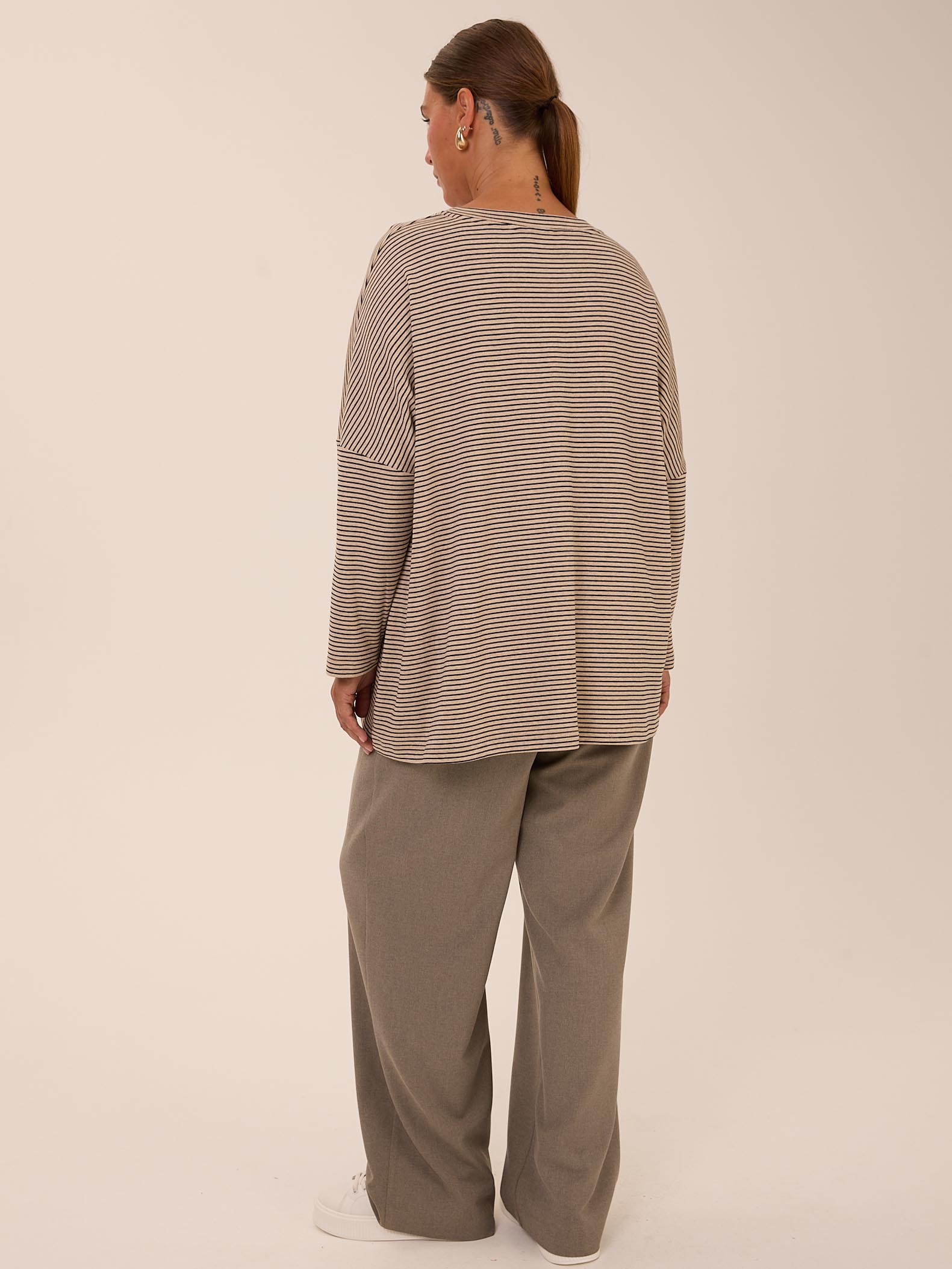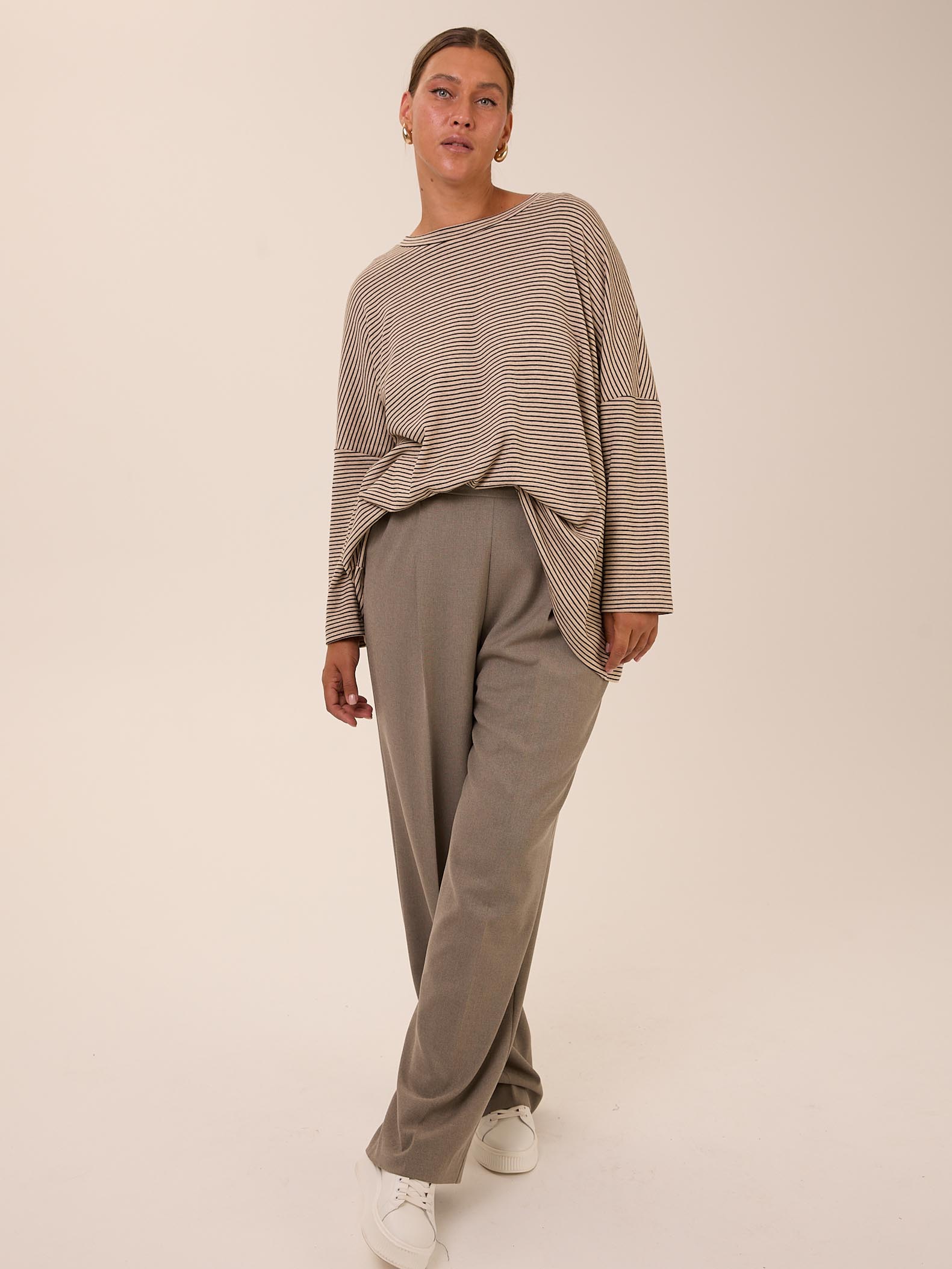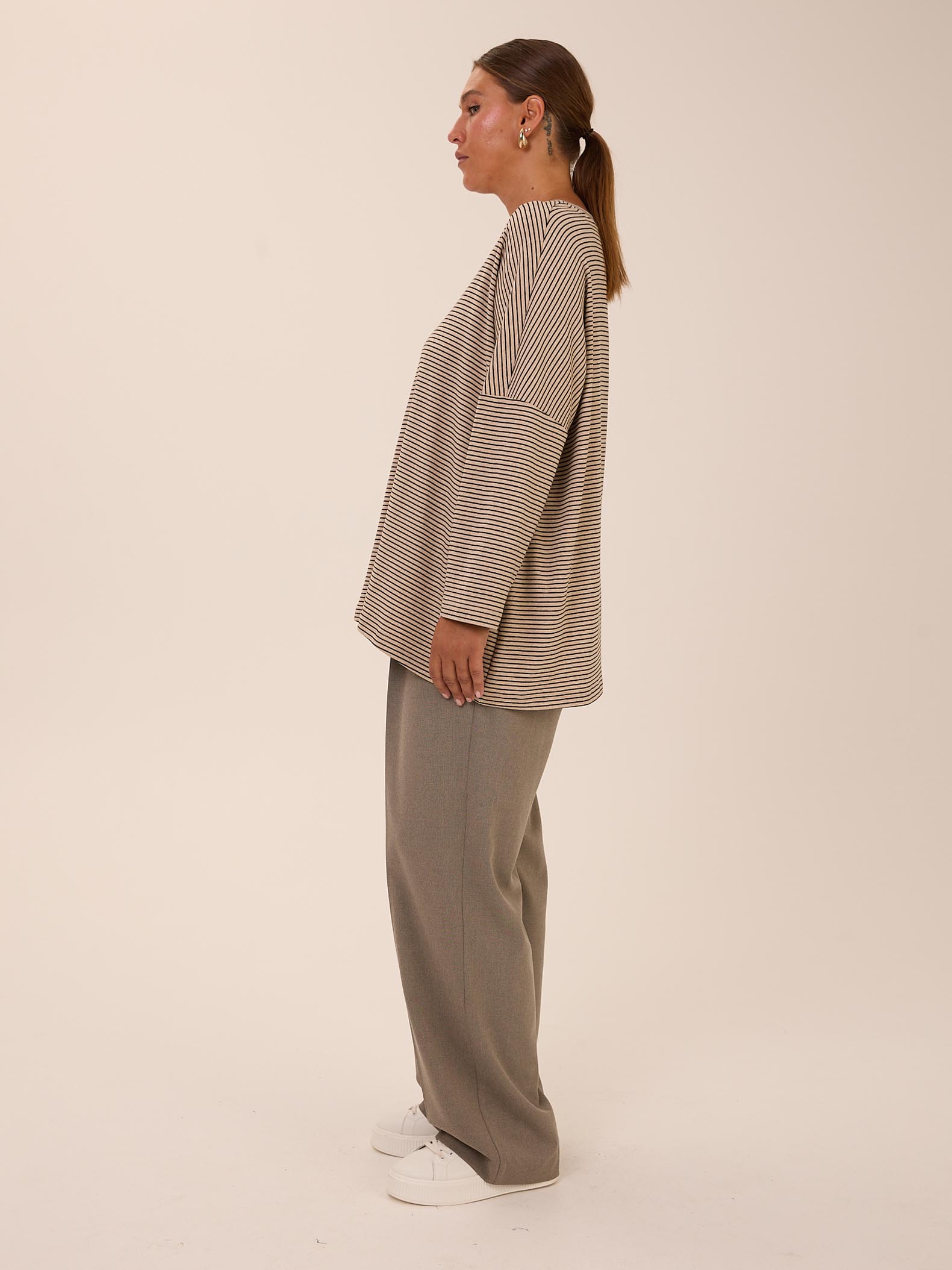 Объемный свитшот «овер» со спущенным плечевым поясом. Вырез горловины круглый. Низ изделия оформлен плавной линией. Выполнен из трикотажа с высоким содержанием хлопка в двух цветах: сером и бежевом.