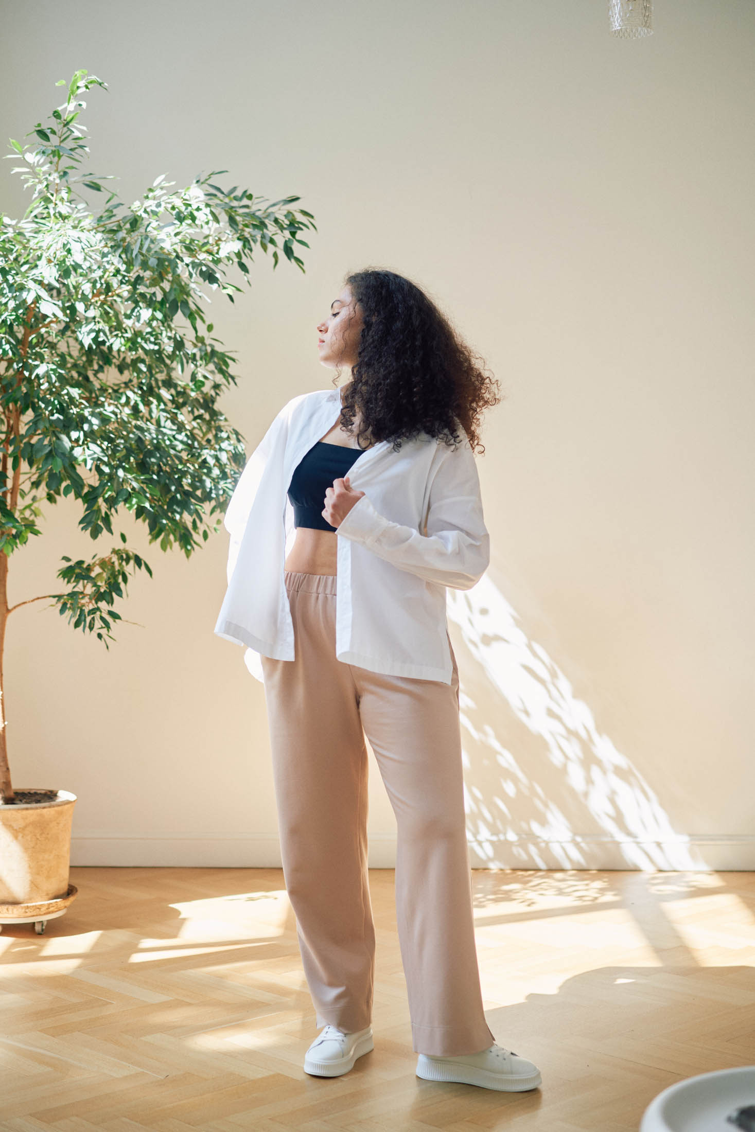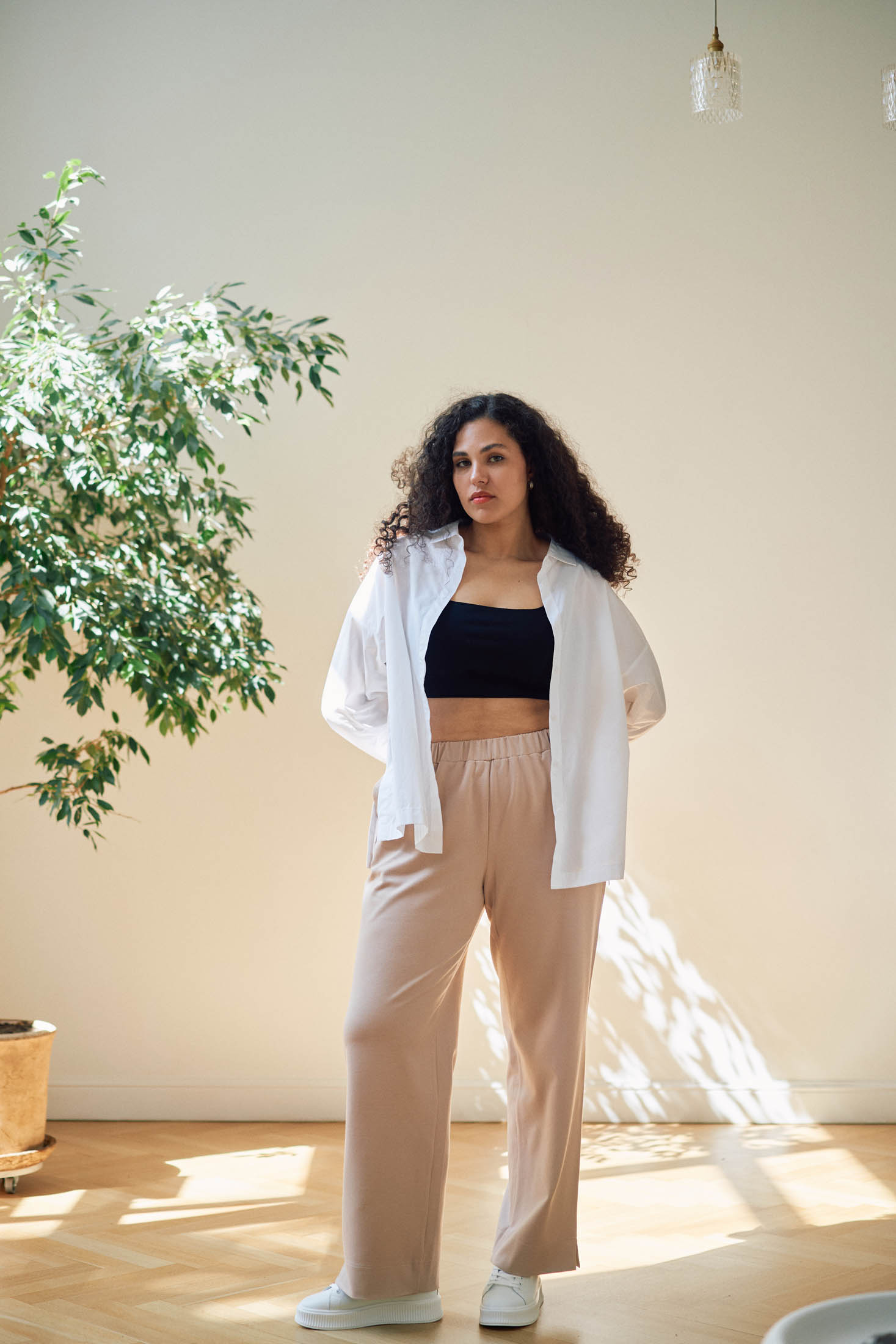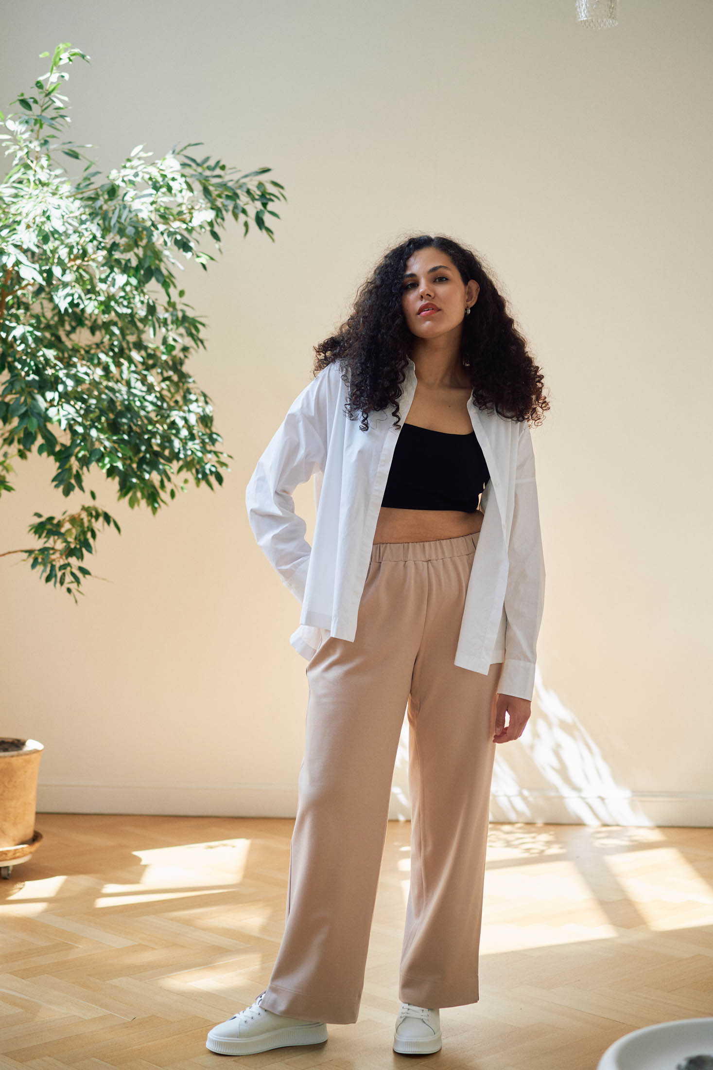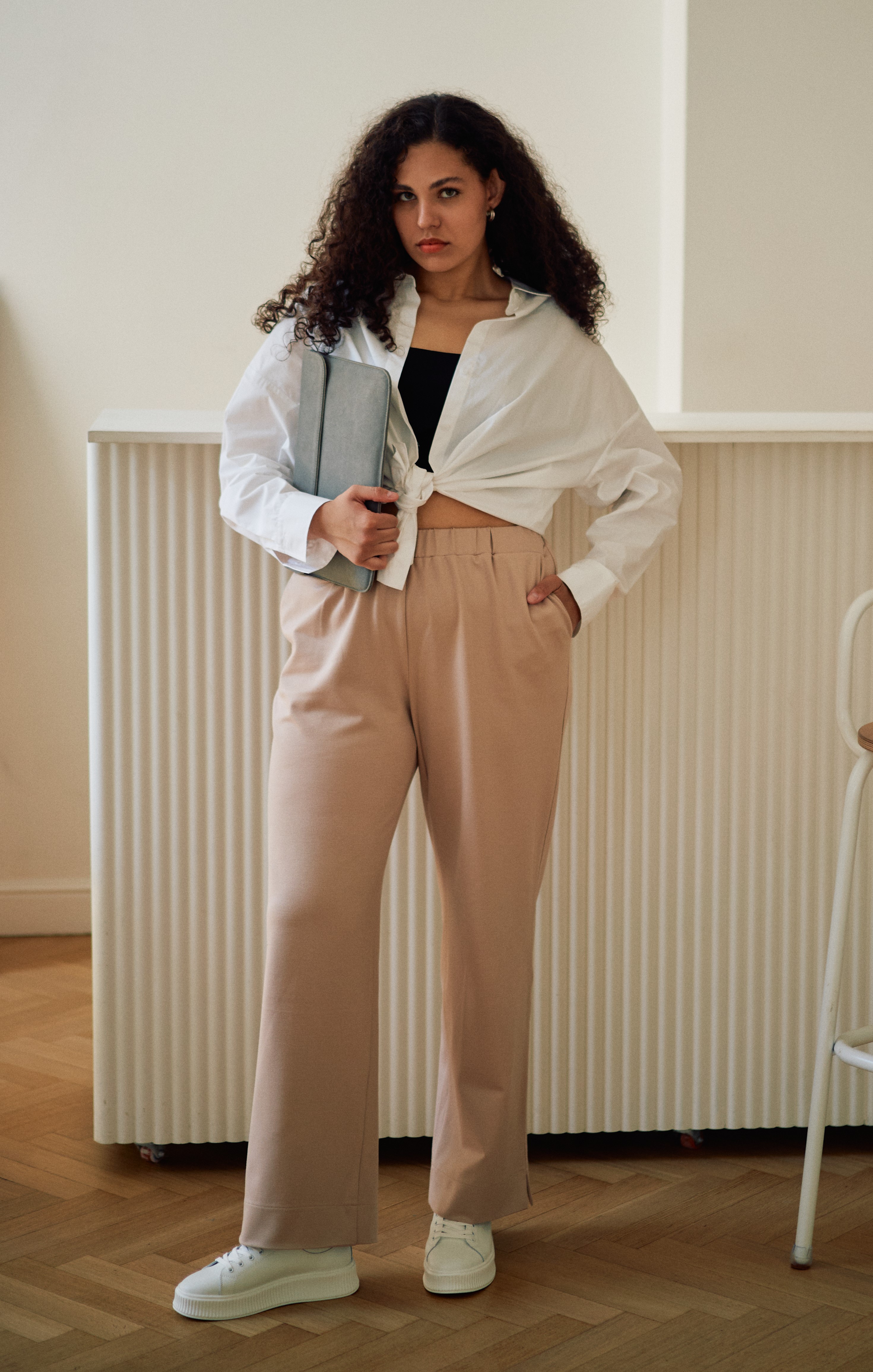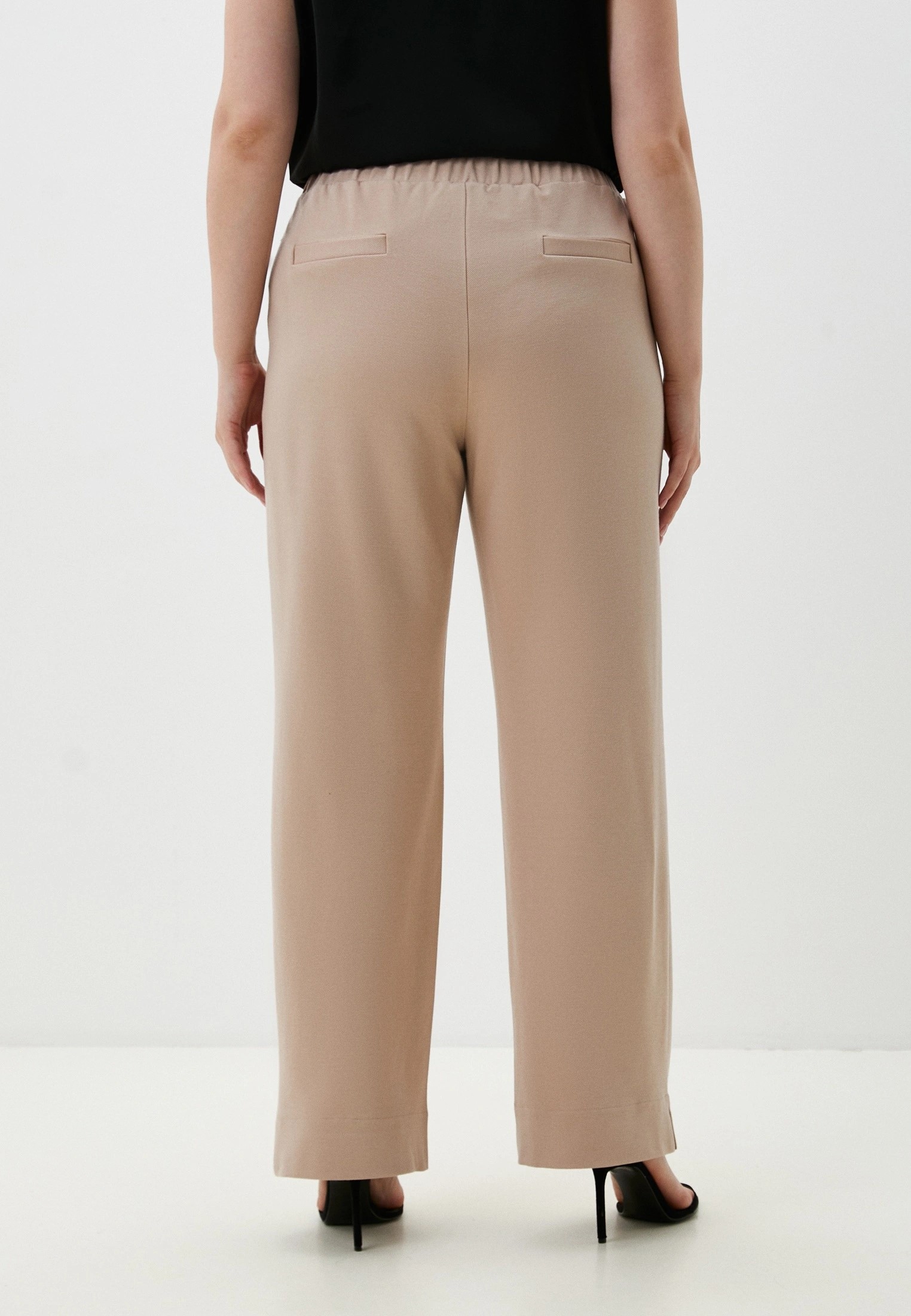 Брюки свободные, умеренно широкие по всей длине. Пояс притачной с эластичной тесьмой внутри, есть шнур. Боковые карманы на передних половинках, на задних половинках ложные карманы с листочками. Брюки выполнены из трикотажа с высоким содержанием вискозы  в трех цветах: молочный, голубой, бежевый.