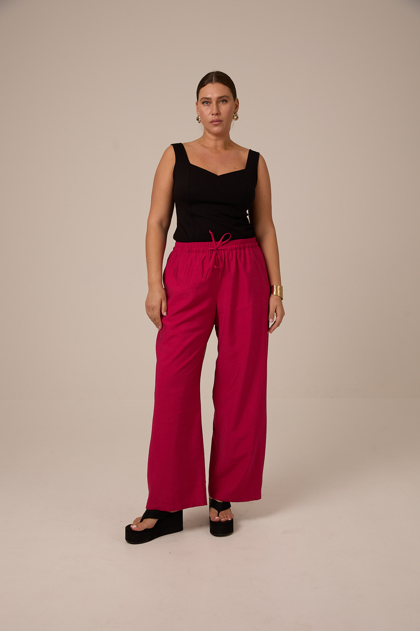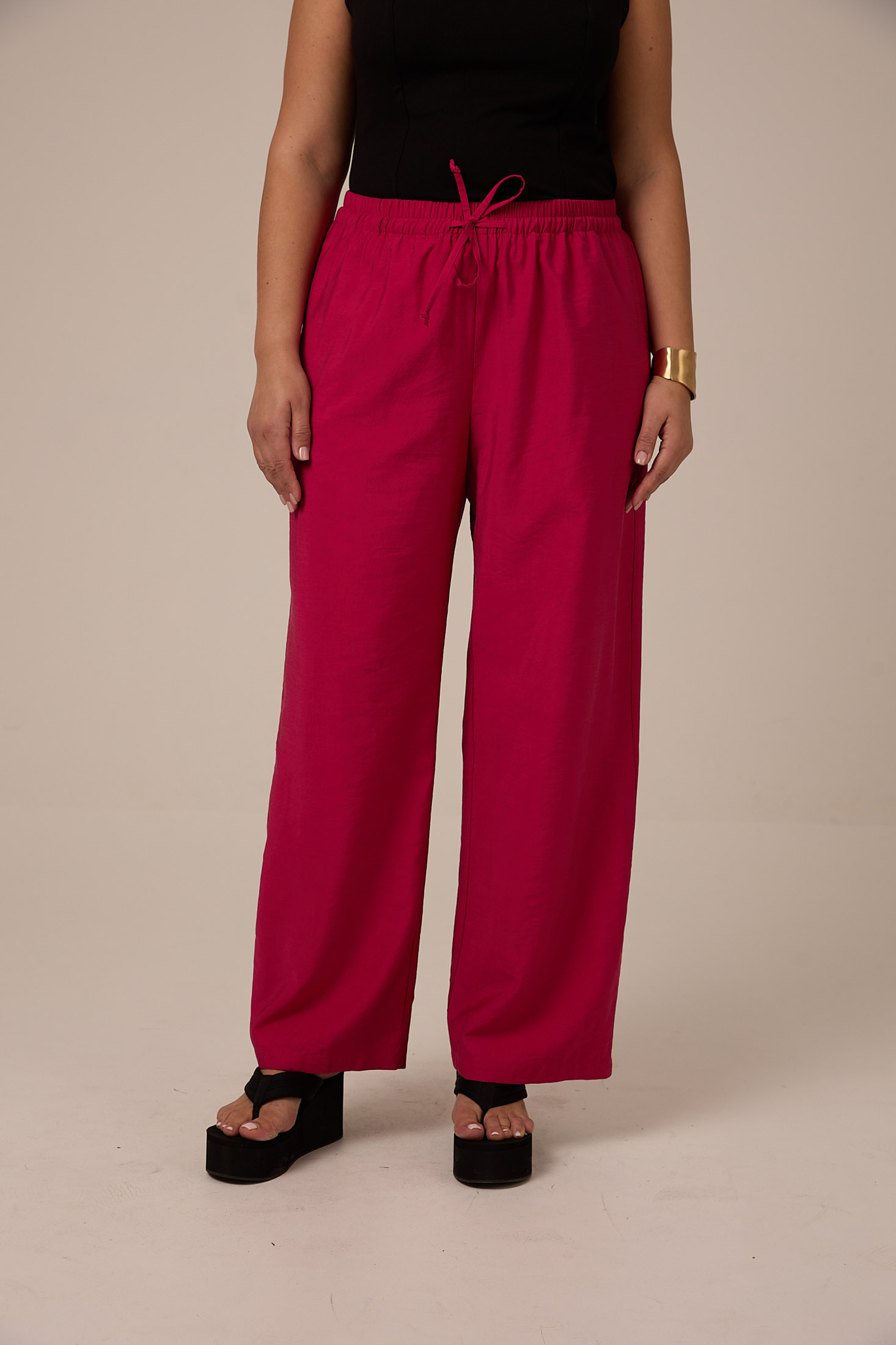 Брюки прямого кроя, умеренно широкие по всей длине. Пояс с эластичной тесьмой внутри и шнуром. Боковые карманы в швах на передних половинках. Выполнены из тенселя. Цвета: светло серый, темно серый и фуксия/