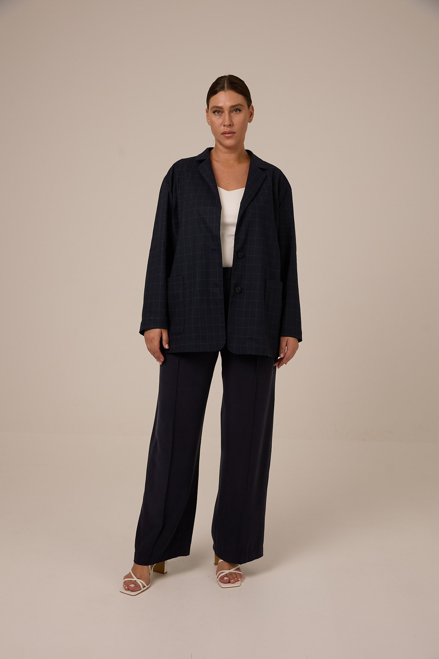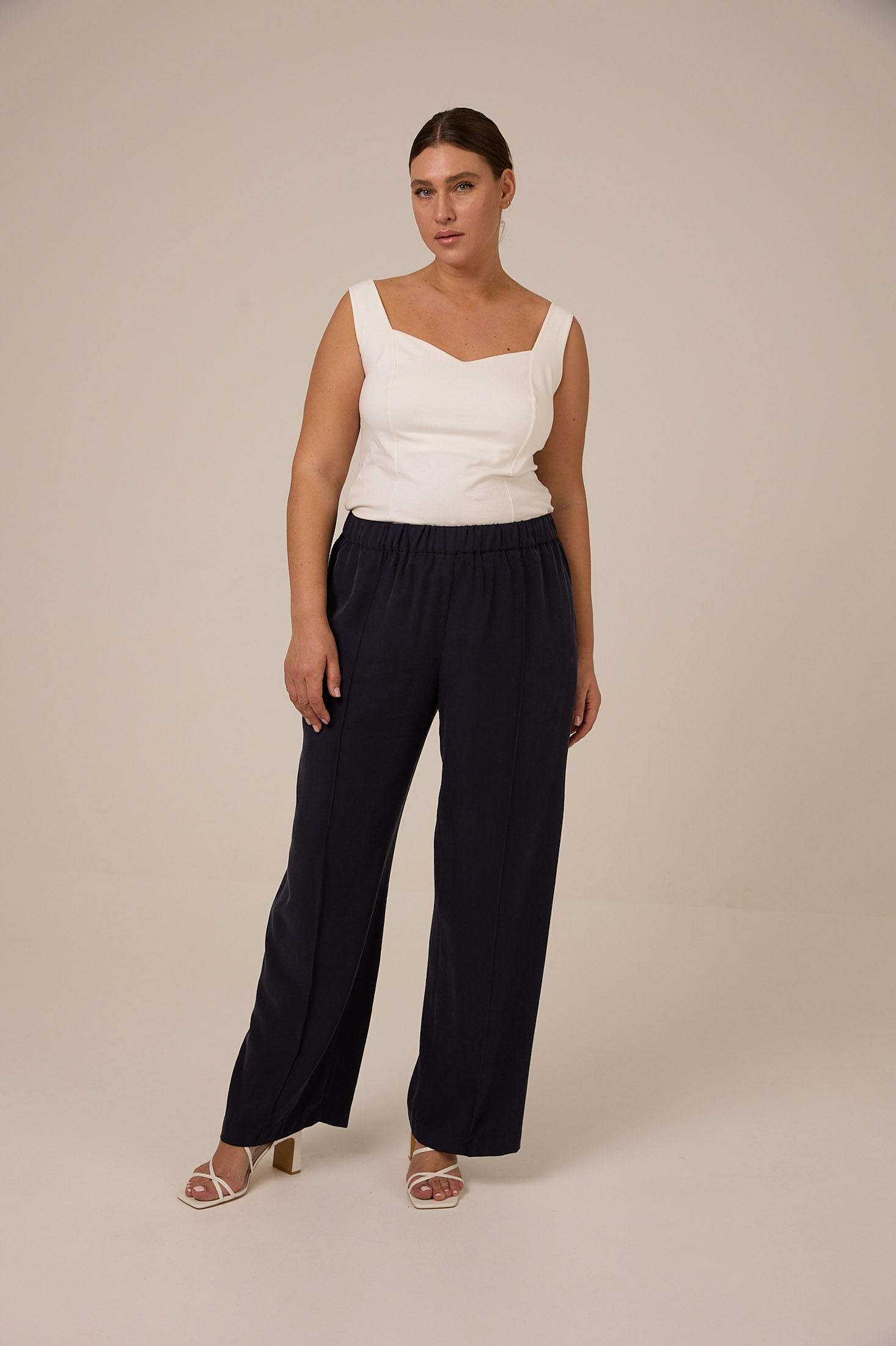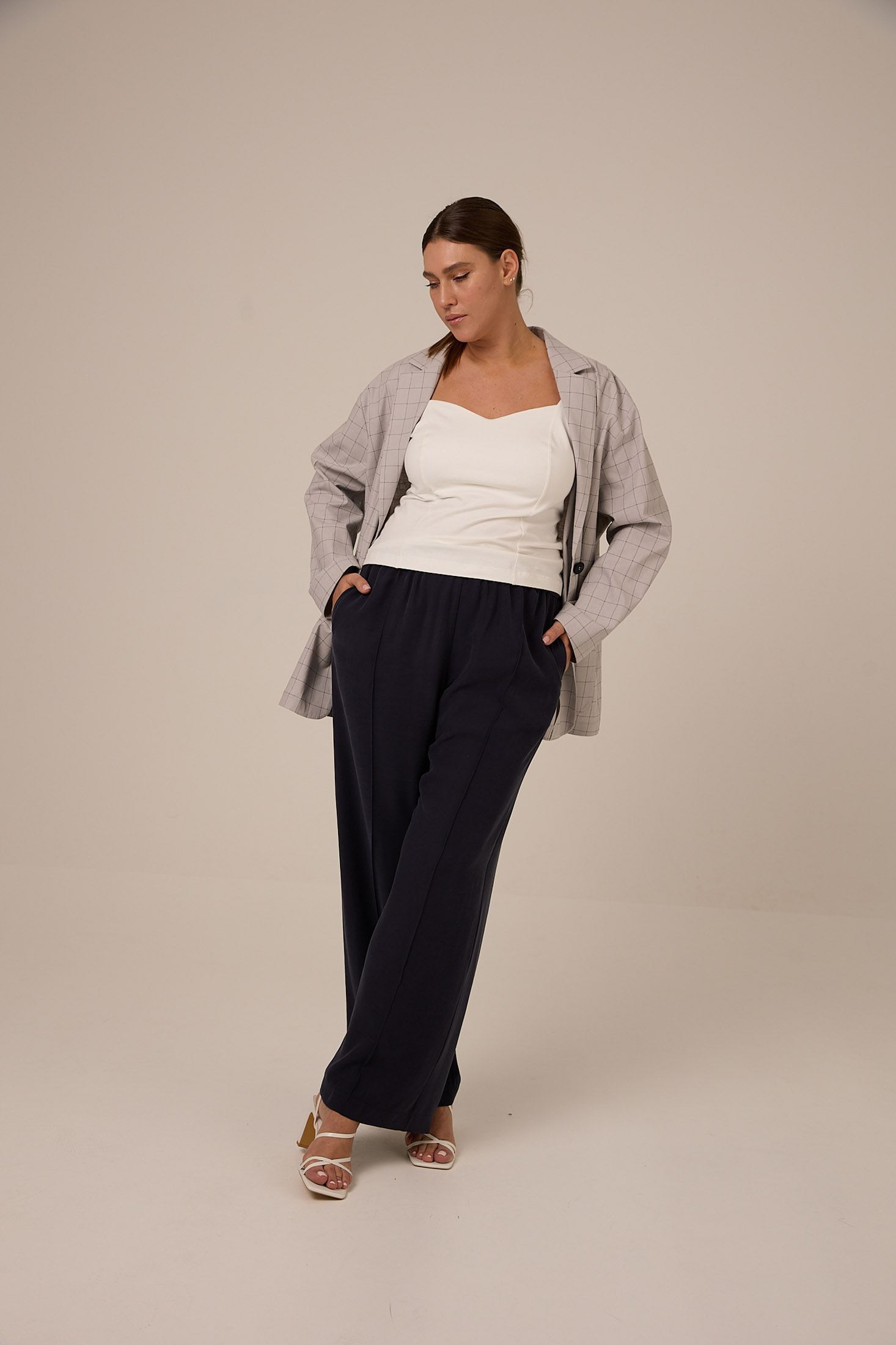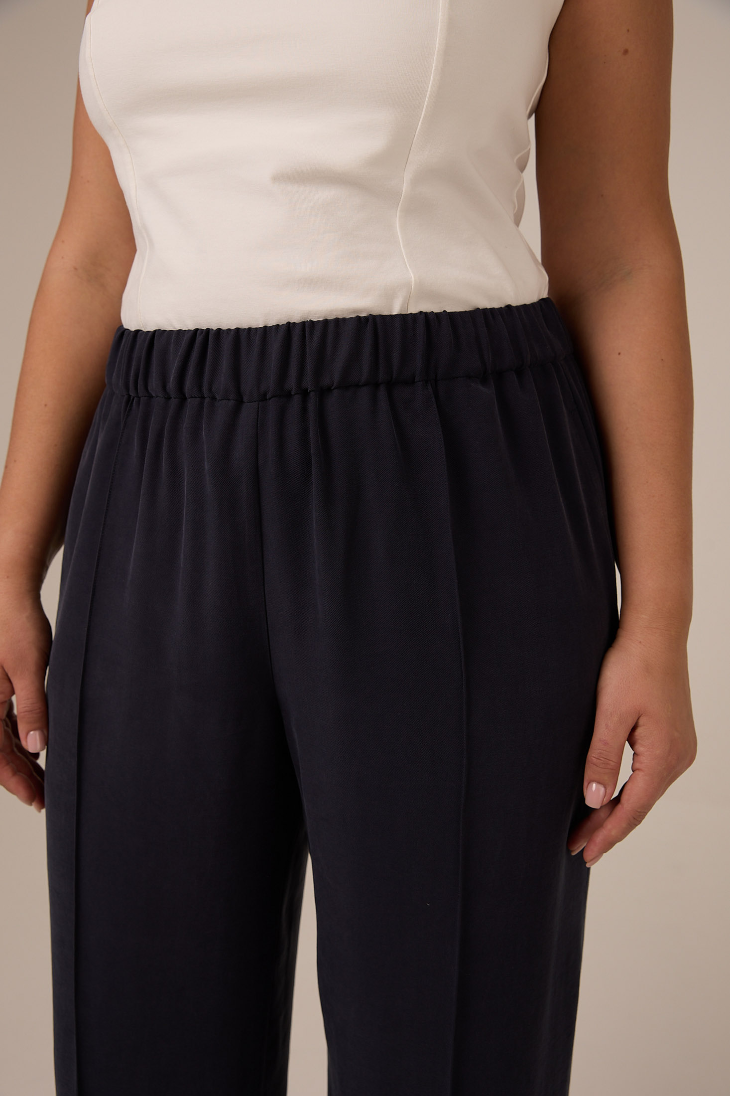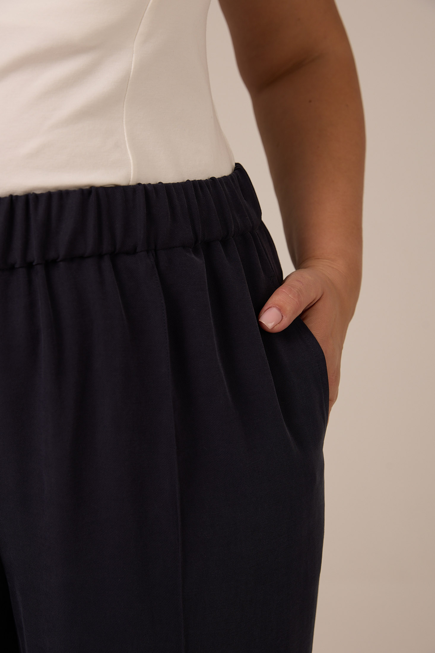 Брюки прямого кроя, умеренно широкие по всей длине, с отстроченными стрелками. Пояс с эластичной тесьмой внутри. Боковые карманы в швах на передних половинках. Выполнены из тенселя в черном, синем и молочном цветах.