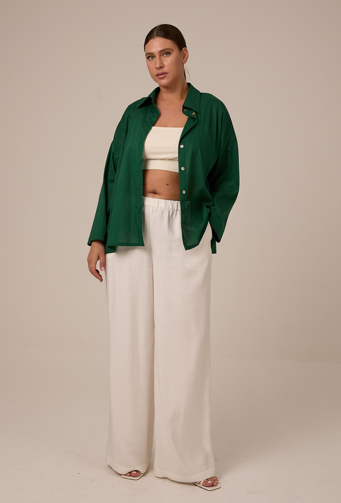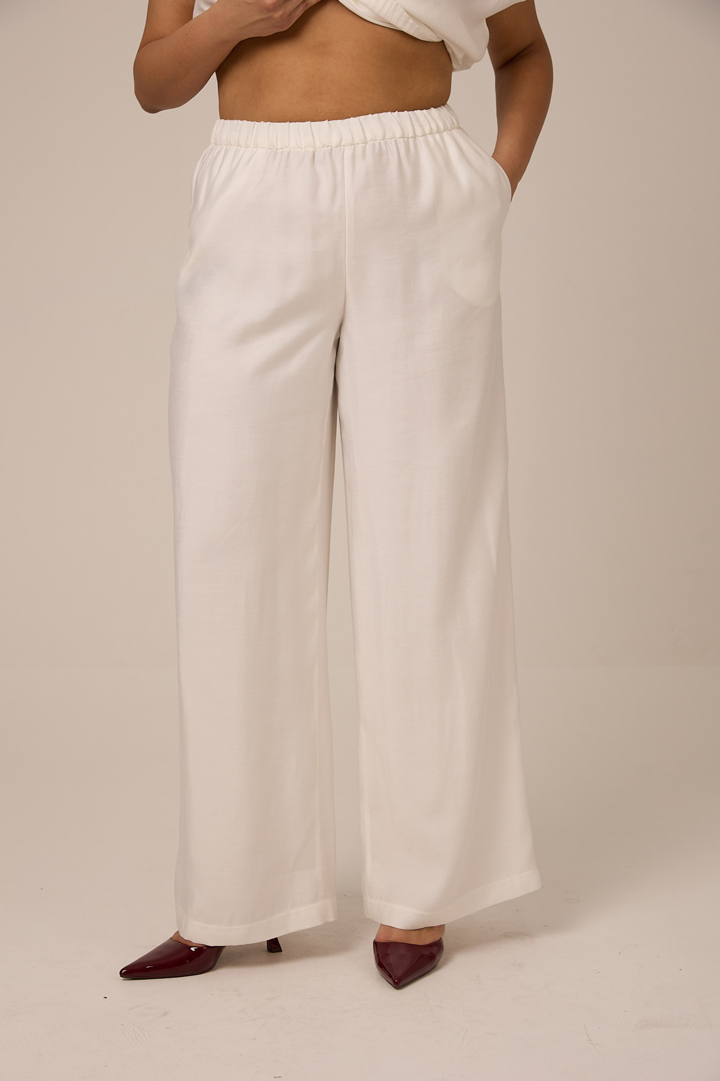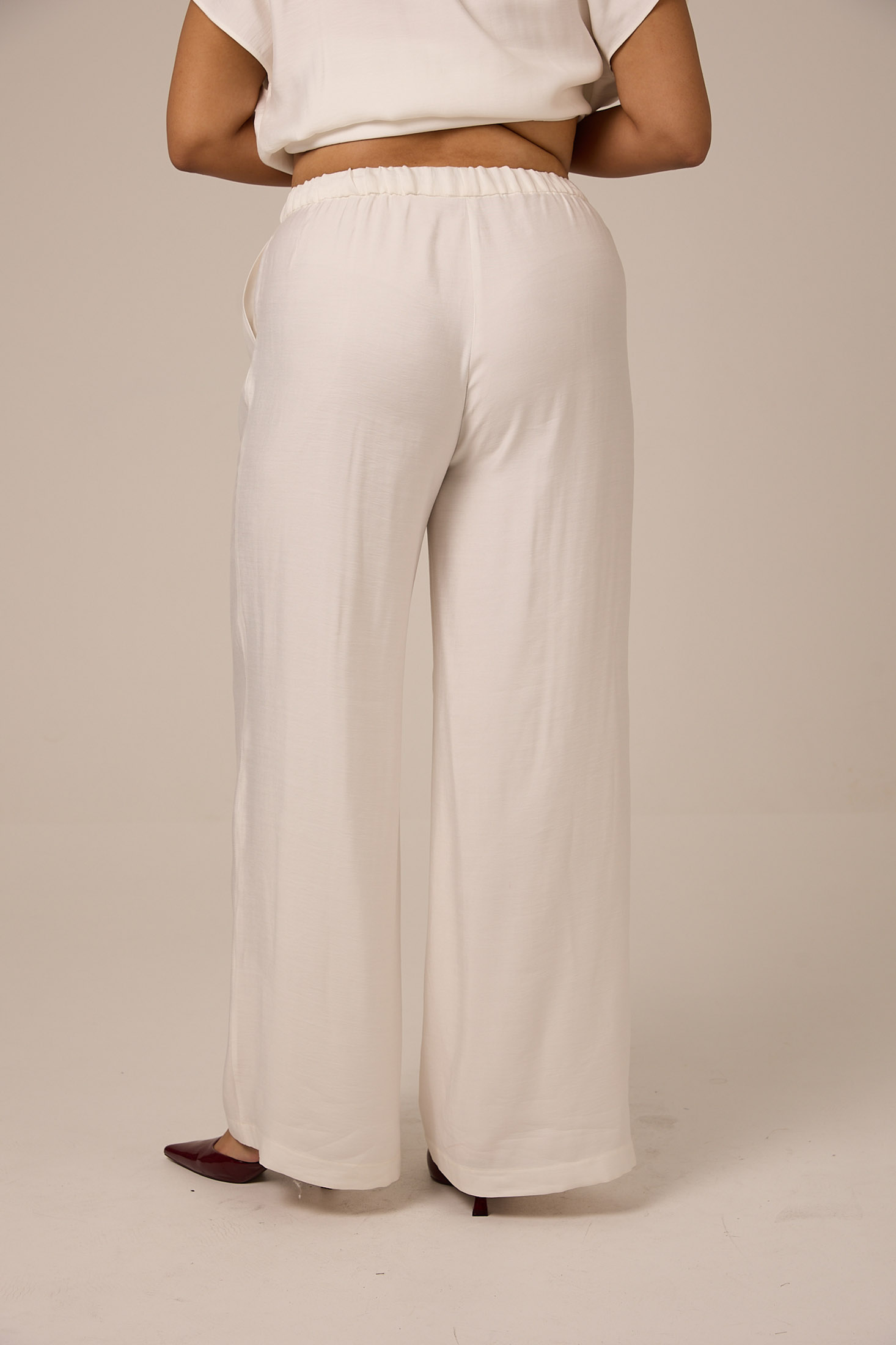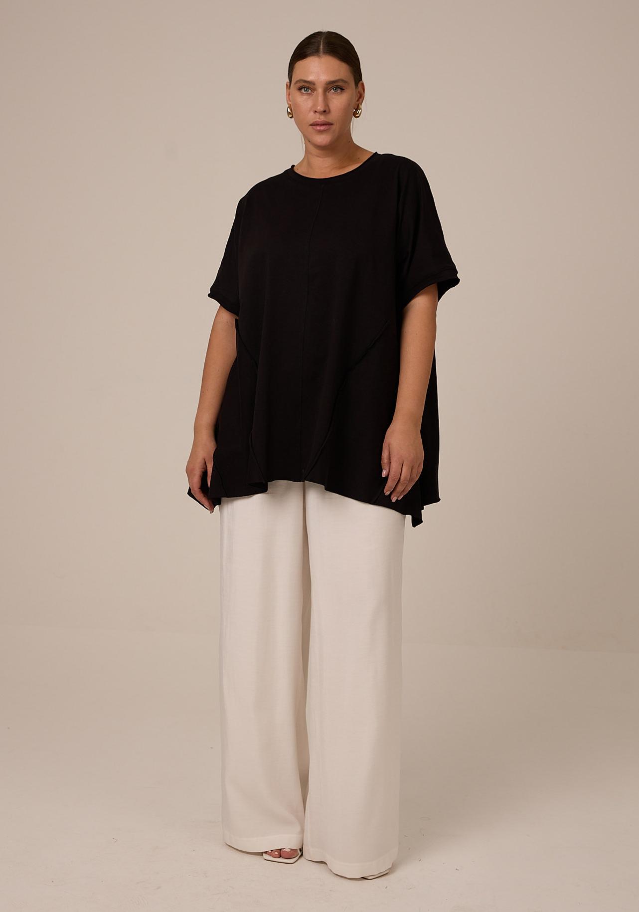 Брюки выполнены из струящейся вискозной ткани в двух цветах: черном и белом.