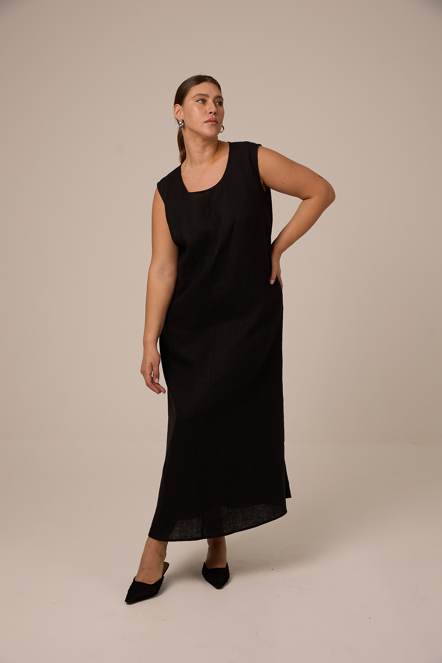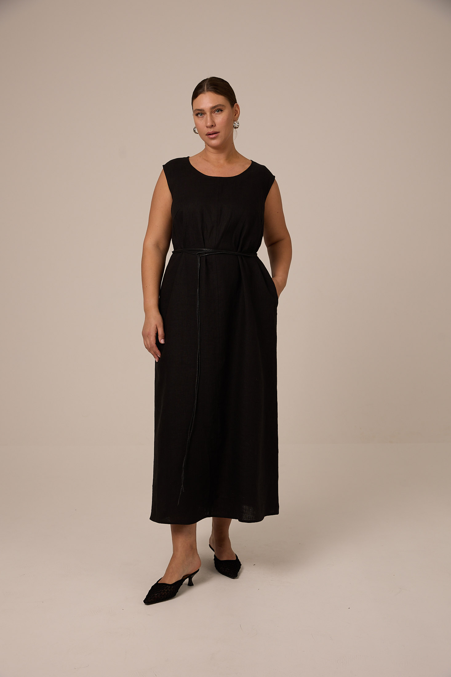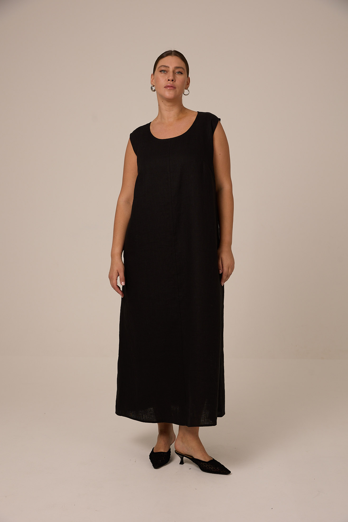 Платье длиной макси, А-образного силуэта, без рукавов. Вырез горловины круглый. Нагрудные вытачки обеспечивают хорошую посадку. По низу спинки широкий притачной волан. Платье из натурального 100% крэшированного льна (эффект жатки). Цвета черный, голубой, белый. Платье белого цвета выполнено на вискозной подкладке.