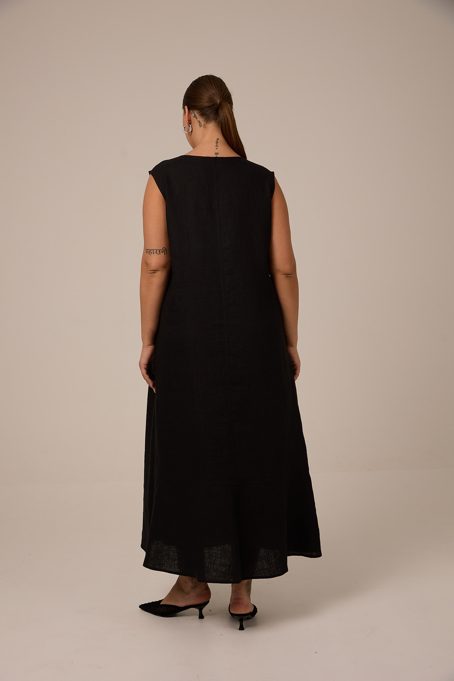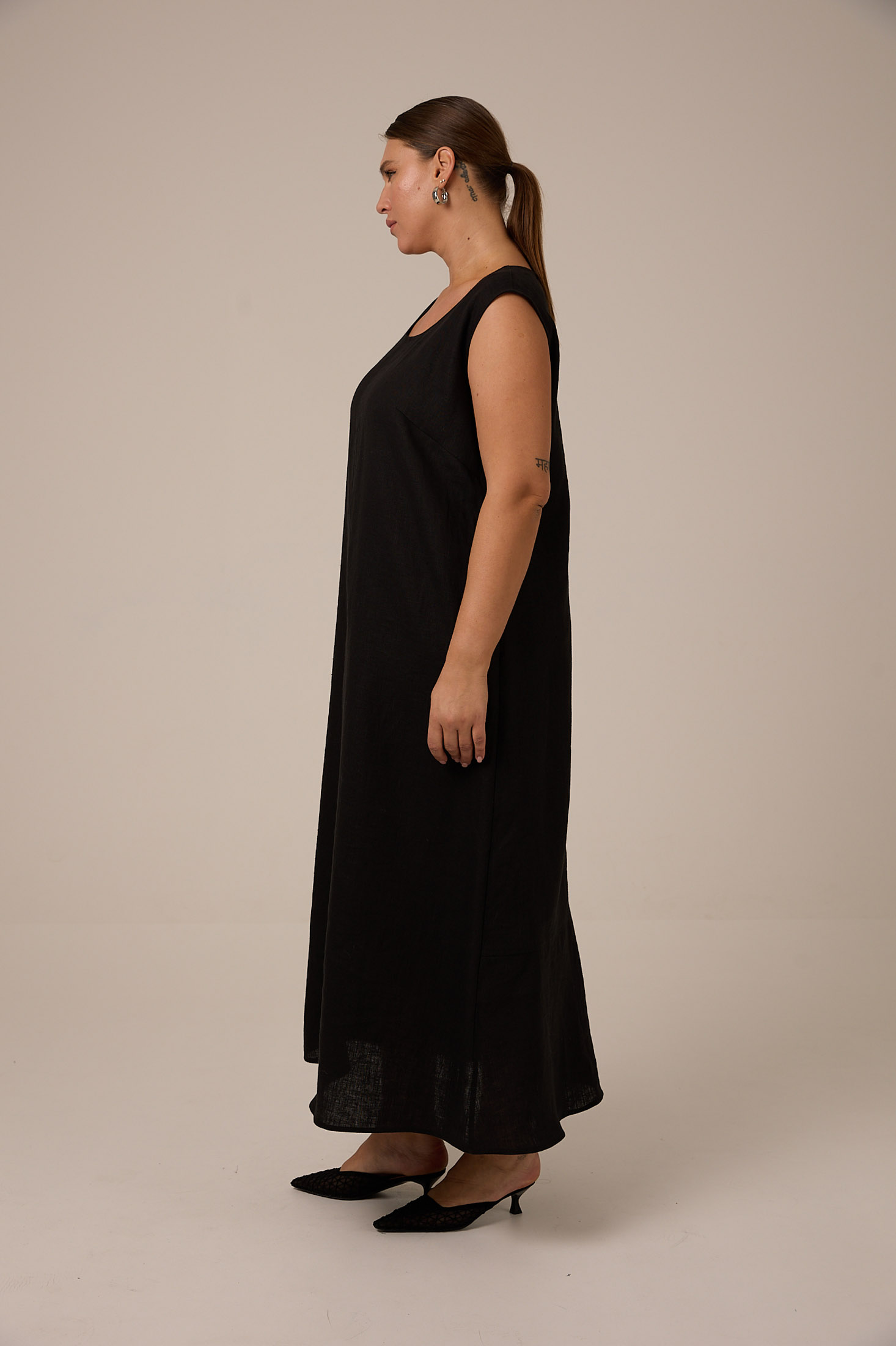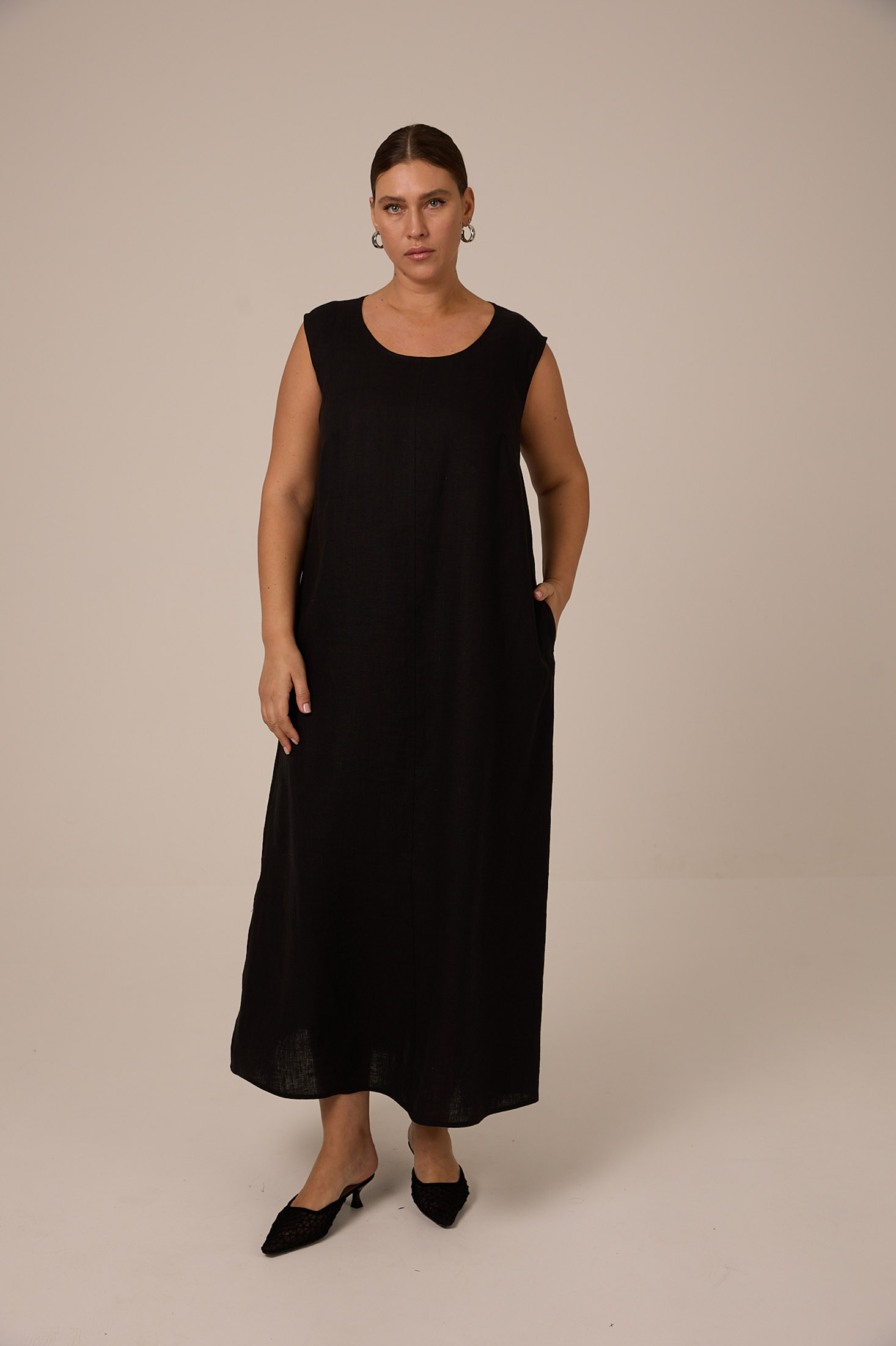 Платье длиной макси, А-образного силуэта, без рукавов. Вырез горловины круглый. Нагрудные вытачки обеспечивают хорошую посадку. По низу спинки широкий притачной волан. Платье из натурального 100% крэшированного льна (эффект жатки). Цвета черный, голубой, белый. Платье белого цвета выполнено на вискозной подкладке.