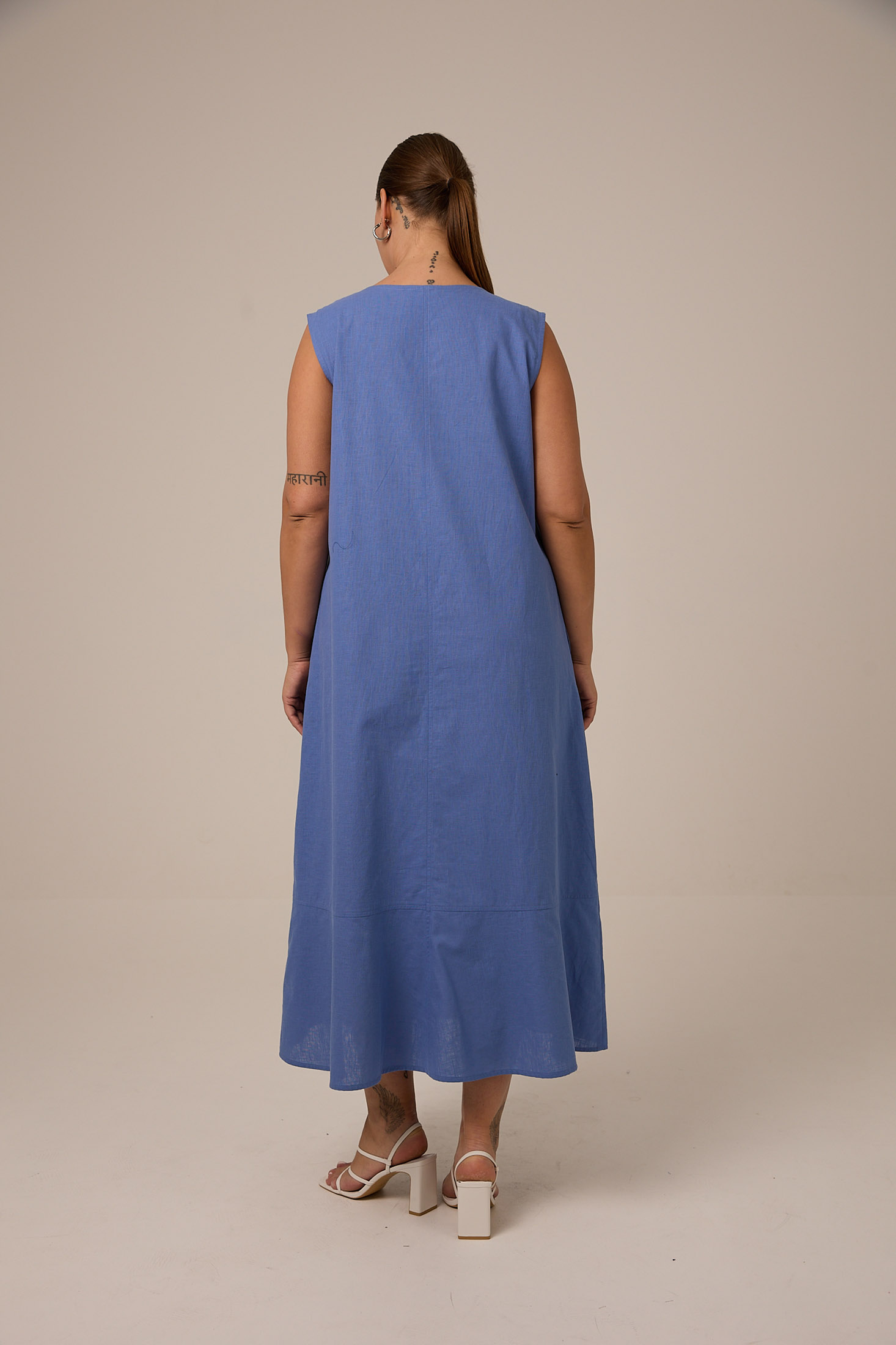 Платье длиной макси, А-образного силуэта, без рукавов. Вырез горловины круглый. Нагрудные вытачки обеспечивают хорошую посадку. По низу спинки широкий притачной волан. Платье из натурального 100% крэшированного льна (эффект жатки). Цвета черный, голубой, белый. Платье белого цвета выполнено на вискозной подкладке.